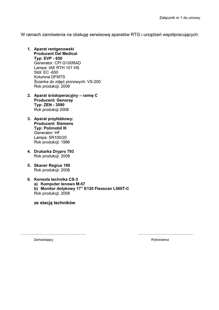 Załącznik nr 1 do umowy W ramach zamówienia na obsługę serwisową aparatów RTG i urządzeń współpracujących: 1. Aparat rentgenowski Producent Del Medical Typ: EVP - 650 Generator: CPI G100RAD Lampa: IAE RTH 101 HS Stół: EC -650 Kolumna DFMTS Ścianka do zdjęć pionowych: VS-200 Rok produkcji: 2008 2. Aparat śródoperacyjny – ramię C Producent: Genoray Typ: ZEN - 3090 Rok produkcji 2008 3. Aparat przyłóżkowy: Producent: Siemens Typ: Polimobil III Generator: HF Lampa: SR100/20 Rok produkcji: 1996 4. Drukarka Drypro 793 Rok produkcji: 2008 5. Skaner Regius 190 Rok produkcji: 2008 6. Konsola technika CS-3 a) Komputer lenowo M-57 b) Monitor dotykowy 17” E120 Flexscan L560T-C Rok produkcji: 2008 ze stacją techników ....................................................................... Zamawiający ............................................................ Wykonawca