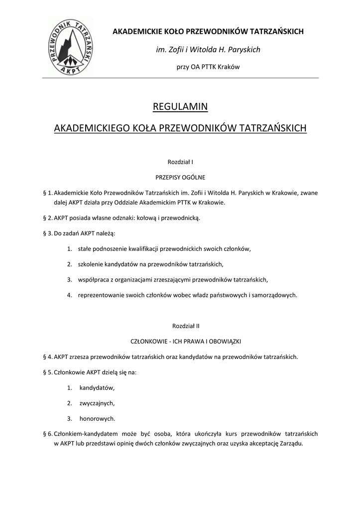 AKADEMICKIE KOŁO PRZEWODNIKÓW TATRZAŃSKICH im. Zofii i Witolda H. Paryskich przy OA PTTK Kraków Siedziba: COTG PTTK 31-010 Kraków ul.Jagiellońska 6 tel.: 0-12- 422-28-40; REGULAMIN www.akpt.pl AKADEMICKIEGO KOŁA PRZEWODNIKÓW TATRZAŃSKICH Rozdział I PRZEPISY OGÓLNE § 1. Akademickie Koło Przewodników Tatrzańskich im. Zofii i Witolda H. Paryskich w Krakowie, zwane dalej AKPT działa przy Oddziale Akademickim PTTK w Krakowie. § 2. AKPT posiada własne odznaki: kołową i przewodnicką. § 3. Do zadań AKPT należą: 1. stałe podnoszenie kwalifikacji przewodnickich swoich członków, 2. szkolenie kandydatów na przewodników tatrzańskich, 3. współpraca z organizacjami zrzeszającymi przewodników tatrzańskich, 4. reprezentowanie swoich członków wobec władz państwowych i samorządowych. Rozdział II CZŁONKOWIE - ICH PRAWA I OBOWIĄZKI § 4. AKPT zrzesza przewodników tatrzańskich oraz kandydatów na przewodników tatrzańskich. § 5. Członkowie AKPT dzielą się na: 1. kandydatów, 2. zwyczajnych, 3. honorowych. § 6. Członkiem-kandydatem może być osoba, która ukończyła kurs przewodników tatrzańskich w AKPT lub przedstawi opinię dwóch członków zwyczajnych oraz uzyska akceptację Zarządu. § 7. Członkiem zwyczajnym może zostać : 1. członek-kandydat AKPT po uzyskaniu uprawnień przewodnika tatrzańskiego, 2. osoba posiadająca uprawnienia przewodnika tatrzańskiego, która przedstawi opinię dwóch członków zwyczajnych oraz uzyska akceptację Zarządu. § 8. Członkiem honorowym może zostać osoba wybitnie zasłużona dla przewodnictwa lub AKPT. Godność członka honorowego nadaje Walne Zebranie AKPT. § 9. Członek-kandydat ma prawo: 1. wybierać władze AKPT, 2. korzystać ze środków AKPT, 3. brać czynny udział w działalności szkoleniowej AKPT, 4. zgłaszać wnioski dotyczące działalności AKPT, 5. brać udział w zebraniach Zarządu i Komisji Rewizyjnej AKPT, na których rozpatrywane są sprawy związane z jego osobą i działalnością, 6. noszenia odznaki kołowej AKPT. § 10. Członek zwyczajny i członek honorowy mają prawo: 1. wybierać i być wybieranym do władz AKPT, 2. korzystać ze środków AKPT, 3. brać czynny udział w działalności szkoleniowej AKPT, 4. zgłaszać wnioski dotyczące działalności AKPT, 5. brać udział w zebraniach Zarządu i Komisji Rewizyjnej AKPT, na których rozpatrywane są sprawy związane z jego osobą i działalnością, 6. noszenia odznaki kołowej i przewodnickiej AKPT. § 11. Członek-kandydat i członek zwyczajny mają obowiązek: 1. płacenia składek członkowskich i składek PTTK nie później niż do końca marca danego roku, 2. przestrzegania regulaminu AKPT oraz uchwał władz AKPT, 3. aktywnego działania na rzecz AKPT, 4. stałego podnoszenia kwalifikacji przewodnickich. 2 § 12. Utrata członkostwa następuje w przypadku: 1. dobrowolnej rezygnacji z członkostwa, 2. skreślenie decyzją Zarządu AKPT na skutek nieprzestrzegania wymogów § 11, rażących uchybień w pracy przewodnickiej, działania na szkodę AKPT lub postępowania niegodnego przewodnika tatrzańskiego. Skreślonemu przysługuje prawo odwołania się do Komisji Rewizyjnej i Walnego Zebrania. Rozdział III WŁADZE AKPT § 13. Władzami AKPT są: Walne Zebranie członków AKPT (zwane dalej Walnym Zebraniem), Zarząd AKPT i Komisja Rewizyjna AKPT. § 14. Uchwały władz AKPT zapadają zwykłą większością głosów. § 15. Walne Zebranie AKPT jest najwyższą władzą AKPT. Walne Zebranie zwołuje Zarząd AKPT nie rzadziej niż raz na dwa lata, powiadamiając wszystkich członków AKPT (drogą mailową, przez ogłoszenia na stronie internetowej AKPT) na co najmniej 30 dni przed ustalonym terminem. § 16. Zarząd AKPT zwołuje Walne Zebranie: 1. z inicjatywy własnej, 2. na pisemne żądanie 20 członków zwyczajnych AKPT, 3. na żądanie Komisji Rewizyjnej AKPT. § 17. Walne Zebranie musi się odbyć najpóźniej na 2 miesiące od zgłoszenia żądania. § 18. Walne Zebranie odbywa się przy obecności co najmniej 50% członków AKPT uprawnionych do głosowania. W razie braku wymaganej liczby uczestników Zarząd AKPT może ogłosić II termin Walnego Zebrania, w którym musi wziąć udział minimum 20 członków AKPT. § 19. Do kompetencji Walnego Zebrania należy: 1. wybór Zarządu AKPT i Komisji Rewizyjnej AKPT, 2. rozpatrzenie i zatwierdzenie sprawozdań Zarządu AKPT i Komisji Rewizyjnej AKPT oraz udzielenie absolutorium Zarządowi AKPT, 3. formułowanie programu działalności AKPT, 4. uchwalanie zmian w regulaminie AKPT, 5. rozpatrywanie i uchwalanie zgłoszonych wniosków, 6. nadawanie tytułu Honorowego Członka AKPT. § 20. Prezes Zarządu AKPT, Zarząd AKPT i Komisja Rewizyjna AKPT są wybierane przez Walne Zebranie w głosowaniu tajnym. 3 § 21. Uchwały Walnego Zebrania zapadają w głosowaniu jawnym. W sprawach personalnych oraz na wniosek uprawnionych do głosowania, w każdej sprawie przewodniczący Walnego Zebrania zarządza głosowanie tajne. § 22. Zarząd AKPT składa się z 5-8 osób: prezesa, skarbnika, sekretarza oraz pozostałych członków. Kadencja Zarządu AKPT trwa maksimum 2 lata. § 23. Zarząd AKPT ma prawo przyjąć do swego składu nowych członków w miejsce ustępujących, nie więcej jednak niż 50% liczebności całego składu. § 24. Do zadań Zarządu AKPT należy: 1. wykonywanie uchwał Walnego Zebrania, 2. kierowanie działalnością AKPT, 3. zwoływanie zebrań członków AKPT, w tym Walnego Zebrania, 4. powoływanie komisji szkoleniowej i innych w miarę potrzeb, 5. składanie sprawozdań z działalności AKPT, 6. podejmowanie decyzji o członkostwie AKPT, 7. występowanie o nadawanie zasłużonym przewodnikom wyróżnień, odznak i odznaczeń. § 25. Komisja Rewizyjna AKPT składa się z 3 osób i wybiera ze swego grona przewodniczącego. Kadencja Komisji Rewizyjnej AKPT trwa maksimum 2 lata. § 26. Do zadań Komisji Rewizyjnej AKPT należy: 1. kontrola działalności pro