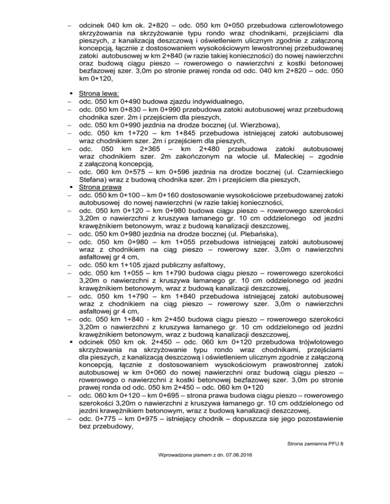 odcinek 040 km ok. 2+820 – odc. 050 km 0+050 przebudowa czterowlotowego skrzyżowania na skrzyżowanie typu rondo wraz chodnikami, przejściami dla pieszych, z kanalizacją deszczową i oświetleniem ulicznym zgodnie z załączoną koncepcją, łącznie z dostosowaniem wysokościowym lewostronnej przebudowanej zatoki autobusowej w km 2+840 (w razie takiej konieczności) do nowej nawierzchni oraz budową ciągu pieszo – rowerowego o nawierzchni z kostki betonowej bezfazowej szer. 3,0m po stronie prawej ronda od odc. 040 km 2+820 – odc. 050 km 0+120, Strona lewa: odc. 050 km 0+490 budowa zjazdu indywidualnego, odc. 050 km 0+830 – km 0+990 przebudowa zatoki autobusowej wraz przebudową chodnika szer. 2m i przejściem dla pieszych, odc. 050 km 0+990 jezdnia na drodze bocznej (ul. Wierzbowa), odc. 050 km 1+720 – km 1+845 przebudowa istniejącej zatoki autobusowej wraz chodnikiem szer. 2m i przejściem dla pieszych, odc. 050 km 2+365 – km 2+480 przebudowa zatoki autobusowej wraz chodnikiem szer. 2m zakończonym na wlocie ul. Maleckiej – zgodnie z załączoną koncepcją, odc. 060 km 0+575 – km 0+596 jezdnia na drodze bocznej (ul. Czarnieckiego Stefana) wraz z budową chodnika szer. 2m i przejściem dla pieszych, Strona prawa odc. 050 km 0+100 – km 0+160 dostosowanie wysokościowe przebudowanej zatoki autobusowej do nowej nawierzchni (w razie takiej konieczności, odc. 050 km 0+120 – km 0+980 budowa ciągu pieszo – rowerowego szerokości 3,20m o nawierzchni z kruszywa łamanego gr. 10 cm oddzielonego od jezdni krawężnikiem betonowym, wraz z budową kanalizacji deszczowej, odc. 050 km 0+980 jezdnia na drodze bocznej (ul. Plebańska), odc. 050 km 0+980 – km 1+055 przebudowa istniejącej zatoki autobusowej wraz z chodnikiem na ciąg pieszo – rowerowy szer. 3,0m o nawierzchni asfaltowej gr 4 cm, odc. 050 km 1+105 zjazd publiczny asfaltowy, odc. 050 km 1+055 – km 1+790 budowa ciągu pieszo – rowerowego szerokości 3,20m o nawierzchni z kruszywa łamanego gr. 10 cm oddzielonego od jezdni krawężnikiem betonowym, wraz z budową kanalizacji deszczowej, odc. 050 km 1+790 – km 1+840 przebudowa istniejącej zatoki autobusowej wraz z chodnikiem na ciąg pieszo – rowerowy szer. 3,0m o nawierzchni asfaltowej gr 4 cm, odc. 050 km 1+840 - km 2+450 budowa ciągu pieszo – rowerowego szerokości 3,20m o nawierzchni z kruszywa łamanego gr. 10 cm oddzielonego od jezdni krawężnikiem betonowym, wraz z budową kanalizacji deszczowej, odcinek 050 km ok. 2+450 – odc. 060 km 0+120 przebudowa trójwlotowego skrzyżowania na skrzyżowanie typu rondo wraz chodnikami, przejściami dla pieszych, z kanalizacją deszczową i oświetleniem ulicznym zgodnie z załączoną koncepcją, łącznie z dostosowaniem wysokościowym prawostronnej zatoki autobusowej w km 0+060 do nowej nawierzchni oraz budową ciągu pieszo – rowerowego o nawierzchni z kostki betonowej bezfazowej szer. 3,0m po stronie prawej ronda od odc. 050 km 2+450 – odc. 060 km 0+120 odc. 060 km 0+120 – km 0+695 – strona prawa budowa ciągu pieszo – rowerowego szerokości 3,20m o nawierzchni z kruszywa łamanego gr. 10 cm oddzielonego od jezdni krawężnikiem betonowym, wraz z budową kanalizacji deszczowej, odc. 0+775 – km 0+975 – istniejący chodnik – dopuszcza się jego pozostawienie bez przebudowy, Strona zamienna PFU 8 Wprowadzona pismem z dn. 07.06.2016