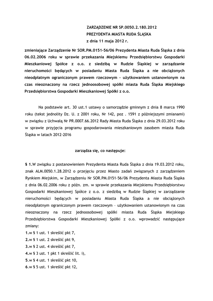 ZARZĄDZENIE NR SP.0050.2.180.2012 PREZYDENTA MIASTA RUDA ŚLĄSKA z dnia 11 maja 2012 r. zmieniające Zarządzenie Nr SOR.PM.0151-56/06 Prezydenta Miasta Ruda Śląska z dnia 06.02.2006 roku w sprawie przekazania Miejskiemu Przedsiębiorstwu Gospodarki Mieszkaniowej Spółce z o.o. z siedzibą w Rudzie Śląskiej w zarządzanie nieruchomości będących w posiadaniu Miasta Ruda Śląska a nie obciąŜonych nieodpłatnym ograniczonym prawem rzeczowym – uŜytkowaniem ustanowionym na czas nieoznaczony na rzecz jednoosobowej spółki miasta Ruda Śląska Miejskiego Przedsiębiorstwa Gospodarki Mieszkaniowej Spółki z o.o. Na podstawie art. 30 ust.1 ustawy o samorządzie gminnym z dnia 8 marca 1990 roku (tekst jednolity Dz. U. z 2001 roku, Nr 142, poz . 1591 z późniejszymi zmianami) w związku z Uchwałą Nr PR.0007.66.2012 Rady Miasta Ruda Śląska z dnia 29.03.2012 roku w sprawie przyjęcia programu gospodarowania mieszkaniowym zasobem miasta Ruda Śląska w latach 2012-2016 zarządza się, co następuje: § 1.W związku z postanowieniem Prezydenta Miasta Ruda Śląska z dnia 19.03.2012 roku, znak ALM.0050.1.28.2012 o przejęciu przez Miasto zadań związanych z zarządzeniem Rynkiem Miejskim, w Zarządzeniu Nr SOR.PM.0151-56/06 Prezydenta Miasta Ruda Śląska z dnia 06.02.2006 roku z późn. zm. w sprawie przekazania Miejskiemu Przedsiębiorstwu Gospodarki Mieszkaniowej Spółce z o.o. z siedzibą w Rudzie Śląskiej w zarządzanie nieruchomości będących w posiadaniu Miasta Ruda Śląska a nie obciąŜonych nieodpłatnym ograniczonym prawem rzeczowym – uŜytkowaniem ustanowionym na czas nieoznaczony na rzecz jednoosobowej spółki miasta Ruda Śląska Miejskiego Przedsiębiorstwa Gospodarki Mieszkaniowej Spółki z o.o. wprowadzić następujące zmiany: 1.w § 1 ust. 1 skreślić pkt 7, 2.w § 1 ust. 2 skreślić pkt 9, 3.w § 2 ust. 4 skreślić pkt 7, 4.w § 3 ust. 1 pkt 1 skreślić lit. i), 5.w § 4 ust. 1 skreślić pkt 10, 6.w § 5 ust. 1 skreślić pkt 12, 7.w § 6 ust. 1 pkt 3 skreślić lit. g, h, i; dotychczasowa lit. j) otrzymuje oznaczenie g), 8.w § 6 ust. 1 skreślić pkt 3A. 9.nadać nową treść § 6 ust. 1 pkt 4 i 5 w następującym brzmieniu: „4) Podstawą zapłaty wynagrodzenia za wykonywanie czynności technicznego utrzymania nieruchomości będzie faktura VAT wystawiona w 2 egzemplarzach na miasto Ruda Śląska – Urząd Miasta, plac Jana Pawła II 6, 41-709 Ruda Śląska w wysokości 130.000 brutto płatna kwartalnie z góry, a) środki z wynagrodzenia za wykonywanie czynności technicznego utrzymania nieruchomości naleŜy przeznaczać wyłącznie na utrzymanie techniczne nieruchomości będących w zarządzaniu Spółki, b) środki nie wykorzystane w kwartale, na który zostały wypłacone, naleŜy przeznaczyć na techniczne utrzymanie nieruchomości będących w zarządzaniu w następnym kwartale.” „5) Roczną stawkę wynagrodzenia za wykonywanie czynności technicznego utrzymania nieruchomości ustala się w wysokości 490.934,58 zł brutto.” § 2.W pozostałym zakresie Zarządzenie Nr SOR.PM.0151-56/06 Prezydenta Miasta Ruda Śląska z dnia 06.02.2006 roku z późn. zm. pozostaje bez zmian. § 3. Wykonanie zarządzenia powierzyć Naczelnikom: Wydziału Spraw Lokalowych, Wydziału Gospodarki Komunalnej i Ochrony Środowiska, Wydziału Administracyjnego oraz Wydziału Gospodarki Nieruchomościami. § 4. Nadzór nad wykonaniem zarządzenia pełni Zastępca Prezydenta ds. gospodarki nieruchomościami. § 5.Zarządzenie wchodzi w Ŝycie z dniem podpisania, z mocą obowiązującą: 1. § 1 pkt 1 – 8 od dnia 01.05.2012 roku, 2. § 1 pkt 9 - od dnia 01.04.2012 roku. PREZYDENT MIASTA GraŜyna Dziedzic Miasta