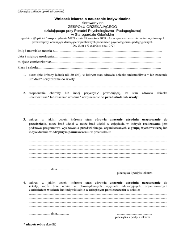 …........................................................ (pieczątka zakładu opieki zdrowotnej) Wniosek lekarza o nauczanie indywidualne kierowany do ZESPOŁU ORZEKAJĄCEGO działającego przy Poradni Psychologiczno- Pedagogicznej w Starogardzie Gdańskim zgodnie z §6 pkt.4 i 5 rozporządzenia MEN z dnia 18 września 2008 roku w sprawie orzeczeń i opinii wydawanych przez zespoły, orzekające działające w publicznych poradniach psychologiczno- pedagogicznych ( Dz. U. nr 173 z 2008 r. poz.1072) imię i nazwisko ucznia :.................................................................................................................... data i miejsce urodzenia:.................................................................................................................. miejsce zamieszkania:...................................................................................................................... klasa i szkoła:................................................................................................................................... 1. okres (nie krótszy jednak niż 30 dni), w którym stan zdrowia dziecka uniemożliwia * lub znacznie utrudnia* uczęszczanie do szkoły: …............................................................................................................................................... 2. rozpoznanie choroby lub innej przyczyny' powodującej, że stan zdrowia uniemożliwia* lub znacznie utrudnia* uczęszczanie do przedszkola lub szkoły: dziecka ….............................................................................................................................................................. .................................................................................................................................................................. .................................................................................................................................................................. 3. zakres, w jakim uczeń, któremu stan zdrowia znacznie utrudnia uczęszczanie do przedszkola, może brać udział w może brać udział w zajęciach, w których realizowana jest podstawa programowa wychowania przedszkolnego, organizowanych z grupą wychowawczą lub indywidualnie w odrębnym pomieszczeniu w przedszkolu: ….............................................................................................................................................................. .................................................................................................................................................................. ........................................................................................................................ ….............................................................................................................................................................. .................................................................................................................................................................. ........................................................................................................................ ......................... dnia.............. …...................................... pieczątka i podpis lekarza 4. zakres, w jakim uczeń, któremu stan zdrowia znacznie utrudnia uczęszczanie do szkoły, może brać udział w obowiązkowych zajęciach edukacyjnych, organizowanych z oddziałem w szkole lub indywidualnie w odrębnym pomieszczeniu w szkole: ….............................................................................................................................................................. .................................................................................................................................................................. .................................................................................................................................................................. .................................................................................................................................................................. ......................... dnia.............. * niepotrzebne skreślić …..................................... pieczątka i podpis lekarza