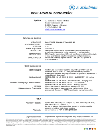 DEKLARACJA ZGODNOŚCI Spółka A. Schulman Plastics BVBA Pedro Colomalaan 25 B-2880 Bornem - Belgium T +32-3-890 42 11 [email protected] Informacje ogólne PRODUKT KOD PRODUKTU: WERSJA DATA WYDANIA WAŻNY DO WNIOSKI UE WNIOSKI USA POLYWHITE 8000 WHITE ASBAG 25 11582601 1.19 13/03/2015 Dokument ten jest ważny do następnej zmiany właściwych przepisów ustawowych, zmian prawnych i / lub jego treści. Skład zgodny z przepisami UE, gdy poniższa metoda została użyta w celu sprawdzenia, czy limit migracji nie jest przekroczony. Wszystkie elementy zgodne z FDA, CFR tytuł 21; zgodnie z przeznaczeniem. Unia Europejska 1935/2004/EC Limity migracji Dodatki "Podwójnego zastosowania" AP(89)1 Lista pozytywna Francuska Produkt jest wytwarzany zgodnie z dyrektywą 10/2011/EC ze zmianami do EU 2015/174. Wszystkie monomery i dodatki spełniają wymagania dotyczące kontaktu z żywnością wynikające z następujących ograniczeń: FCM No 106 - Nr ref. 24550 & 89040 - LUBRICANT - 25 mg/kg SML FCM No 433 - Nr ref. 68320 - ANTI-OXIDANT - 6 mg/kg SML FCM No 610 - Nr ref. 93440 - E171 - TIO2;PIGMENT FCM No 504 - Nr ref. 86240 - E551 - ANTI-BLOCKING Wszystkie pigmenty są zgodne z rezolucją AP (89) 1 Wszystkie pigmenty są wymienione na francuskiej liście pozytywnej, Broszura nr 1227 i spełniają jej wymogi czystości. USA Polimery i dodatki Pigmenty Odpowiedzialność spełnia FDA 21 CFR §177.1520(c)3.1a, FDA 21 CFR §178.2010, FDA 21 CFR §177.1520(c)2.1 for use in articles that contact food except for articles used for packing or holding food during cooking są wymienione w FDA 21 CFR §178.3297 Odpowiednie ogólne i szczegółowe testy migracji materiału lub Informacje oraz zalecenia zawarte w niniejszym dokumencie oparte są na danych zebranych przez A. Schulman i uważane są za rzetel ne; ponieważ jednak A. Schulman nie jest w stanie przewidzieć oraz nie ma wpływu na różne warunki, w jakich informacje i/lub produkty mogą być stosowane, nie udziela się jakic hkolwiek zapewnień ani żadnego rodzaju gwarancji – stwierdzonej lub domniemanej – odnośnie kompletności, dokładności, dostępności, przydatności, odpowiedniego charakteru, wartości handlowej lub braku narusze nia praw własności intelektualnej przez informacje, zalecenia, a także bezpośrednio lub pośrednio oferowane produkty i usługi. A. Schulman nie ponosi jakiejkolwiek odpowiedzialności za skutki stosowania produktów i procesów opisanych w niniejszym dokumencie oraz jednocześnie zaprzecza udzieleniu domniemanych gwarancji w zakres ie ich przydatności handlowej i przydatności do określonego celu. DEKLARACJA ZGODNOŚCI wyrobu końcowego określą jego przydatność do kontaktu z różnymi rodzajami żywności w różnych modelach ostatecznego zastosowania. Jednakże są one poza kontrolą A. Schulman i są częscią odpowiedzialności spoczywającej na użytkowniku tego produktu. A.Schulman - Product Safety Ten dokument jest tworzony w formie elektronicznej i jest ważny bez podpisu. Data:29/06/2015 Tekst oryginalny: angielski Informacje oraz zalecenia zawarte w niniejszym dokumencie oparte są na danych zebranych przez A. Schulman i uważane są za rzetel ne; ponieważ jednak A. Schulman nie jest w stanie przewidzieć oraz nie ma wpływu na różne warunki, w jakich informacje i/lub produkty mogą być stosowane, nie udziela się jakic hkolwiek zapewnień ani żadnego rodzaju gwarancji – stwierdzonej lub domniemanej – odnośnie kompletności, dokładności, dostępności, przydatności, odpowiedniego charakteru, wartości handlowej lub braku narusze nia praw własności intelektualnej przez informacje, zalecenia, a także bezpośrednio lub pośrednio oferowane produkty i usługi. A. Schulman nie ponosi jakiejkolwiek odpowiedzialności za skutki stosowania produktów i procesów opisanych w niniejszym dokumencie oraz jednocześnie zaprzecza udzieleniu domniemanych gwarancji w zakres ie ich przydatności handlowej i przydatności do określonego celu.