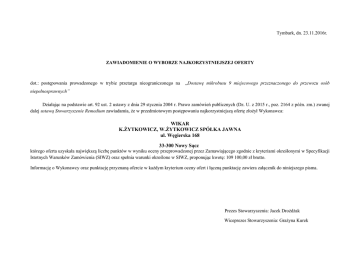 Tymbark, dn. 23.11.2016r. ZAWIADOMIENIE O WYBORZE NAJKORZYSTNIEJSZEJ OFERTY dot.: postępowania prowadzonego w trybie przetargu nieograniczonego na „Dostawę mikrobusu 9 miejscowego przeznaczonego do przewozu osób niepełnosprawnych” Działając na podstawie art. 92 ust. 2 ustawy z dnia 29 stycznia 2004 r. Prawo zamówień publicznych (Dz. U. z 2015 r., poz. 2164 z późn. zm.) zwanej dalej ustawą Stowarzyszenie Remedium zawiadamia, że w przedmiotowym postępowaniu najkorzystniejszą ofertę złożył Wykonawca: WIKAR K.ŻYTKOWICZ, W.ŻYTKOWICZ SPÓŁKA JAWNA ul. Węgierska 168 33-300 Nowy Sącz którego oferta uzyskała największą liczbę punktów w wyniku oceny przeprowadzonej przez Zamawiającego zgodnie z kryteriami określonymi w Specyfikacji Istotnych Warunków Zamówienia (SIWZ) oraz spełnia warunki określone w SIWZ, proponując kwotę: 109 100,00 zł brutto. Informację o Wykonawcy oraz punktację przyznaną ofercie w każdym kryterium oceny ofert i łączną punktację zawiera załącznik do niniejszego pisma. Prezes Stowarzyszenia: Jacek Drożdżak Wiceprezes Stowarzyszenia: Grażyna Kurek Informacja o Wykonawcy oraz punktacja przyznana ofercie w każdym kryterium oceny ofert i łączna punktacja: Lp. Wykonawca Cena „ C” Dodatkowa Gwarancja „ Dodatkowe Termin (max 60 pkt) klimatyzacja G” ciemne szyby w realizacji tylna „ K”( max ( max 5 pkt) tylnej części dostawy „ T” 10 pkt) „CS” (max 10 ( max 15 pkt) pkt) 1. 60 10 0 10 15 Suma punktów 95 WIKAR K.ŻYTKOWICZ, W.ŻYTKOWICZ SPÓŁKA JAWNA ul. Węgierska 168 33-300 Nowy Sącz Prezes Stowarzyszenia: Jacek Drożdżak Wiceprezes Stowarzyszenia: Grażyna Kurek