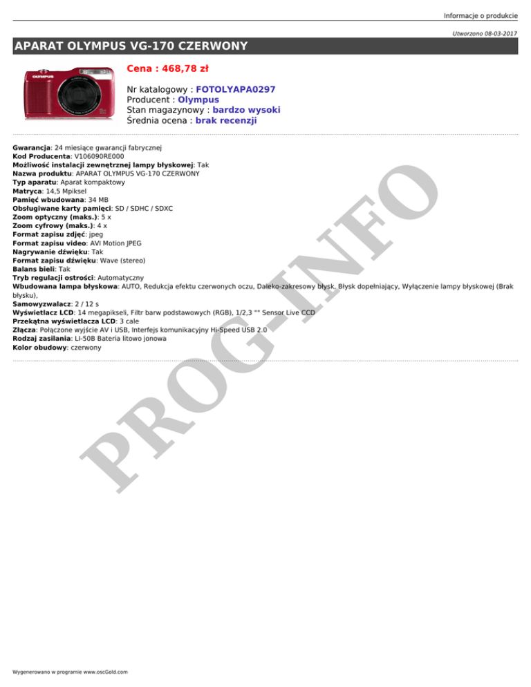 Informacje o produkcie Utworzono 08-03-2017 APARAT OLYMPUS VG-170 CZERWONY Cena : 468,78 zł Nr katalogowy : FOTOLYAPA0297 Producent : Olympus Stan magazynowy : bardzo wysoki Średnia ocena : brak recenzji PR O G -I N FO Gwarancja: 24 miesiące gwarancji fabrycznej Kod Producenta: V106090RE000 Możliwość instalacji zewnętrznej lampy błyskowej: Tak Nazwa produktu: APARAT OLYMPUS VG-170 CZERWONY Typ aparatu: Aparat kompaktowy Matryca: 14,5 Mpiksel Pamięć wbudowana: 34 MB Obsługiwane karty pamięci: SD / SDHC / SDXC Zoom optyczny (maks.): 5 x Zoom cyfrowy (maks.): 4 x Format zapisu zdjęć: jpeg Format zapisu video: AVI Motion JPEG Nagrywanie dźwięku: Tak Format zapisu dźwięku: Wave (stereo) Balans bieli: Tak Tryb regulacji ostrości: Automatyczny Wbudowana lampa błyskowa: AUTO, Redukcja efektu czerwonych oczu, Daleko-zakresowy błysk, Błysk dopełniający, Wyłączenie lampy błyskowej (Brak błysku), Samowyzwalacz: 2 / 12 s Wyświetlacz LCD: 14 megapikseli, Filtr barw podstawowych (RGB), 1/2,3 "" Sensor Live CCD Przekątna wyświetlacza LCD: 3 cale Złącza: Połączone wyjście AV i USB, Interfejs komunikacyjny Hi-Speed USB 2.0 Rodzaj zasilania: LI-50B Bateria litowo jonowa Kolor obudowy: czerwony Wygenerowano w programie www.oscGold.com