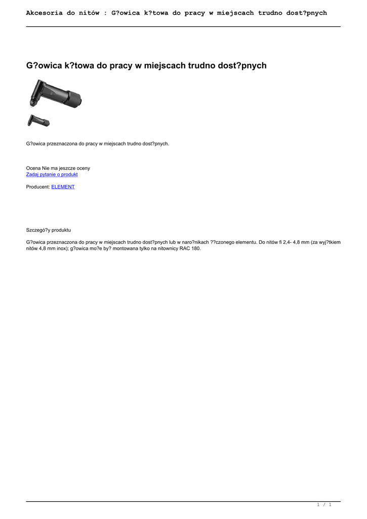 Akcesoria do nitów : G?owica k?towa do pracy w miejscach trudno dost?pnych G?owica k?towa do pracy w miejscach trudno dost?pnych G?owica przeznaczona do pracy w miejscach trudno dost?pnych. Ocena Nie ma jeszcze oceny Zadaj pytanie o produkt Producent: ELEMENT Szczegó?y produktu G?owica przeznaczona do pracy w miejscach trudno dost?pnych lub w naro?nikach ??czonego elementu. Do nitów fi 2,4- 4,8 mm (za wyj?tkiem nitów 4,8 mm inox); g?owica mo?e by? montowana tylko na nitownicy RAC 180. 1 / 1 Powered by TCPDF (www.tcpdf.org)
