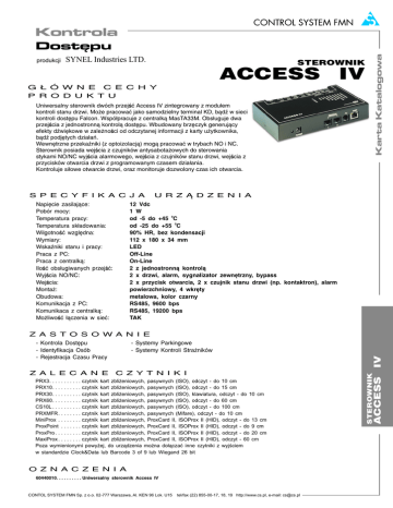 Kontrola produkcji SYNEL Industries LTD. Karta Katalogowa Dostêpu STEROWNIK ACCESS IV G £ Ó W N E C E C H Y P R O D U K T U Uniwersalny sterownik dwóch przejœæ Access IV zintegrowany z modu³em kontroli stanu drzwi. Mo¿e pracowaæ jako samodzielny terminal KD, b¹dŸ w sieci kontroli dostêpu Falcon. Wspó³pracuje z centralk¹ MasTA33M. Obs³uguje dwa przejœcia z jednostronn¹ kontrol¹ dostêpu. Wbudowany brzêczyk generuj¹cy efekty dŸwiêkowe w zale¿noœci od odczytanej informacji z karty u¿ytkownika, b¹dŸ podjêtych dzia³añ. Wewnêtrzne przekaŸniki (z optoizolacj¹) mog¹ pracowaæ w trybach NO i NC. Sterownik posiada wejœcia z czujników antysabota¿owych do sterowania stykami NO/NC wyjœcia alarmowego, wejœcia z czujników stanu drzwi, wejœcia z przycisków otwarcia drzwi z programowanym czasem dzia³ania. Kontroluje si³owe otwarcie drzwi, oraz monitoruje dozwolony czas ich otwarcia. S P E C Y F I K A C J A Napiêcie zasilaj¹ce: Pobór mocy: Temperatura pracy: Temperatura sk³adowania: Wilgotnoœæ wzglêdna: Wymiary: WskaŸniki stanu i pracy: Praca z PC: Praca z centralk¹: Iloœæ obs³ugiwanych przejœæ: Wyjœcia NO/NC: Wejœcia: Monta¿: Obudowa: Komunikacja z PC: Komunikaca z centralk¹: Mo¿liwoœæ ³¹czenia w sieæ: U R Z ¥ D Z E N I A 12 Vdc 1 W 0 od -5 do +45 C 0 od -25 do +55 C 90% HR, bez kondensacji 112 x 180 x 34 mm LED Off-Line On-Line 2 z jednostronn¹ kontrol¹ 2 x drzwi, alarm, sygnalizator zewnêtrzny, bypass 2 x przycisk otwarcia, 2 x czujnik stanu drzwi (np. kontaktron), alarm powierzchniowy, 4 wkrêty metalowa, kolor czarny RS485, 9600 bps RS485, 19200 bps TAK Z A S T O S O W A N I E O Z N A C Z E N I A 60440010. . . . . . . . . . Uniwersalny sterownik Access IV CONTOL SYSTEM FMN Sp. z o.o. 02-777 Warszawa, Al. KEN 96 Lok. U15 tel/fax (22) 855-00-17, 18, 19 http://www.cs.pl, e-mail: [email protected] ACCESS C Z Y T N I K I PRX3. . . . . . . . . . . czytnik kart zbli¿eniowych, pasywnych (ISO), odczyt - do 10 cm PRX10. . . . . . . . . . czytnik kart zbli¿eniowych, pasywnych (ISO), odczyt - do 15 cm PRX30. . . . . . . . . . czytnik kart zbli¿eniowych, pasywnych (ISO), klawiatura, odczyt - do 10 cm PRX60. . . . . . . . . . czytnik kart zbli¿eniowych, pasywnych (ISO), odczyt - do 60 cm CS10L . . . . . . . . . . czytnik kart zbli¿eniowych, pasywnych (ISO), odczyt - do 100 cm PRXMFR. . . . . . . . czytnik kart zbli¿eniowych, pasywnych (Mifare), odczyt - do 10 cm MiniProx . . . . . . . . czytnik kart zbli¿eniowych, ProxCard II, ISOProx II (HID), odczyt - do 13 cm ProxPoint . . . . . . . czytnik kart zbli¿eniowych, ProxCard II, ISOProx II (HID), odczyt - do 9 cm ProxPro . . . . . . . . . czytnik kart zbli¿eniowych, ProxCard II, ISOProx II (HID), odczyt - do 20 cm MaxiProx . . . . . . . . czytnik kart zbli¿eniowych, ProxCard II, ISOProx II (HID), odczyt - 60 cm Poza wymienionymi powy¿ej, do urz¹dzenia mo¿na do³¹czaæ inne czytniki z wyjœciem w standardzie Clock&Data lub Barcode 3 of 9 lub Wiegand 26 bit STEROWNIK Z A L E C A N E - Systemy Parkingowe - Systemy Kontroli Stra¿ników IV - Kontrola Dostêpu - Identyfikacja Osób - Rejestracja Czasu Pracy