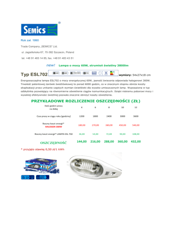 Rok zał. 1990 Trade Company „SEMICS” Ltd. ul. Jagiellońska 67, 70-382 Szczecin, Poland tel. +48 91 483 14 85, fax. +48 91 483 43 51 new! Lampa o mocy 60W, strumień świetlny 3800lm Typ ESL702 wymiary: 54x27x18 cm Energooszczędna lampa ESL702 o mocy energetycznej 60W, jasność świecenia odpowiada halogenowi 300W. Trwałość patentowej żarówki świetlówkowej to ponad 6000 godzin, co w znacznym stopniu obniża koszty eksploatacji przez unikanie częstych wymian świetlówki dla wysoko umieszczonych lamp. Wyposażona w typ odbłyśnika pozwalający na równomierne oświetlenie ciągów komunikacyjnych. Dzięki niskiemu poborowi mocy i wysokiej efektywności świetlnej pozwala znacznie obniżyć koszty oświetlenia. PRZYKŁADOWE ROZLICZENIE OSZCZĘDNOŚCI (ZŁ) Ilośd godzin pracy na dobę 4 6 8 10 12 Czas pracy w ciągu roku [godziny] 1200 1800 2400 3000 3600 Roczny koszt energii* HALOGEN 300W 180,00 270,00 360,00 450,00 540,00 Roczny koszt energii* LAMPA ESL 702 36,00 54,00 72,00 90,00 108,00 OSZCZĘDNOŚĆ 144,00 216,00 288,00 * przyjęto stawkę 0,50 zł/1 kWh 360,00 432,00
