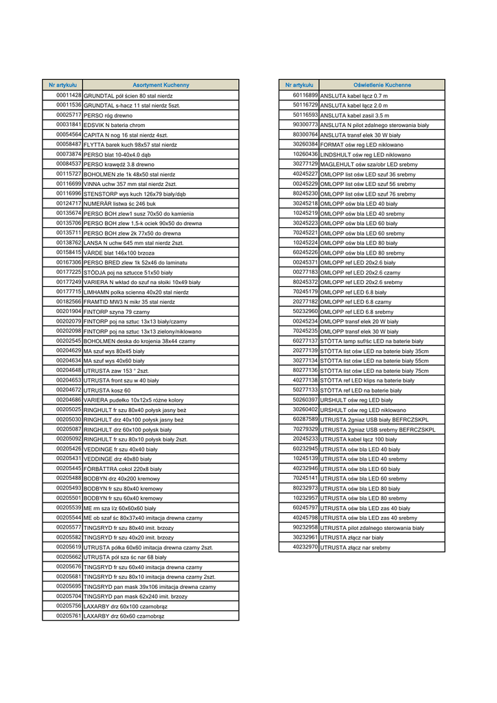 Nr artykułu Asortyment Kuchenny 00011428 GRUNDTAL pół ścien 80 stal nierdz Nr artykułu Oświetlenie Kuchenne 60116899 ANSLUTA kabel łącz 0.7 m 00011536 GRUNDTAL s-hacz 11 stal nierdz 5szt. 50116729 ANSLUTA kabel łącz 2.0 m 00025717 PERSO róg drewno 50116593 ANSLUTA kabel zasil 3.5 m 00031841 EDSVIK N bateria chrom 90300773 ANSLUTA N pilot zdalnego sterowania biały 00054564 CAPITA N nog 16 stal nierdz 4szt. 80300764 ANSLUTA transf elek 30 W biały 00058487 FLYTTA barek kuch 98x57 stal nierdz 30260384 FORMAT ośw reg LED niklowano 00073874 PERSO blat 10-40x4.0 dąb 10260436 LINDSHULT ośw reg LED niklowano 00084537 PERSO krawędź 3.8 drewno 30277129 MAGLEHULT ośw sza/obr LED srebrny 00115727 BOHOLMEN zle 1k 48x50 stal nierdz 40245227 OMLOPP list ośw LED szuf 36 srebrny 00116699 VINNA uchw 357 mm stal nierdz 2szt. 00245229 OMLOPP list ośw LED szuf 56 srebrny 00116996 STENSTORP wys kuch 126x79 biały/dąb 80245230 OMLOPP list ośw LED szuf 76 srebrny 00124717 NUMERÄR listwa śc 246 buk 30245218 OMLOPP ośw bla LED 40 biały 00135674 PERSO BOH zlew1 susz 70x50 do kamienia 10245219 OMLOPP ośw bla LED 40 srebrny 00135706 PERSO BOH zlew 1,5-k ociek 90x50 do drewna 30245223 OMLOPP ośw bla LED 60 biały 00135711 PERSO BOH zlew 2k 77x50 do drewna 70245221 OMLOPP ośw bla LED 60 srebrny 00138762 LANSA N uchw 645 mm stal nierdz 2szt. 10245224 OMLOPP ośw bla LED 80 biały 00158415 VÄRDE blat 146x100 brzoza 60245226 OMLOPP ośw bla LED 80 srebrny 00167306 PERSO BRED zlew 1k 52x46 do laminatu 00245371 OMLOPP ref LED 20x2.6 biały 00177225 STÖDJA poj na sztucce 51x50 biały 00277183 OMLOPP ref LED 20x2.6 czarny 00177249 VARIERA N wkład do szuf na słoiki 10x49 biały 80245372 OMLOPP ref LED 20x2.6 srebrny 00177715 LIMHAMN polka scienna 40x20 stal nierdz 70245179 OMLOPP ref LED 6.8 biały 00182566 FRAMTID MW3 N mikr 35 stal nierdz 20277182 OMLOPP ref LED 6.8 czarny 00201904 FINTORP szyna 79 czarny 50232960 OMLOPP ref LED 6.8 srebrny 00202079 FINTORP poj na sztuc 13x13 biały/czarny 00245234 OMLOPP transf elek 20 W biały 00202098 FINTORP poj na sztuc 13x13 zielony/niklowano 70245235 OMLOPP transf elek 30 W biały 00202545 BOHOLMEN deska do krojenia 38x44 czarny 60277137 STÖTTA lamp suf/śc LED na baterie biały 00204629 MA szuf wys 80x45 biały 20277139 STÖTTA list ośw LED na baterie biały 35cm 00204634 MA szuf wys 40x60 biały 30277134 STÖTTA list ośw LED na baterie biały 55cm 00204648 UTRUSTA zaw 153 ° 2szt. 80277136 STÖTTA list ośw LED na baterie biały 75cm 00204653 UTRUSTA front szu w 40 biały 40277138 STÖTTA ref LED klips na baterie biały 00204672 UTRUSTA kosz 60 50277133 STÖTTA ref LED na baterie biały 00204686 VARIERA pudełko 10x12x5 różne kolory 50260397 URSHULT ośw reg LED biały 00205025 RINGHULT fr szu 80x40 połysk jasny beż 30260402 URSHULT ośw reg LED niklowano 00205030 RINGHULT drz 40x100 połysk jasny beż 60287589 UTRUSTA 2gniaz USB biały BEFRCZSKPL 00205087 RINGHULT drz 60x100 połysk biały 70279329 UTRUSTA 2gniaz USB srebrny BEFRCZSKPL 00205092 RINGHULT fr szu 80x10 połysk biały 2szt. 20245233 UTRUSTA kabel łącz 100 biały 00205426 VEDDINGE fr szu 40x40 biały 60232945 UTRUSTA ośw bla LED 40 biały 00205431 VEDDINGE drz 40x80 biały 10245139 UTRUSTA ośw bla LED 40 srebrny 00205445 FÖRBÄTTRA cokol 220x8 biały 40232946 UTRUSTA ośw bla LED 60 biały 00205488 BODBYN drz 40x200 kremowy 70245141 UTRUSTA ośw bla LED 60 srebrny 00205493 BODBYN fr szu 80x40 kremowy 80232973 UTRUSTA ośw bla LED 80 biały 00205501 BODBYN fr szu 60x40 kremowy 10232957 UTRUSTA ośw bla LED 80 srebrny 00205539 ME rm sza l/z 60x60x60 biały 60245797 UTRUSTA ośw bla LED zas 40 biały 00205544 ME ob szaf śc 80x37x40 imitacja drewna czarny 40245798 UTRUSTA ośw bla LED zas 40 srebrny 00205577 TINGSRYD fr szu 80x40 imit. brzozy 90232958 UTRUSTA pilot zdalnego sterowania biały 00205582 TINGSRYD fr szu 40x20 imit. brzozy 30232961 UTRUSTA złącz nar biały 00205619 UTRUSTA półka 60x60 imitacja drewna czarny 2szt. 40232970 UTRUSTA złącz nar srebrny 00205662 UTRUSTA pół sza śc nar 68 biały 00205676 TINGSRYD fr szu 60x40 imitacja drewna czarny 00205681 TINGSRYD fr szu 80x10 imitacja drewna czarny 2szt. 00205695 TINGSRYD pan mask 39x106 imitacja drewna czarny 00205704 TINGSRYD pan mask 62x240 imit. brzozy 00205756 LAXARBY drz 60x100 czarnobrąz 00205761 LAXARBY drz 60x60 czarnobrąz 00205780 LAXARBY dr szk 40x40 czarnobrąz 00205799 LAXARBY drz 60x60 biały 00205803 LAXARBY fr szu 80x20 biały 00205817 LAXARBY dr szk 40x80 biały 00205822 LAXARBY pan mask 39x106 biały 00205836 JUTIS dr szk 40x60 szkło matowe/aluminium 00205902 KROKTORP drz 60x60 kremowy 00205916 KROKTORP fr szu 80x20 kremowy 00205921 KROKTORP drz 60x180 kremowy 00206015 GRYTNÄS drz 60x140 kremowy 00206020 GRYTNÄS fr szu 80x40 kremowy 00206058 NODSTA drz 40x60 biały/aluminium 00206063 NODSTA fr szu 60x20 biały/aluminium 00206119 BROKHULT drz 40x100 orzech jasnoszary 00206124 BROKHULT drz 40x80 orzech jasnoszary 00206138 BROKHULT drz 60x180 orzech jasnoszary 00206143 BROKHULT pan mask 39x106 orzech jasnoszary 00208203 RINGHULT pas dek zokr 221 połysk biały 00208236 VEDDINGE drz 60x120 biały 00208401 NODSTA pas dek zokr 221 biały 00212417 HÄGGEBY drz 60x200 biały 00212441 BROKHULT drz 40x60 orzech jasnoszary 00212554 ME ob sz śc nar 68x68x60 biały 00212568 ME ob sza st 20x60x80 imitacja drewna czarny 00212573 ME ob sza w 80x37x200 imitacja drewna czarny 00213539 GRUNDTAL szyna 40 stal nierdz 00213841 FINTORP szyna 79 niklowano 00213855 FINTORP hak 7 niklowano 5szt. 00215294 FÖ szuf n 80x37 biały 00215312 UTRUSTA susz sza śc 80x35 00215661 PERSO blat 63.6-90x3.8 czarny marmur/laminat 00215741 PERSO blat 40.1-63.5x3.9 ciemnoszary Kamień 00215755 PERSO blat 90.1-125x3.9 antracyt Kamień 00215920 PERSO blat 90.1-125x3.9 beżowy Kamień 00216439 PERSO blat 2str 63.6-90x3.8 orzech/laminat 00216463 PERSO blat 2str 63.6-90x3.8 czarny minerał/laminat 00216477 PERSO blat dwustr 40.1-63.5