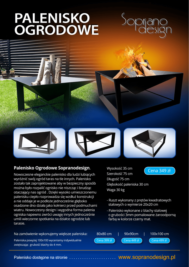 Palenisko Ogrodowe Sopranodesign. Wysokość 35 cm Nowoczesne eleganckie palenisko dla ludzi lubiących wyróżnić swój ogród taras na tle innych. Palenisko zostało tak zaprojektowane aby w bezpieczny sposób można było rozpalić ognisko nie niszcząc i brudząc otaczający nas ogród . Dzięki wysoko umieszczonemu palenisku ciepło rozprowadza się wzdłuż konstrukcji a nie oddaje je w podłoże jednocześnie głęboko osadzone dno działa jako kołnierz przed podmuchami wiatru. Nowoczesny design i wygodna forma palenia ogniska napewno zwróci uwagę innych jednocześnie umili wieczorne spotkania na działce ogrodzie lub tarasie. Szerokość 75 cm Cena 349 zł Długość 75 cm Glębokość paleniska 30 cm Waga 30 kg - Ruszt wykonany z prętów kwadratowych stalowych o wymierze 20x20 cm - Palenisko wykonane z blachy stalowej o grubości 3mm pomalowane żaroodporną farbą w kolorze czarny mat. Na zamówienie wykonujemy większe paleniska: 80x80 cm Paleniska powyżej 100x100 wyceniamy indywidualnie Cena 399 zł | 90x90cm Cena 449 zł | 100x100 cm Cena 499 zł zwiększając grubość blachy do 4 mm. Palenisko dostępne na stronie . . . . . . . . . . . . . . . . . . . . . . www.sopranodesign.pl