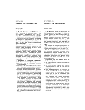 DZIAŁ XIX CHAPTER XIX FINANSE PRZEDSIĘBIORSTW FINANCES OF ENTERPRISES Uwagi ogólne General notes 1. Wyniki finansowe przedsiębiorstw dla 2000 r. prezentuje się zgodnie z ustawą z dnia 29 IX 1994 r. o rachunkowości (Dz. U. Nr 121 poz. 591) z późniejszymi zmianami, od 2003 w dostosowaniu do ustawy z dnia 9 XI 2000 r. o zmianie ustawy o rachunkowości, obowiązującej od 1 I 2002 r. (tekst jednolity Dz. U. 2002, Nr 76, poz. 694) z późniejszymi zmianami. Dane od 2002 r. nie są w pełni porównywalne z danymi za lata poprzednie. Dane w zakresie gospodarki finansowej przedsiębiorstw obejmują podmioty gospodarcze prowadzące księgi rachunkowe, w których liczba pracujących przekracza 9 osób. Dane nie obejmują banków, instytucji ubezpieczeniowych, domów i biur maklerskich, towarzystw inwestycyjnych i emerytalnych, narodowych funduszy inwestycyjnych, szkół wyższych, samodzielnych publicznych zakładów opieki zdrowotnej, instytucji kultury posiadających osobowość prawną i gospodarstw indywidualnych w rolnictwie. 2. Przychody z całokształtu działalności (kwoty otrzymane i należne) obejmują: 1) przychody netto ze sprzedaży produktów (wyrobów i usług); 2) przychody netto ze sprzedaży towarów i materiałów (łącznie z kwotami należnymi z tytułu sprzedaży opakowań wielokrotnego użytku); 3) pozostałe przychody operacyjne, tj. przychody niezwiązane bezpośrednio z podstawową działalnością podmiotu, do których zalicza się: zysk ze zbycia niefinansowych aktywów trwałych (środków trwałych, środków trwałych w budowie, wartości niematerialnych i prawnych, inwestycji w nieruchomości i prawa — do 2001 r. przychody ze sprzedaży lub wpływy z likwidacji środków trwałych, wartości niematerialnych i prawnych oraz inwestycji rozpoczętych), otrzymane nieodpłatnie, w tym w drodze darowizny aktywa (środki pieniężne), odszkodowania, rozwiązane rezerwy, korekty odpisów aktualizujących wartość aktywów niefinansowych, przychody z działalności socjalnej, przychody z wynajmu lub dzierżawy środków trwałych albo inwestycji w nieruchomości i prawa; 1. The financial results of enterprises for 2000 are presented according to the Act of Accounting dated 29 IX 1994 (Journal of Laws No. 121, item 591) with later amendments, since 2003 adjusted to the Act on change of the Act of Accounting dated 9 XI 2000, valid since 1 I 2002 (uniform text Journal of Laws 2002, No. 76, item 694) with later amendments. Data since 2002 are not fully comparable with data for the previous years. Data regarding the financial management of enterprises include economic entities keeping accounting ledgers employing more than 9 persons. Data do not include banks, insurance companies, brokerage houses and brokerage offices, investment and pension societies, national investment funds, higher education institutions, independent public health care facilities, cultural institutions with legal personality and private farms in agriculture. 2. Revenues from total activity (sums received and due) include: 1) net sales revenues of products (goods and services); 2) net sales revenues of goods and materials (including sums due from the sale of re-use packages); 3) other operating revenues, i.e., revenues not directly connected with the basic activity of the entity, to which the following are included: profits from the sale of non-financial fixed assets (fixed assets, assets under construction, intangible fixed assets, investments in real estate and rights — until 2001 sales revenues or income from the liquidation of fixed assets and investments begun), assets (cash) received free of charge, including donated assets, as well as damages, reversed provisions, adjustments of the depreciation value for non-financial assets, income from social activities, income from the rent or lease of fixed assets and investments in real estate and rights; 4) przychody finansowe, tj. przychody z tytułu dokonanych przez podmiot operacji finansowych: kwoty należne z tytułu dywidend i udziałów w zysku, odsetki od udzielanych pożyczek, odsetki od lokat terminowych, odsetki za zwłokę, zysk ze zbycia inwestycji — do 2001 r. odrębnie przychody i koszty z tego tytułu, zmniejszenia odpisów aktualizacyjnych wartości inwestycji wobec całkowitego lub częściowego ustania przyczyn powodujących trwałą utratę ich wartości, nadwyżkę dodatnich różnic kursowych nad ujemnymi — do 2001 r. odrębnie przychody i koszty z tego tytułu. 3. Koszty uzyskania przychodów z całokształtu działalności obejmują: 1) koszt własny sprzedanych produktów (wyrobów i usług), tj. koszt wytworzenia sprzedanych produktów powiększony o koszty sprzedaży (z podatkiem akcyzowym) i o koszty ogólnego zarządu (wariant kalkulacyjny) lub są to koszty ogółem pomniejszone o koszt wytworzenia świadczeń na własne potrzeby jednostki i skorygowane o zmianę stanu produktów (wariant porównawczy); 2) wartość sprzedanych towarów i materiałów według cen zakupu (nabycia); 3) pozostałe koszty operacyjne obejmują: stratę ze zbycia niefinansowych aktywów trwałych, tj. nadwyżkę wartości sprzedanych składników majątku trwałego nad przychodami z ich sprzedaży — do 2001 r. wartość sprzedanych składników majątku trwałego, amortyzację oddanych w dzierżawę lub najem środków trwałych i środków trwałych w budowie, nieplanowane odpisy amortyzacyjne (odpisy z tytułu trwałej utraty wartości), poniesione kary, grzywny, odszkodowania, odpisane w części lub w całości wierzytelności w związku z postępowaniem upadłościowym, układowym i naprawczym, utworzone rezerwy na prawne lub o dużym stopniu prawdopodobieństwa przyszłe zobowiązania (straty z transakcji gospodarczych w toku), odpisy aktualizujące wartość aktywów niefinansowych, koszty utrzymania obiektów działalności socjalnej, darowizny lub nieodpłatnie przekazane aktywa trwałe; 4) koszty finansowe, na które składa