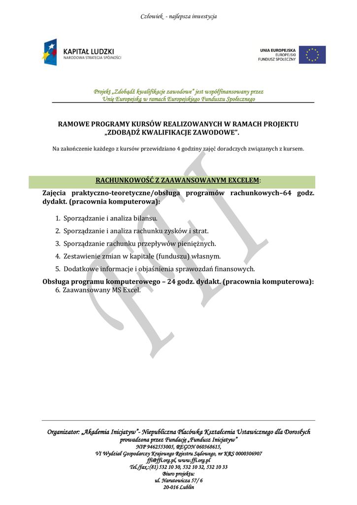Człowiek - najlepsza inwestycja Projekt „Zdobądź kwalifikacje zawodowe” jest współfinansowany przez Unię Europejską w ramach Europejskiego Funduszu Społecznego RAMOWE PROGRAMY KURSÓW REALIZOWANYCH W RAMACH PROJEKTU „ZDOBĄDŹ KWALIFIKACJE ZAWODOWE”. Na zakończenie każdego z kursów przewidziano 4 godziny zajęć doradczych związanych z kursem. RACHUNKOWOŚĆ Z ZAAWANSOWANYM EXCELEM: Zajęcia praktyczno-teoretyczne/obsługa programów rachunkowych–64 godz. dydakt. (pracownia komputerowa): 1. Sporządzanie i analiza bilansu. 2. Sporządzanie i analiza rachunku zysków i strat. 3. Sporządzanie rachunku przepływów pieniężnych. 4. Zestawienie zmian w kapitale (funduszu) własnym. 5. Dodatkowe informacje i objaśnienia sprawozdań finansowych. Obsługa programu komputerowego – 24 godz. dydakt. (pracownia komputerowa): 6. Zaawansowany MS Excel. Organizator: „Akademia Inicjatyw”- Niepubliczna Placówka Kształcenia Ustawicznego dla Dorosłych prowadzona przez Fundację „Fundusz Inicjatyw” NIP 9462553005, REGON 060368615, VI Wydział Gospodarczy Krajowego Rejestru Sądowego, nr KRS 0000306907 [email protected], www.ffi.org.pl Tel./fax.:(81) 532 10 30, 532 10 32, 532 10 33 Biuro projektu: ul. Narutowicza 57/ 6 20-016 Lublin Człowiek - najlepsza inwestycja Projekt „Zdobądź kwalifikacje zawodowe” jest współfinansowany przez Unię Europejską w ramach Europejskiego Funduszu Społecznego SPRZEDAŻ Z ZAAWANSOWANYN EXCELEM: Zagadnienia teoretyczno-praktyczne – 64 godz. dydakt. (sala wykładowa): 1. Najważniejsze reguły i zasady profesjonalnej obsługi klienta. 2. Budowanie pozytywnych relacji w kontakcie z klientem. 3. Psychologia obsługi klienta. 4. Podstawy prawidłowych relacji interpersonalnych w kontakcie z klientem. 5. Manipulacje ze strony klientów – rozpoznawanie i przeciwdziałanie. 6. Sprzedaż i obsługa klienta a rozpoznawanie jego potrzeb. 7. Trudne sytuacje w kontaktach z klientami. 8. Etapy rozwiązywania zastrzeżeń zgłaszanych przez klientów. 9. Skuteczne techniki finalizacji. 10. Negocjacje z klientem w procesie sprzedażowym. Obsługa programu komputerowego – 24 godz. dydakt. (pracownia komputerowa): 11. Zaawansowany MS Excel. Organizator: „Akademia Inicjatyw”- Niepubliczna Placówka Kształcenia Ustawicznego dla Dorosłych prowadzona przez Fundację „Fundusz Inicjatyw” NIP 9462553005, REGON 060368615, VI Wydział Gospodarczy Krajowego Rejestru Sądowego, nr KRS 0000306907 [email protected], www.ffi.org.pl Tel./fax.:(81) 532 10 30, 532 10 32, 532 10 33 Biuro projektu: ul. Narutowicza 57/ 6 20-016 Lublin Człowiek - najlepsza inwestycja Projekt „Zdobądź kwalifikacje zawodowe” jest współfinansowany przez Unię Europejską w ramach Europejskiego Funduszu Społecznego REKRUTACJA I SELEKCJA PRACOWNIKÓW Z ZAAWANSOWANYM WORDEM: Zagadnienia teoretyczno-praktyczne – 64 godz. dydakt. (sala wykładowa): 1. Określenie potrzeb personalnych – planowanie rekrutacji, opis stanowisk, profile kandydatów. 2. Pozyskania pracowników – kanały dotarcia do kandydatów, wewnętrzny/zewnętrzny rynek pracy. 3. Realizacja procesu rekrutacji - dystrybucja ogłoszeń rekrutacyjnych. 4. Rekrutacja przez Internet. 5. Proces rekrutacji prowadzony przez firmę zewnętrzną. 6. Przyjmowanie zgłoszeń i wstępna selekcja. 7. Przygotowanie do rozmowy kwalifikacyjnej – plan wywiadu, zadawane pytania, testy psychologiczne. 8. Czynności dodatkowe w procesie selekcji. 9. Przedstawienie oferty pracy i podpisanie umowy. Strategia wynagradzania pracowników. Obsługa programu komputerowego – 24 godz. dydakt. (pracownia komputerowa): 10. Obsługa programu MS Word. Organizator: „Akademia Inicjatyw”- Niepubliczna Placówka Kształcenia Ustawicznego dla Dorosłych prowadzona przez Fundację „Fundusz Inicjatyw” NIP 9462553005, REGON 060368615, VI Wydział Gospodarczy Krajowego Rejestru Sądowego, nr KRS 0000306907 [email protected], www.ffi.org.pl Tel./fax.:(81) 532 10 30, 532 10 32, 532 10 33 Biuro projektu: ul. Narutowicza 57/ 6 20-016 Lublin Człowiek - najlepsza inwestycja Projekt „Zdobądź kwalifikacje zawodowe” jest współfinansowany przez Unię Europejską w ramach Europejskiego Funduszu Społecznego PŁACE Z ZAAWANSOWANYM EXCELEM: Zajęcia praktyczno-teoretyczne/obsługa programów kadrowo-płacowych – 64 godz. dydakt. (pracownia komputerowa): 1. Wprowadzenie do programu Kadry i Płace Symfonia. 2. Konfiguracja danych kadrowych (moduł zawężony). 3. Konfiguracja danych płacowych (moduł rozszerzony). 4. Wydruki i raporty. 5. Współpraca programu Kadry i Płace Symfonia z programem Płatnik i Symfonia Finanse i Księgowość. Obsługa programu komputerowego – 24 godz. dydakt. (pracownia komputerowa): 6. Zaawansowany MS Excel. KADRY Z ZAAWANSOWANYM EXCELEM: Zajęcia praktyczno-teoretyczne/obsługa programów kadrowo-płacowych – 64 godz. dydakt. (pracownia komputerowa): 1. Wprowadzenie do programu Kadry i Płace Symfonia. 2. Konfiguracja danych kadrowych (moduł rozszerzony). 3. Konfiguracja danych płacowych(moduł zawężony). 4. Wydruki i raporty. 5. Współpraca programu Kadry i Płace Symfonia z programem Płatnik i Symfonia Finanse i Księgowość. Obsługa programu komputerowego komputerowa): 6. Zaawansowany MS Excel. – 24 godz. dydakt. (pracownia Organizator: „Akademia Inicjatyw”- Niepubliczna Placówka Kształcenia Ustawicznego dla Dorosłych prowadzona przez Fundację „Fundusz Inicjatyw” NIP 9462553005, REGON 060368615, VI Wydział Gospodarczy Krajowego Rejestru Sądowego, nr KRS 0000306907 [email protected], www.ffi.org.pl Tel./fax.:(81) 532 10 30, 532 10 32, 532 10 33 Biuro projektu: ul. Narutowicza 57/ 6 20-016 Lublin Człowiek - najlepsza inwestycja Projekt „Zdobądź kwalifikacje zawodowe” jest współfinansowany przez Unię Europejską w ramach Europejskiego Funduszu Społecznego FITNESS Z JĘZYKIEM ANGIELSKIM: Zajęcia praktyczne – 64 godz. dydakt. (sala ćwiczeniowa): 1. Sposoby