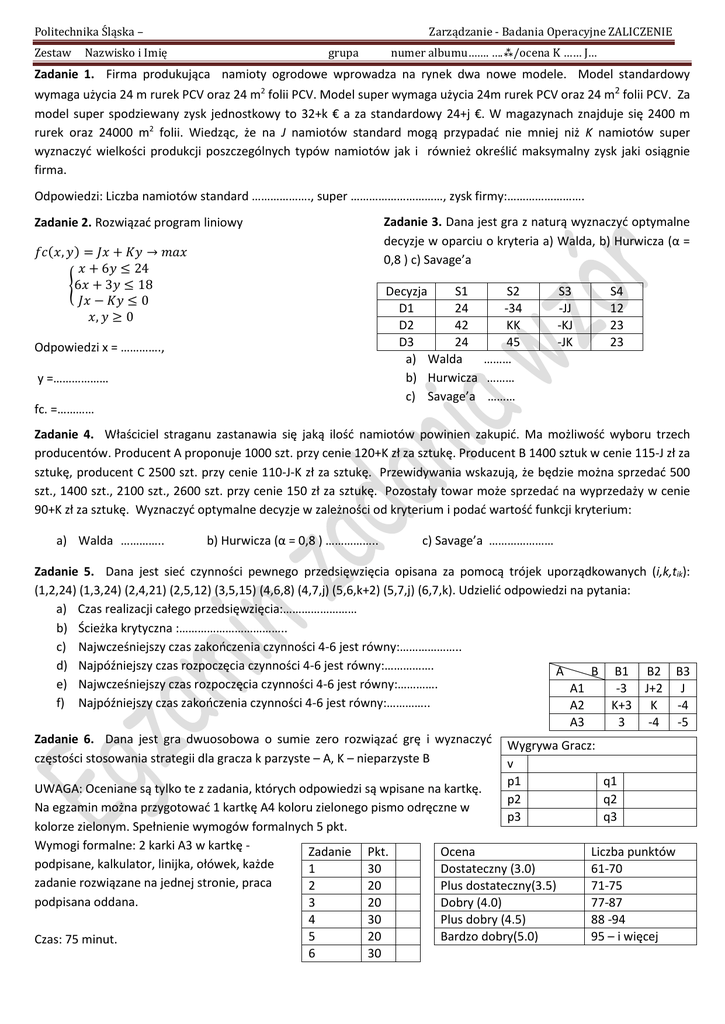 Zarządzanie - Badania Operacyjne ZALICZENIE