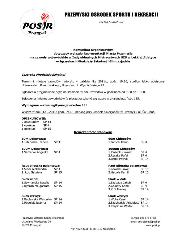 PRZEMYSKI OŚRODEK SPORTU I REKREACJI zakład budżetowy Komunikat Organizacyjny dotyczący wyjazdu Reprezentacji Miasta Przemyśla na zawody wojewódzkie w Indywidualnych Mistrzostwach SZS w Lekkiej Atletyce w Igrzyskach Młodzieży Szkolnej i Gimnazjadzie Igrzyska Młodzieży Szkolnej Termin i miejsce zawodów: wtorek, 4 października 2011r., godz. 10:30; stadion lekko atletyczny Uniwersytetu Rzeszowskiego; Rzeszów, ul. Wyspiańskiego 22. Zgłoszenia przyjmowane będą na stadionie w dniu zawodów w godzinach od 9:00 do 10:00. Zgłoszenia imienne zawodników (z pieczątką szkoły) wg wzoru w „Kalendarzu” str. 125. Wymagane ważne legitymacje szkolne ! ! ! Wyjazd w dniu 4.10.2011r godz. 7:30 - parking przy kościele Salezjanów w Przemyślu ul. Św. Jana. OPIEKUNOWIE: 2 opiekunów SP 14 1 opiekun SP 4 1 opiekun SP 15 Reprezentację stanowią: 60m Dziewcząt: 1.Jabłońska Izabela SP 4 600m Dziewcząt: 1.Semerko Angelika SP 4 60m Chłopców 1.Jaroch Jakub SP 4 1000m Chłopców 1.Piasecki Łukasz 2.Reszka Rafał 3.Babik Patryk SP 4 SP 4 SP 14 Rzut piłeczką palantową: 1.Sidor Aleksandra SP 4 2. Łuc Gabriela SP 15 Rzut piłeczką palantową: 1.Lewicki Paweł SP 15 2.Hadała Kamil SP 16 Skok w dal: 1.Szymańska Natalia 2.Ryczan Małgorzata Skok w dal: 1.Szabaga Jakub 2.Galanty Kamil 3.Król Maciej SP 14 SP 15 Skok wzwyż: 1.Pacławska Weronika SP 14 2.Podolak Justyna SP 14 SP 4 SP 4 SP 14 Skok wzwyż: 1.Wota Kamil SP 14 2.Szechyński Arkadiusz SP 14 3.Karpiński Wiktor SP 14 Przemyski Ośrodek Sportu i Rekreacji Ul. Adama Mickiewicza 30 37-700 Przemyśl tel./ fax. 016 678 57 58 email: [email protected] www.posir.pl NIP 795 236 44 86; REGON 180064865 Gimnazjada Termin i miejsce zawodów: środa, 5 października 2011r., godz. 10:30; stadion lekko atletyczny Uniwersytetu Rzeszowskiego; Rzeszów, ul. Wyspiańskiego 22. Zgłoszenia przyjmowane będą na stadionie w dniu zawodów w godzinach od 9:00 do 10:00. Zgłoszenia imienne zawodników (z pieczątką szkoły) wg wzoru w „Kalendarzu” str. 125. Wymagane ważne legitymacje szkolne ! ! ! Wyjazd w dniu 5.10.2011r godz. 7:30 - parking przy kościele Salezjanów w Przemyślu ul. Św. Jana. Reprezentację stanowią: 100m Dziewcząt: 1.Mazurkiewicz Aleksandra 2.Sura Karolina G5 G5 100m Chłopców: 1.Boćek Artur 2.Hendzel Kamil G5 G5 300m Dziewcząt: 1.Strzelec Justyna 2.Kopczak Ewa G5 G4 300m Chłopców: 1.Kukurski Piotr 2.Wilk Jakub G5 G5 600m Dziewcząt: 1.Wywrot Wiktoria 2.Sieczko Angelika G5 G5 1000m Chłopców: 1.Tarnawski Rafał 2.Gardy Kamil G1 G2 Sztafeta 4x100 Dziewcząt: G5 w składzie: 1.Hawro Kamila 2.Strzelec Justyna 3.Bąk Katarzyna 4.Sura Magdalena Sztafeta 4x100 Chłopców G5 w składzie: 1.Wilk Jakub 2.Boćek Artur 3.Kukurski Piotr 4.Hendzel Kamil Rzut oszczepem Dziewcząt: 1.Piechowicz Karolina G5 Rzut oszczepem Chłopców: 1.Gałęza Kamil G3 2.Iwanicki Beniamin G2 Skok w dal Dziewcząt: 1.Bublewicz Monika G2 Skok w dal Chłopców: 1.Moroz Adrian G4 Skok wzwyż Dziewcząt: 1.Kazienko Patrycja 2.Kuriańczyk Justyna G4 G5 Skok wzwyż Chłopców: 1.Lasek Kacper G5 2.Kwasiżur Kamil G3 Pchnięcie kulą Dziewcząt: 1.Droń Katarzyna G1 Pchnięcie kulą Chłopców: 1.Michta Michał G4 Rezerwa: Chickiewicz Sylwia Myszak Anna G4 G5 Rezerwa: Tryksza Karol Reszka Jakub Z list rankingowych Kukurski Piotr G5, Boćek Artur G5, Hamielc Marcin GSAILO. OPIEKUNOWIE: 2 opiekunów G5 1 opiekun G4 1 opiekun G2 1 ? opiekun G3 G5 GSAILO