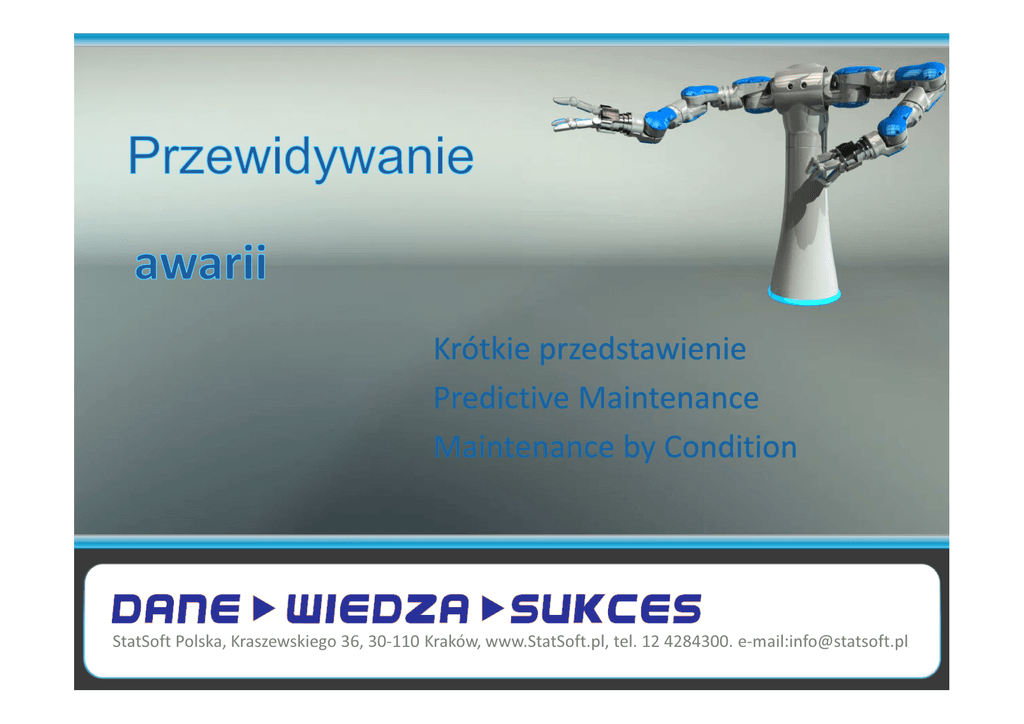 StatSoft Polska, Kraszewskiego 36, 30-110 Kraków, www.StatSoft.pl, tel. 12 4284300. e-mail:[email protected] Podejścia do utrzymania ■ Tradycyjne ■ Utrzymanie korekcyjne: zepsuło się to napraw ■ Obsługa profilaktyczna: napraw lub wymień wg harmonogramu (nawet jeśli działa i działało by jeszcze długo) ■ Nowe: przewidywanie awarii ■ Obsługa predykcyjna: co jakiś czas sprawdzamy stan maszyny i na podstawie danych i modelu określamy zagrożenie awarią ■ Obsługa wg stanu: w czasie rzeczywistym monitorujemy pracę urządzenia i na bieżąco szacujemy zagrożenie awarią © Copyright StatSoft Polska, 2013 Przewidywanie awarii - Zalety ■ Stosunkowo niskie koszty rozwiązania ■ Mniejsze koszty serwisów ■ Dokładniejsze określenie czasu prawidłowego działania ■ Wiedza ■ Optymalizacja ■ Działania wyprzedzające ■ Zapobieganie awariom ■ Mniejsze koszty przestojów ■ Przygotowanie się do nieuniknionego ■ rezerwowe źródło półproduktu ■ części zapasowe © Copyright StatSoft Polska, 2013 Dane do przewidywania ■ Dane z automatyki przemysłowej ■ Ustawienie i parametry ■ Wykorzystywane do sterowania procesem ■ Za odpowiedni okres ■ Informacje zbierane ręcznie ■ Analizy laboratoryjne ■ Dodatkowe mierniki on-line ■ Poziom wibracji, hałasu, temperatury itp. © Copyright StatSoft Polska, 2013 Metody przewidywania awarii ■ Analiza sekwencji zdarzeń ■ Gromadzimy dane o zdarzeniach (sygnałach) ■ Znajdujemy użyteczne reguły Przeciążenie siłownika i Duże wibracje → Awaria ■ Trudność: ogromna ilość potencjalnych reguł ■ Poszukiwanie charakterystycznych wzorców, przebiegów modele predykcyjne ■ Gromadzimy dane o parametrach pracy maszyny ■ Znajdujemy wzorce przebiegu zmian parametrów prowadzące do awarii określonego typu ■ Trudność: złożone zależności, wiele modeli dla różnych awarii © Copyright StatSoft Polska, 2013 Analiza sekwencji zdarzeń ID=1 ID=2 ID=3 ID=4 ID=5 © Copyright StatSoft Polska, 2013 Analiza sekwencji zdarzeń ID=1 ID=2 ID=3 ID=4 ID=5 © Copyright StatSoft Polska, 2013 Analiza sekwencji zdarzeń ID=1 ID=2 ID=3 ID=4 ID=5 © Copyright StatSoft Polska, 2013 Analiza sekwencji zdarzeń ID=1 ID=2 ID=3 ID=4 ID=5 © Copyright StatSoft Polska, 2013 Analiza sekwencji zdarzeń ID=1 ID=2 ID=3 ID=4 ID=5 ALARM !!! © Copyright StatSoft Polska, 2013 Modele predykcyjne ■ Nastawienie się na konkretną awarię ■ Zdefiniowany horyzont prognozy ■ Wynik - prawdopodobieństwo wystąpienia zdarzenia niepożądanego ■ Przykładowy scenariusz: ■ chcemy przewidywać awarię na 3 h przed wystąpieniem ■ zakładamy, że na wystąpienie awarii wpływa stan maszyny z poprzednich 12 godzin © Copyright StatSoft Polska, 2013 Modele predykcyjne PRZEBIEG HISTORYCZNY ID=1 ID=2 ID=3 ID=4 © Copyright StatSoft Polska, 2013 STAN PO 3h Modele predykcyjne PRZEBIEG HISTORYCZNY ID=1 ID=2 ID=3 ID=4 © Copyright StatSoft Polska, 2013 STAN PO 3h Modele predykcyjne PRZEBIEG HISTORYCZNY ID=1 ID=2 ID=3 ID=4 © Copyright StatSoft Polska, 2013 STAN PO 3h Modele predykcyjne - wdrożenie PRZEBIEG HISTORYCZNY ID=1 ID=2 ID=3 ID=4 © Copyright StatSoft Polska, 2013 STAN PO 3h System do przewidywania awarii © Copyright StatSoft Polska, 2013 Środowisko użytkownika © Copyright StatSoft Polska, 2013 Czego potrzebujemy aby przewidywać awarię? ■ Dane do modelowania i stosowania modelu ■ Baza danych ■ Mechanizm zbierania danych ■ Model lub reguły przewidujące awarie ■ Narzędzie do analizy danych ■ Duże zbiory danych ■ Skomplikowane zależności ■ Wiedza jak modelować ■ System powiadamiania o zagrożeniu awariami Oferta StatSoft Polska © Copyright StatSoft Polska, 2013 Oferta StatSoft Polska ■ Oprogramowanie z rodziny STATISTICA ■ Usługi ■ Szkolenia ■ Warsztaty ■ Tworzenie modeli ■ Wsparcie dla użytkowników ■ Systemy dedykowane ■ Zapraszamy na nasze stoisko! © Copyright StatSoft Polska, 2013 © Copyright StatSoft Polska, 2013