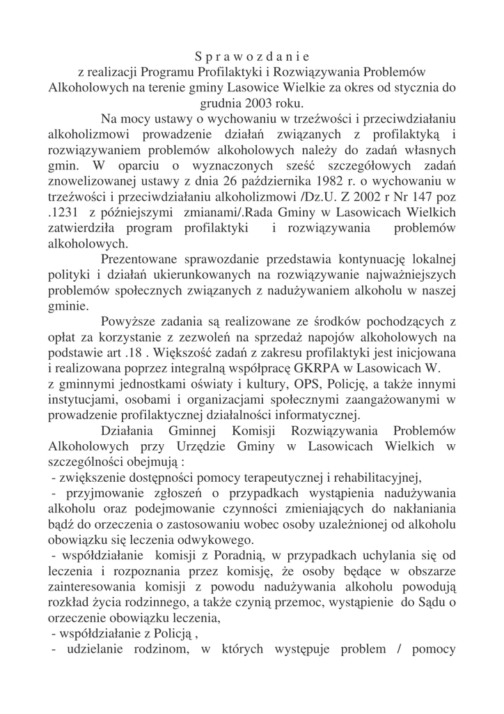 Sprawozdanie z realizacji Programu Profilaktyki i Rozwi zywania Problemów Alkoholowych na terenie gminy Lasowice Wielkie za okres od stycznia do grudnia 2003 roku. Na mocy ustawy o wychowaniu w trze wo ci i przeciwdziałaniu alkoholizmowi prowadzenie działa zwi zanych z profilaktyk i rozwi zywaniem problemów alkoholowych nale y do zada własnych gmin. W oparciu o wyznaczonych sze szczegółowych zada znowelizowanej ustawy z dnia 26 pa dziernika 1982 r. o wychowaniu w trze wo ci i przeciwdziałaniu alkoholizmowi /Dz.U. Z 2002 r Nr 147 poz .1231 z pó niejszymi zmianami/.Rada Gminy w Lasowicach Wielkich zatwierdziła program profilaktyki i rozwi zywania problemów alkoholowych. Prezentowane sprawozdanie przedstawia kontynuacj lokalnej polityki i działa ukierunkowanych na rozwi zywanie najwa niejszych problemów społecznych zwi zanych z nadu ywaniem alkoholu w naszej gminie. Powy sze zadania s realizowane ze rodków pochodz cych z opłat za korzystanie z zezwole na sprzeda napojów alkoholowych na podstawie art .18 . Wi kszo zada z zakresu profilaktyki jest inicjowana i realizowana poprzez integraln współprac GKRPA w Lasowicach W. z gminnymi jednostkami o wiaty i kultury, OPS, Policj , a tak e innymi instytucjami, osobami i organizacjami społecznymi zaanga owanymi w prowadzenie profilaktycznej działalno ci informatycznej. Działania Gminnej Komisji Rozwi zywania Problemów Alkoholowych przy Urz dzie Gminy w Lasowicach Wielkich w szczególno ci obejmuj : - zwi kszenie dost pno ci pomocy terapeutycznej i rehabilitacyjnej, - przyjmowanie zgłosze o przypadkach wyst pienia nadu ywania alkoholu oraz podejmowanie czynno ci zmieniaj cych do nakłaniania b d do orzeczenia o zastosowaniu wobec osoby uzale nionej od alkoholu obowi zku si leczenia odwykowego. - współdziałanie komisji z Poradni , w przypadkach uchylania si od leczenia i rozpoznania przez komisj , e osoby b d ce w obszarze zainteresowania komisji z powodu nadu ywania alkoholu powoduj rozkład ycia rodzinnego, a tak e czyni przemoc, wyst pienie do S du o orzeczenie obowi zku leczenia, - współdziałanie z Policj , - udzielanie rodzinom, w których wyst puje problem / pomocy psychologicznej, prawnej, materialnej, poprzez OPS, Policj ,S d / - udział członków GK w spotkaniach i szkoleniach, - kontrola przestrzegania zasad obrotu napojami alkoholowymi, - opiniowanie wniosków dotycz cych udzielania zezwole na sprzeda alkoholu, Posiedzenia Gminnej Komisji Rozwi zywania Problemów Alkoholowych w Lasowicach Wielkich odbywaj si w/g faktycznych potrzeb. Siedzib komisji jest UG w ramach którego prowadzona jest działalno konsultacyjno- motywuj ca i wspieraj ca dla osób chc cych si leczy . W skład Gminnej Komisji Rozwi zywania Problemów Alkoholowych wchodz osoby, które w sposób bezpo redni lub po redni w swojej działalno ci stykaj si z problemem alkoholowym. Działania Gminnej Komisji Rozwi zywania Problemów Alkoholowych w 2003 r. za okres od stycznia do grudnia zostały odzwierciedlone w bezpo rednich posiedzeniach: Stycze 1 posiedzenie Luty 2 posiedzenia Marzec 1 posiedzenie Maj 1 '' Czerwiec 1 '' Wrzesie 2 posiedzenia Listopad 1 posiedzenie Grudzie 2 posiedzenia Frekwencja członków komisji wynosiła 99 % w ci gu roku. Na posiedzeniach ogółem zaproszono 24 osób z tego wymiernych efektów było 14, na leczenie skierowano 4 osoby, do s du 6 zgon 1 wycofano wnioski 3 nie przybyło na posiedzenie 4 do poradni 3 wniosków otwartych nie zako czonych 6 , Ponadto komisja wsparła finansowo 12 osób, w dwóch przypadkach zapłacono pr d bezpo rednio w Zakładzie Energetycznym w Kluczborku. Komisja wydała 43 postanowie na sprzeda ró nych napojów alkoholowych. Zaopiniowała inne wydatki takie jak : - dofinansowanie do nagród turnieju szachowego - dofinansowanie do remontu szatni LZS Chocianowice, - opłacono nasz udział w ogólnopolskiej kampanii/Zachowaj Trze wy Umysł / - dofinansowanie do kolonii, - opłacono przejazdy inne opłaty /Piłkarska Kadra/ - dla klubu w W dryni zakupiono szachy i inne gry, - w Lasowicach i Chocianowicach w szkole odbyły si inscenizacje teatralne/Jak ja na to patrz / Dla wszystkich szkół zakupiono szachy , piłki, wiat 50 gier, wspierano tradycje wiejskie - wspólne biesiadowanie, spotkanie mieszka ców z s siednich miejscowo ci, wymiana pogl dów, asertywne zachowanie z pełn tradycj przy muzyce i wyst pach starszego pokolenia. Gminna Komisja Rozwi zywania Problemów Alkoholowych ci le współpracuje z Dzielnicowym naszego terenu. Odnotowano nast puj ce wykroczenia na terenie gminy w 2003 r.: - włamania do szkoły 1 - '' do mieszka 5 - '' gara y 1 - skradziono aut 3 - zniszczenie mieszka 1 - inne 10 Komenda Powiatowa Policji odnotowała w minionym roku 162 interwencje domowe. Stwierdzono w 137 przypadkach przemoc i zn canie si nad rodzin , które dotkn ło około 413 osób /ofiar/. W przewa aj cej wi kszo ci podło em było nadu ywanie alkoholu. Skala zjawiska przemocy domowej poza zaprezentowanymi wy ej faktami jest trudna do precyzyjnego okre lenia. Nie w ka dym przypadku prosz ca o pomoc policj przewa nie kobieta, chce ten fakt nagło ni powodowana strachem przed wi kszymi represjami lub wstydem. Według szacunków PARPA dzieci wychowuj ce si w rodzinach alkoholików stanowi około 4 % populacji w skali kraju. W przypadku Powiatu Kluczborskiego mo e to by około 1590 dzieci. Integraln cz ci niniejszego Programu jest Preliminarz wdatkowania rodków finansowych przeznaczonych na jego realizacj i tak : na Plan 101 340 00 zł. - wydatkowano 58 002 00 zł.