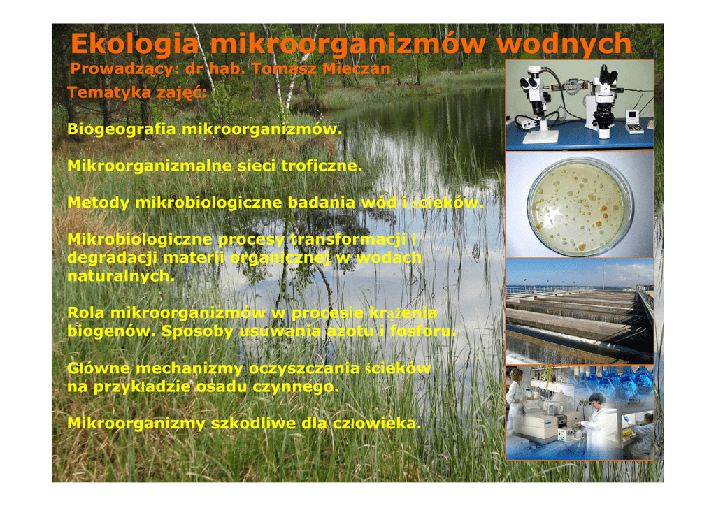 Ekologia mikroorganizmów wodnych Prowadzący: dr hab. Tomasz Mieczan Tematyka zajęć: Biogeografia mikroorganizmów. Mikroorganizmalne sieci troficzne. Metody mikrobiologiczne badania wód i ścieków. Mikrobiologiczne procesy transformacji i degradacji materii organicznej w wodach naturalnych. Rola mikroorganizmów w procesie krąŜenia biogenów. Sposoby usuwania azotu i fosforu. Główne mechanizmy oczyszczania ścieków na przykładzie osadu czynnego. Mikroorganizmy szkodliwe dla człowieka.
