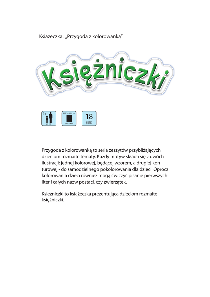 Książeczka: „Przygoda z kolorowanką” 4+ WIEK 28,7/20,5/0,2 cm WYMIARY 18 LICZBA STRON Przygoda z kolorowanką to seria zeszytów przybliżających dzieciom rozmaite tematy. Każdy motyw składa się z dwóch ilustracji: jednej kolorowej, będącej wzorem, a drugiej konturowej - do samodzielnego pokolorowania dla dzieci. Oprócz kolorowania dzieci również mogą ćwiczyć pisanie pierwszych liter i całych nazw postaci, czy zwierzątek. Księżniczki to książeczka prezentująca dzieciom rozmaite księżniczki.