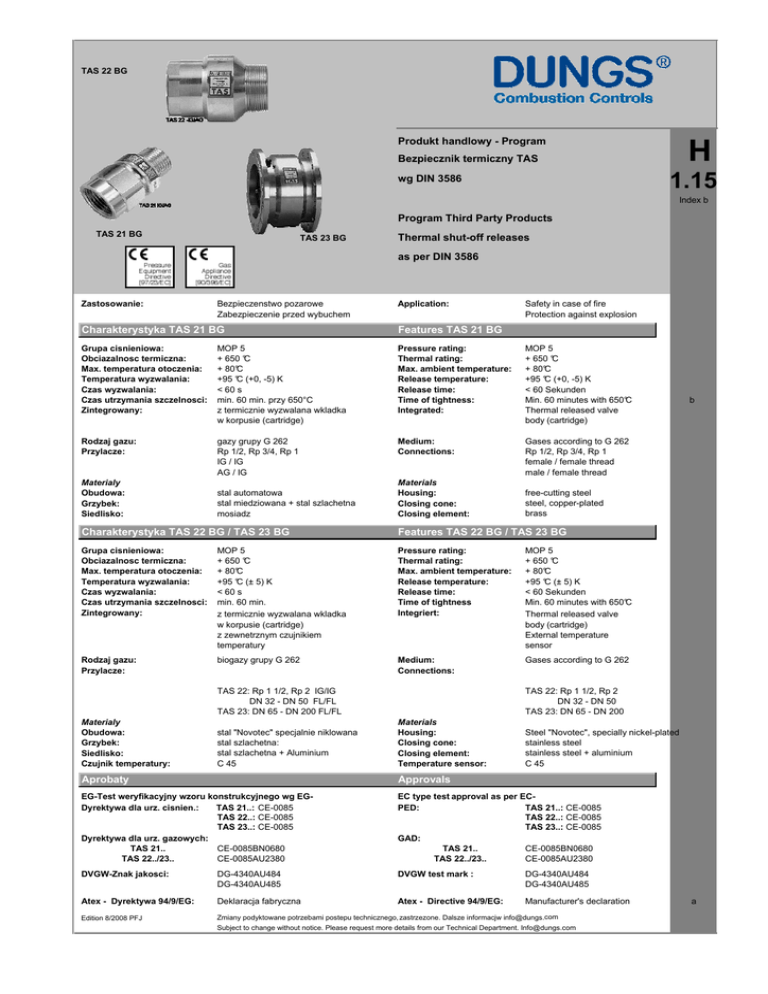 TAS 22 BG Produkt handlowy - Program H Bezpiecznik termiczny TAS 1.15 wg DIN 3586 Index b Program Third Party Products TAS 21 BG TAS 23 BG Thermal shut-off releases as per DIN 3586 Zastosowanie: Bezpieczenstwo pozarowe Zabezpieczenie przed wybuchem Application: Safety in case of fire Protection against explosion Charakterystyka TAS 21 BG Features TAS 21 BG Grupa cisnieniowa: Obciazalnosc termiczna: Max. temperatura otoczenia: Temperatura wyzwalania: Czas wyzwalania: Czas utrzymania szczelnosci: Zintegrowany: MOP 5 + 650 °C + 80°C +95 °C (+0, -5) K < 60 s min. 60 min. przy 650°C z termicznie wyzwalana wkladka w korpusie (cartridge) Pressure rating: Thermal rating: Max. ambient temperature: Release temperature: Release time: Time of tightness: Integrated: MOP 5 + 650 °C + 80°C +95 °C (+0, -5) K < 60 Sekunden Min. 60 minutes with 650°C Thermal released valve body (cartridge) Rodzaj gazu: Przylacze: gazy grupy G 262 Rp 1/2, Rp 3/4, Rp 1 IG / IG AG / IG Medium: Connections: Gases according to G 262 Rp 1/2, Rp 3/4, Rp 1 female / female thread male / female thread Materialy Obudowa: Grzybek: Siedlisko: stal automatowa stal miedziowana + stal szlachetna mosiadz Materials Housing: Closing cone: Closing element: free-cutting steel steel, copper-plated brass Charakterystyka TAS 22 BG / TAS 23 BG Features TAS 22 BG / TAS 23 BG Grupa cisnieniowa: Obciazalnosc termiczna: Max. temperatura otoczenia: Temperatura wyzwalania: Czas wyzwalania: Czas utrzymania szczelnosci: Zintegrowany: MOP 5 + 650 °C + 80°C +95 °C (± 5) K < 60 s min. 60 min. z termicznie wyzwalana wkladka w korpusie (cartridge) z zewnetrznym czujnikiem temperatury Pressure rating: Thermal rating: Max. ambient temperature: Release temperature: Release time: Time of tightness Integriert: MOP 5 + 650 °C + 80°C +95 °C (± 5) K < 60 Sekunden Min. 60 minutes with 650°C Thermal released valve body (cartridge) External temperature sensor Rodzaj gazu: Przylacze: biogazy grupy G 262 Medium: Connections: Gases according to G 262 TAS 22: Rp 1 1/2, Rp 2 DN 32 - DN 50 TAS 23: DN 65 - DN 200 TAS 22: Rp 1 1/2, Rp 2 IG/IG DN 32 - DN 50 FL/FL TAS 23: DN 65 - DN 200 FL/FL Materialy Obudowa: Grzybek: Siedlisko: Czujnik temperatury: stal "Novotec" specjalnie niklowana stal szlachetna: stal szlachetna + Aluminium C 45 b Materials Housing: Closing cone: Closing element: Temperature sensor: Steel "Novotec", specially nickel-plated stainless steel stainless steel + aluminium C 45 Aprobaty Approvals EG-Test weryfikacyjny wzoru konstrukcyjnego wg EGDyrektywa dla urz. cisnien.: TAS 21..: CE-0085 TAS 22..: CE-0085 TAS 23..: CE-0085 Dyrektywa dla urz. gazowych: TAS 21.. CE-0085BN0680 TAS 22../23.. CE-0085AU2380 EC type test approval as per ECPED: TAS 21..: CE-0085 TAS 22..: CE-0085 TAS 23..: CE-0085 GAD: TAS 21.. CE-0085BN0680 TAS 22../23.. CE-0085AU2380 DVGW-Znak jakosci: DG-4340AU484 DG-4340AU485 DVGW test mark : DG-4340AU484 DG-4340AU485 Atex - Dyrektywa 94/9/EG: Deklaracja fabryczna Atex - Directive 94/9/EG: Manufacturer's declaration Edition 8/2008 PFJ Zmiany podyktowane potrzebami postepu technicznego, zastrzezone. Dalsze informacjw [email protected] Subject to change without notice. Please request more details from our Technical Department. [email protected] a