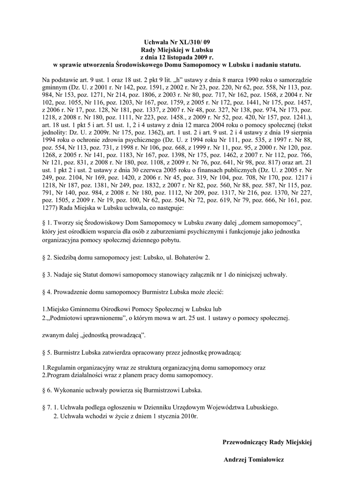 Uchwała Nr XL/310/ 09 Rady Miejskiej w Lubsku z dnia 12 listopada 2009 r. w sprawie utworzenia Środowiskowego Domu Samopomocy w Lubsku i nadaniu statutu. Na podstawie art. 9 ust. 1 oraz 18 ust. 2 pkt 9 lit. „h” ustawy z dnia 8 marca 1990 roku o samorządzie gminnym (Dz. U. z 2001 r. Nr 142, poz. 1591, z 2002 r. Nr 23, poz. 220, Nr 62, poz. 558, Nr 113, poz. 984, Nr 153, poz. 1271, Nr 214, poz. 1806, z 2003 r. Nr 80, poz. 717, Nr 162, poz. 1568, z 2004 r. Nr 102, poz. 1055, Nr 116, poz. 1203, Nr 167, poz. 1759, z 2005 r. Nr 172, poz. 1441, Nr 175, poz. 1457, z 2006 r. Nr 17, poz. 128, Nr 181, poz. 1337, z 2007 r. Nr 48, poz. 327, Nr 138, poz. 974, Nr 173, poz. 1218, z 2008 r. Nr 180, poz. 1111, Nr 223, poz. 1458., z 2009 r. Nr 52, poz. 420, Nr 157, poz. 1241.), art. 18 ust. 1 pkt 5 i art. 51 ust. 1, 2 i 4 ustawy z dnia 12 marca 2004 roku o pomocy społecznej (tekst jednolity: Dz. U. z 2009r. Nr 175, poz. 1362), art. 1 ust. 2 i art. 9 ust. 2 i 4 ustawy z dnia 19 sierpnia 1994 roku o ochronie zdrowia psychicznego (Dz. U. z 1994 roku Nr 111, poz. 535, z 1997 r. Nr 88, poz. 554, Nr 113, poz. 731, z 1998 r. Nr 106, poz. 668, z 1999 r. Nr 11, poz. 95, z 2000 r. Nr 120, poz. 1268, z 2005 r. Nr 141, poz. 1183, Nr 167, poz. 1398, Nr 175, poz. 1462, z 2007 r. Nr 112, poz. 766, Nr 121, poz. 831, z 2008 r. Nr 180, poz. 1108, z 2009 r. Nr 76, poz. 641, Nr 98, poz. 817) oraz art. 21 ust. 1 pkt 2 i ust. 2 ustawy z dnia 30 czerwca 2005 roku o finansach publicznych (Dz. U. z 2005 r. Nr 249, poz. 2104, Nr 169, poz. 1420, z 2006 r. Nr 45, poz. 319, Nr 104, poz. 708, Nr 170, poz. 1217 i 1218, Nr 187, poz. 1381, Nr 249, poz. 1832, z 2007 r. Nr 82, poz. 560, Nr 88, poz. 587, Nr 115, poz. 791, Nr 140, poz. 984, z 2008 r. Nr 180, poz. 1112, Nr 209, poz. 1317, Nr 216, poz. 1370, Nr 227, poz. 1505, z 2009 r. Nr 19, poz. 100, Nr 62, poz. 504, Nr 72, poz. 619, Nr 79, poz. 666, Nr 161, poz. 1277) Rada Miejska w Lubsku uchwala, co następuje: § 1. Tworzy się Środowiskowy Dom Samopomocy w Lubsku zwany dalej „domem samopomocy”, który jest ośrodkiem wsparcia dla osób z zaburzeniami psychicznymi i funkcjonuje jako jednostka organizacyjna pomocy społecznej dziennego pobytu. § 2. Siedzibą domu samopomocy jest: Lubsko, ul. Bohaterów 2. § 3. Nadaje się Statut domowi samopomocy stanowiący załącznik nr 1 do niniejszej uchwały. § 4. Prowadzenie domu samopomocy Burmistrz Lubska moŜe zlecić: 1.Miejsko Gminnemu Ośrodkowi Pomocy Społecznej w Lubsku lub 2.„Podmiotowi uprawnionemu”, o którym mowa w art. 25 ust. 1 ustawy o pomocy społecznej. zwanym dalej „jednostką prowadzącą”. § 5. Burmistrz Lubska zatwierdza opracowany przez jednostkę prowadzącą: 1.Regulamin organizacyjny wraz ze strukturą organizacyjną domu samopomocy oraz 2.Program działalności wraz z planem pracy domu samopomocy. § 6. Wykonanie uchwały powierza się Burmistrzowi Lubska. § 7. 1. Uchwała podlega ogłoszeniu w Dzienniku Urzędowym Województwa Lubuskiego. 2. Uchwała wchodzi w Ŝycie z dniem 1 stycznia 2010r. Przewodniczący Rady Miejskiej Andrzej Tomiałowicz Uzasadnienie Zgodnie z obowiązującymi przepisami prawa, tj. ustawy o pomocy społecznej oraz ustawy o ochronie zdrowia psychicznego, struktury rządowe i samorządowe zobowiązane są do uczestnictwa w organizowaniu ośrodków wsparcia dla osób z zaburzeniami psychicznymi, które w wyniku upośledzenia niektórych funkcji organizmu lub zdolności adaptacyjnych wymagają pomocy do Ŝycia w środowisku rodzinnym i społecznym, w szczególności w celu zwiększenia zaradności i samodzielności Ŝyciowej, a takŜe ich integracji społecznej. Prowadzenie i rozwój infrastruktury Środowiskowych Domów Samopomocy dla osób z zaburzeniami psychicznymi naleŜy do zadań zleconych z zakresu administracji rządowej realizowanych przez gminę. Środki na realizację i obsługę zadania zapewnia budŜet państwa. Projekt utworzenia Środowiskowego Domu Samopomocy mającego funkcjonować przy ul. Bohaterów 2 w Lubsku (na 16 miejsc) został pozytywnie zaopiniowany przez Wydział Polityki Społecznej Lubuskiego Urzędu Wojewódzkiego w Gorzowie Wlkp., a następnie przez Ministerstwo Pracy i Polityki Społecznej, które w bieŜącym roku przyznało nam środki finansowe w wysokości 146.200 zł na remont i wyposaŜenie pomieszczeń celem przystosowania ich do funkcjonowania Domu. Plan finansowy dla Środowiskowego Domu Samopomocy zostanie uchwalony po przekazaniu decyzji Wojewody o przyznaniu środków finansowych na przedmiotowe zadanie. Termin uruchomienia miejsc oraz przyjmowania uczestników do Środowiskowego Domu Samopomocy w Lubsku planowany jest na miesiąc styczeń 2010 r.
