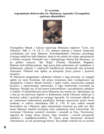 21 września wspomnienie dobrowolne św. Mateusza, Apostoła i Ewangelisty - patrona alkoholików Ewangeliści Marek i Łukasz nazywają Mateusza najpierw "Lewi, syn Alfeusza" (Mk 2, 14; Łk 5, 27), dopiero później z innych miejscach wymieniane jest imię Mateusz. Prawdopodobnie Chrystus powołując Lewiego nadał mu imię Mateusz. Imię to nie należy do często spotykanych w Piśmie świętym. Pochodzi ono z hebrajskiego Mattaj lub Mattanja, co po polsku oznacza "dar Boga" (Teodor, Deusdedit, Bogdan). Mateusz był Galilejczykiem. Jego pracą było pobieranie ceł i podatków w Kafarnaum, jednym z większych handlowych miasteczek nad jeziorem Genezaret. Pobierał tam opłaty za przejazdy przez jezioro i przewóz towarów. W Palestynie pogardzano celnikami właśnie z tego powodu, że ściągali opłaty na rzecz Rzymian. Ich pracę rozumiano jako wysługiwanie się okupantom. Celnicy słynęli również z żądzy zysku, nieuczciwie czerpali korzyści z zajmowanego stanowiska. Z tego środowiska wywodził się Mateusz. Wydaje się, że był nawet kierownikiem i naczelnikiem celników w Galilei. O młodzieńczym życiu Mateusza nie wiemy nic. Spotykamy się z nim po raz pierwszy dopiero w Kafarnaum, kiedy Chrystus zastał go w komorze celnej i powołał na swojego Apostoła. To wezwanie odbyło się po cudownym uzdrowieniu paralityka, którego spuszczono przez otwór zrobiony w suficie mieszkania (Mt 9, 1-8). O tym cudzie musiał dowiedzieć się i Mateusz, gdyż natychmiast rozniosły go setki ust. Być może Mateusz słuchał wcześniej mów pokutnych Jana Chrzciciela. Na wezwanie Chrystusa zostawił wszystko i poszedł za Nim. Nawrócony, zaprosił do swego domu Jezusa, Jego uczniów i swoich przyjaciół: celników i współpracowników. W czasie uczty faryzeusze zarzucili Chrystusowi, że nie przestrzega Prawa. Ten jednak wstawił się za swoimi 1 współbiesiadnikami. Odtąd Mateusz pozostał już w gronie Dwunastu Apostołów. Po Wniebowstąpieniu Chrystusa Mateusz przez jakiś czas pozostał w Palestynie. Apostołował wśród nawróconych z judaizmu. Dla nich też przeznaczył napisaną przez siebie księgę Ewangelii. Napisał ją między 50 a 60 rokiem, najprawdopodobniej ok. 55 r. Starał się w niej wykazać, że to właśnie Chrystus jest wyczekiwanym od dawna Mesjaszem, że na Nim potwierdziły się proroctwa i zapowiedzi Starego Testamentu. Mateusz przekazał wiele szczegółów z życia i nauki Jezusa, których nie znajdziemy w innych Ewangeliach: np. rozbudowany tekst Kazania na Górze, przypowieść o kąkolu, o ukrytym skarbie, o drogocennej perle, o dziesięciu pannach. On jeden podał wydarzenie o pokłonie Magów i rzezi niewiniątek, o ucieczce do Egiptu, a także wizję sądu ostatecznego. Mateusz udał się później między pogan. Ojcowie Kościoła nie są zgodni dokąd. Wyliczają Etiopię, Pont, Persję, Syrię i Macedonię. Najbardziej prawdopodobna jest jednak Etiopia. Relikwie Mateusza miały być przewiezione ze Wschodu do Paestum (Pasidonii) w Italii. Jego ciało przewieziono do Italii w X w. Znajduje się ono obecnie w Salerno w dolnym kościele, wspaniale ozdobionym marmurami i mozaikami. Mateusz uznawany jest za męczennika. W ikonografii św. Mateusz był przedstawiany w postaci młodzieńca, później - zwłaszcza w sztuce bizantyjskiej - jako siwowłosy, stary mężczyzna. W sztuce zachodniej od czasów średniowiecza dominuje obraz silnie zbudowanego, brodatego mężczyzny w średnim wieku. Ubrany bywa w tradycyjną długą, białą suknię apostolską i w tunikę. Bywa także ukazywany w postawie siedzącej, kiedy pisze - przy nim stoi anioł, przekazujący natchnienie. Jego atrybutami są: księga i pióro, miecz lub halabarda, postać uskrzydlonego młodzieńca, sakwa z pieniędzmi u stóp, torba podróżna. Modlitwy: Święty Mateuszu Apostole, z jawnogrzesznika, jawny Wyznawco Boga prawdziwego, do niego prędko nawrócony, będąc przykuły do skarbów, i zdzierstwa, po tym do Jezusa przywiązałeś się tak mocno, żeś ani śmiercią jest oderwany. Proszę cię Święty Apostole, niech za twoją świętą przyczyną, oderwę się od wszystkiego, co mi przeszkadza złączyć się z Bogiem. Niech Boga mego powołania, i natchnienia słucham, jakoś ty słuchał zawołany będąc: Pójdź za mną, Święty Ewangelisto, i Kanclerzu 2 Boga Wcielonego Jezusa Chrystusa, zapisz życie, akcje i śmierć jego w sercu moim, i w pamięci, żebym według życia Jezusowego żyjąc, był (była) mu podobnym, (podobną,) i zbawienie otrzymał (otrzymała). Nawróć i mnie grzesznego (grzeszną) do Boga jakoś nawrócił cały dom Królewski w Murzyńskim Państwie; dopomóż, żebym tu opłakał (opłakała) grzechy moje a potym poszedł (poszła) na wesele wieczne, Amen. Kyrie elejson, Chryste elejson, Kyrie elejson. Chryste, usłysz nas, Chryste, wysłuchaj nas. Ojcze z nieba, Boże, - zmiłuj się nad nami. Synu, Odkupicielu świata, Boże, Duchu Święty, Boże, Święta Trójco, Jedyny Boże, Święta Maryjo, - módl się za nami. Królowo Apostołów, Królowo Męczenników, Święty Mateuszu Apostole, Święty Mateuszu Ewangelisto, Święty Mateuszu Męczenniku, Potrójna korono, Wzorze gościnności, Gorliwy kaznodziejo, Nauczycielu wiary, Nauczycielu mądrości, Wierny uczniu Chrystusa, Patronie celników, Patronie alkoholików, Opiekunie kapłanów, Poprzedniku biskupów, Współpracowniku świętego Piotra, Posłańcu miłosierdzia, Posłańcu przebaczenia, Posłańcu miłości, Gotowy na cierpienia, Świadku pokory ewangelicznej, Wzorze wytrwałości, Wzorze nawracania grzeszników, 3 Wzorze powołania chrześcijańskiego, Wzorze dusz konsekrowanych, Wybrany Synu Maryi, Gorliwy w modlitwie, Przykładzie mocy, Przykładzie odwagi, Przykładzie wytrwałości, Przykładzie ubóstwa, Przykładzie posłuszeństwa, Przykładzie cierpliwości, Światło Chrystusa między ludźmi, Uległy sługo powołania bożego, Drogo, która prowadzi do Pana, Stra