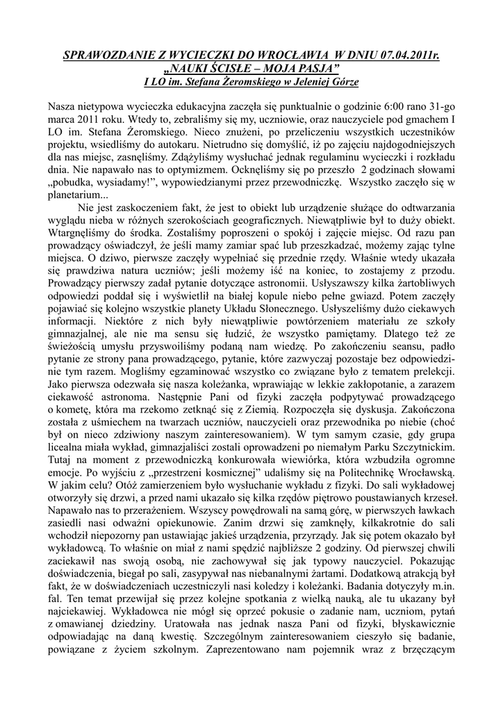 SPRAWOZDANIE Z WYCIECZKI DO WROCŁAWIA W DNIU 07.04.2011r. „NAUKI ŚCISŁE – MOJA PASJA” I LO im. Stefana śeromskiego w Jeleniej Górze Nasza nietypowa wycieczka edukacyjna zaczęła się punktualnie o godzinie 6:00 rano 31-go marca 2011 roku. Wtedy to, zebraliśmy się my, uczniowie, oraz nauczyciele pod gmachem I LO im. Stefana śeromskiego. Nieco znuŜeni, po przeliczeniu wszystkich uczestników projektu, wsiedliśmy do autokaru. Nietrudno się domyślić, iŜ po zajęciu najdogodniejszych dla nas miejsc, zasnęliśmy. ZdąŜyliśmy wysłuchać jednak regulaminu wycieczki i rozkładu dnia. Nie napawało nas to optymizmem. Ocknęliśmy się po przeszło 2 godzinach słowami „pobudka, wysiadamy!”, wypowiedzianymi przez przewodniczkę. Wszystko zaczęło się w planetarium... Nie jest zaskoczeniem fakt, Ŝe jest to obiekt lub urządzenie słuŜące do odtwarzania wyglądu nieba w róŜnych szerokościach geograficznych. Niewątpliwie był to duŜy obiekt. Wtargnęliśmy do środka. Zostaliśmy poproszeni o spokój i zajęcie miejsc. Od razu pan prowadzący oświadczył, Ŝe jeśli mamy zamiar spać lub przeszkadzać, moŜemy zając tylne miejsca. O dziwo, pierwsze zaczęły wypełniać się przednie rzędy. Właśnie wtedy ukazała się prawdziwa natura uczniów; jeśli moŜemy iść na koniec, to zostajemy z przodu. Prowadzący pierwszy zadał pytanie dotyczące astronomii. Usłyszawszy kilka Ŝartobliwych odpowiedzi poddał się i wyświetlił na białej kopule niebo pełne gwiazd. Potem zaczęły pojawiać się kolejno wszystkie planety Układu Słonecznego. Usłyszeliśmy duŜo ciekawych informacji. Niektóre z nich były niewątpliwie powtórzeniem materiału ze szkoły gimnazjalnej, ale nie ma sensu się łudzić, Ŝe wszystko pamiętamy. Dlatego teŜ ze świeŜością umysłu przyswoiliśmy podaną nam wiedzę. Po zakończeniu seansu, padło pytanie ze strony pana prowadzącego, pytanie, które zazwyczaj pozostaje bez odpowiedzinie tym razem. Mogliśmy egzaminować wszystko co związane było z tematem prelekcji. Jako pierwsza odezwała się nasza koleŜanka, wprawiając w lekkie zakłopotanie, a zarazem ciekawość astronoma. Następnie Pani od fizyki zaczęła podpytywać prowadzącego o kometę, która ma rzekomo zetknąć się z Ziemią. Rozpoczęła się dyskusja. Zakończona została z uśmiechem na twarzach uczniów, nauczycieli oraz przewodnika po niebie (choć był on nieco zdziwiony naszym zainteresowaniem). W tym samym czasie, gdy grupa licealna miała wykład, gimnazjaliści zostali oprowadzeni po niemałym Parku Szczytnickim. Tutaj na moment z przewodniczką konkurowała wiewiórka, która wzbudziła ogromne emocje. Po wyjściu z „przestrzeni kosmicznej” udaliśmy się na Politechnikę Wrocławską. W jakim celu? OtóŜ zamierzeniem było wysłuchanie wykładu z fizyki. Do sali wykładowej otworzyły się drzwi, a przed nami ukazało się kilka rzędów piętrowo poustawianych krzeseł. Napawało nas to przeraŜeniem. Wszyscy powędrowali na samą górę, w pierwszych ławkach zasiedli nasi odwaŜni opiekunowie. Zanim drzwi się zamknęły, kilkakrotnie do sali wchodził niepozorny pan ustawiając jakieś urządzenia, przyrządy. Jak się potem okazało był wykładowcą. To właśnie on miał z nami spędzić najbliŜsze 2 godziny. Od pierwszej chwili zaciekawił nas swoją osobą, nie zachowywał się jak typowy nauczyciel. Pokazując doświadczenia, biegał po sali, zasypywał nas niebanalnymi Ŝartami. Dodatkową atrakcją był fakt, Ŝe w doświadczeniach uczestniczyli nasi koledzy i koleŜanki. Badania dotyczyły m.in. fal. Ten temat przewijał się przez kolejne spotkania z wielką nauką, ale tu ukazany był najciekawiej. Wykładowca nie mógł się oprzeć pokusie o zadanie nam, uczniom, pytań z omawianej dziedziny. Uratowała nas jednak nasza Pani od fizyki, błyskawicznie odpowiadając na daną kwestię. Szczególnym zainteresowaniem cieszyło się badanie, powiązane z Ŝyciem szkolnym. Zaprezentowano nam pojemnik wraz z brzęczącym dzwonkiem. Ten sam, który mamy zaszczyt słuchać po zakończeniu kaŜdej lekcji. Po wypompowaniu powietrza- ucichł. Znajdował się w próŜni. Wykładowca udzielił nam cennej wskazówki, co musimy zrobić, aby przerwa trwała bez końca... NaleŜy odpompować powietrze z korytarza szkolnego. To rzeczywiście bardzo proste. Jednak pan profesor nas ostrzegł, co się stanie, gdy tak uczynimy. Wszyscy patrzyli z zaciekawieniem, myśląc o konsekwencjach. Zostały one zaprezentowane na balonie, który miał symbolizować nauczyciela. Wywołało to ogromny śmiech wśród uczniów. Okazało się, Ŝe w miarę zabierania tlenu z pojemnika balon zwiększał swoje rozmiary. My, młodzieŜ szkolna, nie byliśmy w stanie utrzymać powaŜnych min oraz powstrzymać się od łez. Ciekawe równieŜ okazało się doświadczenie, w którym to butelka po soku była wystrzelona z „rakiety”. Na szczęście Ŝadne okno ani lampa na tym nie ucierpiały. PoŜegnaliśmy pana gromkimi brawami, ze szczęściem promieniującym z naszej twarzy. Zadowoleni udaliśmy się na obiad. KaŜdy ze smakiem zjadł 2 dania i popił je kompotem. Ruszyliśmy na podbój wydziału chemii Uniwersytetu Wrocławskiego. Tam przywitał nas profesor wraz kilkoma pracownikami laboratorium. Powrócił temat fal, tylko Ŝe w wydaniu chemicznym. Wspomniano o fluorescencji, czyli zjawisku emitowania światła przez wzbudzony atom lub cząsteczkę. Niektórym prześwietlono zęby w celu sprawdzenia ich zdrowia. Powiedziano nam równieŜ w jaki sposób zabezpieczane są pieniądze przed kradzieŜą. Następnie pokazano nam „chemiczny ogródek” oraz „wulkan”. Zachwyciło to równieŜ naszych opiekunów. W końcu dowiedzieliśmy się, w jaki sposób i czym jest „sztuczna krew”, wywołująca przeraŜenie widzów podczas oglądania filmu. To nie jest ketchup! Proszę mi wierzyć. Na koniec otrzymaliśmy cenne rady, w jaki sposób moŜemy sami zrobi