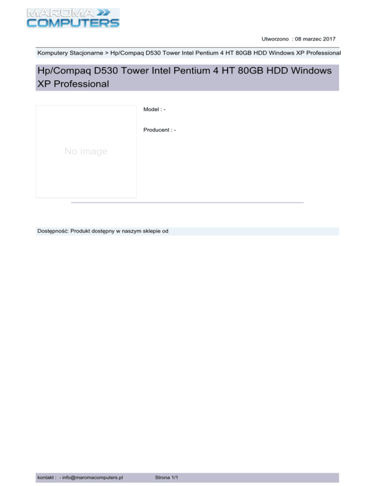 Utworzono : 08 marzec 2017 Komputery Stacjonarne > Hp/Compaq D530 Tower Intel Pentium 4 HT 80GB HDD Windows XP Professional Hp/Compaq D530 Tower Intel Pentium 4 HT 80GB HDD Windows XP Professional Model : - s r te Producent : - No image C a Dostępność: Produkt dostępny w naszym sklepie od m ro a M kontakt : - [email protected] Strona 1/1 m o u p