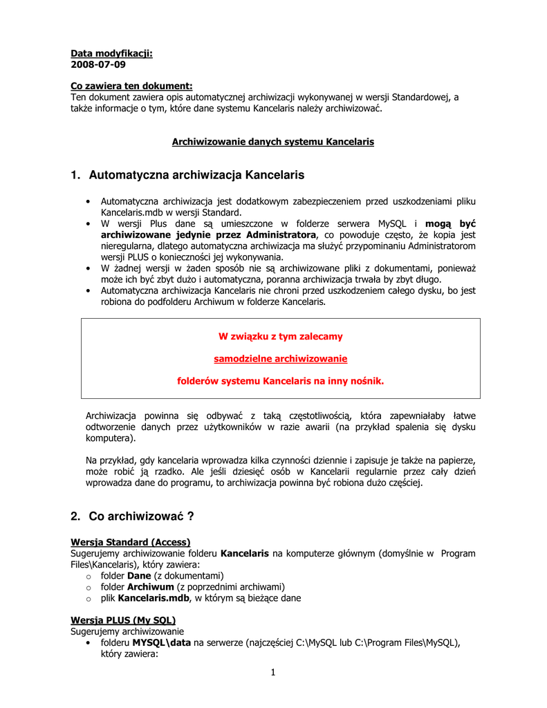 Data modyfikacji: 2008-07-09 Co zawiera ten dokument: Ten dokument zawiera opis automatycznej archiwizacji wykonywanej w wersji Standardowej, a także informacje o tym, które dane systemu Kancelaris należy archiwizować. Archiwizowanie danych systemu Kancelaris 1. Automatyczna archiwizacja Kancelaris • • • • Automatyczna archiwizacja jest dodatkowym zabezpieczeniem przed uszkodzeniami pliku Kancelaris.mdb w wersji Standard. W wersji Plus dane są umieszczone w folderze serwera MySQL i mogą być archiwizowane jedynie przez Administratora, co powoduje często, że kopia jest nieregularna, dlatego automatyczna archiwizacja ma służyć przypominaniu Administratorom wersji PLUS o konieczności jej wykonywania. W żadnej wersji w żaden sposób nie są archiwizowane pliki z dokumentami, ponieważ może ich być zbyt dużo i automatyczna, poranna archiwizacja trwała by zbyt długo. Automatyczna archiwizacja Kancelaris nie chroni przed uszkodzeniem całego dysku, bo jest robiona do podfolderu Archiwum w folderze Kancelaris. W związku z tym zalecamy samodzielne archiwizowanie folderów systemu Kancelaris na inny nośnik. Archiwizacja powinna się odbywać z taką częstotliwością, która zapewniałaby łatwe odtworzenie danych przez użytkowników w razie awarii (na przykład spalenia się dysku komputera). Na przykład, gdy kancelaria wprowadza kilka czynności dziennie i zapisuje je także na papierze, może robić ją rzadko. Ale jeśli dziesięć osób w Kancelarii regularnie przez cały dzień wprowadza dane do programu, to archiwizacja powinna być robiona dużo częściej. 2. Co archiwizować ? Wersja Standard (Access) Sugerujemy archiwizowanie folderu Kancelaris na komputerze głównym (domyślnie w Program Files\Kancelaris), który zawiera: o folder Dane (z dokumentami) o folder Archiwum (z poprzednimi archiwami) o plik Kancelaris.mdb, w którym są bieżące dane Wersja PLUS (My SQL) Sugerujemy archiwizowanie • folderu MYSQL\data na serwerze (najczęściej C:\MySQL lub C:\Program Files\MySQL), który zawiera: 1 • o folder Kancelaris (ze schematem bazy (pliki .frm) o plik ibdataNN z danymi folderu wskazanego w trakcie instalacji pierwszego stanowiska jako ten, w którym będą przechowywane dane (można odczytać w rejestrach w kluczu HKLM\Software\Kancelaris\Folder), który zawiera: o folder Dane (z dokumentami) o folder Archiwum o folder Raporty o plik Kancelaris.dat 3. Jak archiwizować ? • • • Można korzystać z systemowych narzędzi do robienia kopii zapasowych. Istnieje wiele komercyjnych programów do automatycznej archiwizacji. Można napisać skrypt z rozszerzeniem .bat i uruchamiać w razie potrzeby. rem usuniecie starego archiwum (folder archiwum na komputerze Kancelaris) rmdir /S /Q \\archiwum\kanc rem archiwizacja Kancelaris dla wersji Standard xcopy \\serwer\kancelaris\*.* \\archiwum\ kanc\ /E /C /F /H /K 2>err.txt plik err.txt, który powstaje w wyniku uruchomienia tego skryptu zawiera ewentualne komunikaty o błędach w czasie kopiowania (powinien być pusty przy poprawnym skopiowaniu). 2