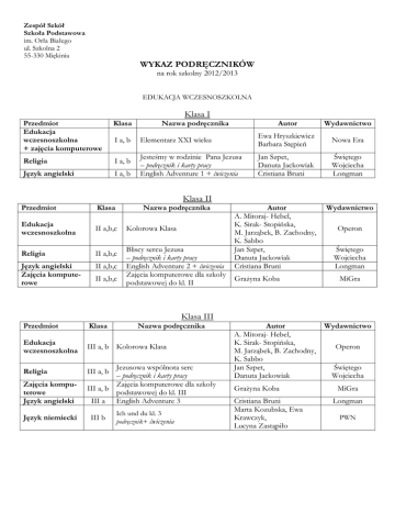 Zespół Szkół Szkoła Podstawowa im. Orła Białego ul. Szkolna 2 55-330 Miękinia WYKAZ PODRĘCZNIKÓW na rok szkolny 2012/2013 EDUKACJA WCZESNOSZKOLNA Klasa I Przedmiot Edukacja wczesnoszkolna + zajęcia komputerowe Klasa Religia I a, b Język angielski I a, b I a, b Nazwa podręcznika Autor Wydawnictwo Elementarz XXI wieku Ewa Hryszkiewicz Barbara Stępień Nowa Era Jesteśmy w rodzinie Pana Jezusa – podręcznik i karty pracy English Adventure 1 + ćwiczenia Jan Szpet, Danuta Jackowiak Cristiana Bruni Świętego Wojciecha Longman Klasa II Przedmiot Klasa Nazwa podręcznika Edukacja wczesnoszkolna II a,b,c Religia II a,b,c Język angielski Zajęcia komputerowe II a,b,c II a,b,c Kolorowa Klasa Bliscy sercu Jezusa – podręcznik i karty pracy English Adventure 2 + ćwiczenia Zajęcia komputerowe dla szkoły podstawowej do kl. II Autor A. Mitoraj- Hebel, K. Sirak- Stopińska, M. Jarząbek, B. Zachodny, K. Sabbo Jan Szpet, Danuta Jackowiak Cristiana Bruni Grażyna Koba Wydawnictwo Operon Świętego Wojciecha Longman MiGra Klasa III Przedmiot Klasa Edukacja wczesnoszkolna III a, b Kolorowa Klasa Religia III a, b Zajęcia komputerowe Język angielski Język niemiecki Nazwa podręcznika Jezusowa wspólnota serc – podręcznik i karty pracy Zajęcia komputerowe dla szkoły III a, b podstawowej do kl. III III a English Adventure 3 III b Ich und du kl. 3 podręcznik+ ćwiczenia Autor A. Mitoraj- Hebel, K. Sirak- Stopińska, M. Jarząbek, B. Zachodny, K. Sabbo Jan Szpet, Danuta Jackowiak Grażyna Koba Cristiana Bruni Marta Kozubska, Ewa Krawczyk, Lucyna Zastąpiło Wydawnictwo Operon Świętego Wojciecha MiGra Longman PWN Zespół Szkół Szkoła Podstawowa im. Orła Białego ul. Szkolna 2 55-330 Miękinia WYKAZ PODRĘCZNIKÓW na rok szkolny 2012/2013 KLASY IV Zgodne z nową podstawą programową Przedmiot Język polski Klasa IV a, b Język angielski IV a Język niemiecki IV b Historia Przyroda IV a, b IV a, b Matematyka IV a, b Muzyka IV a, b Plastyka IV a, b Zajęcia techniczne IV a, b Religia IV a, b Zajęcia komputerowe IV a, b Nazwa podręcznika Między nami język polski 4 – podręcznik – zeszyt ćwiczeń cz. 1 i cz. 2 World Explorer 1 – podręcznik – ćwiczenia Punkt. Język niemiecki. Podręcznik z ćwiczeniami do klasy 4. szkoły podstawowej z dostępem do platformy WSiPnet Kurs dla początkujących i kontynuujących naukę „Wczoraj i dziś” Podręcznik do historii i społeczeństwa dla klasy 4 – podręcznik – ćwiczenia Na tropach przyrody 4 – podręcznik – ćwiczenia Atlas przyroda „Świat wokół nas”dla kl. IV-VI Matematyka z plusem. Klasa 4 – podręcznik Nowa wersja Liczby naturalne - ćwiczenia Ułamki – ćwiczenia Figury geometryczne – ćwiczenia Nowa wersja Lekcja muzyki dla kl. 4 - podręcznik - zeszyt ucznia Do dzieła! Podręcznik z dodatkiem Historia sztuki na CD dla klas 4-6 Ciekawi świata. Zajęcia techniczne cz. komunikacyjna Zaproszeni przez Boga – podręcznik – ćwiczenia Zajęcia komputerowe dla kl. IV- VI - podręcznik Autor Agnieszka Łuczak Anna Murdzek Jennifer Heath Michele Crawford Marta Mrozik-Jadacka Anna Potapowic Wydawnictwo Gdańskie Wydawnictwo Oświatowe Nowa Era WSiP Grzegorz Wojciechowski Nowa Era Marcin Braun, Wojciech Grajkowski, Marek Więckowski Nowa Era Nowa Era Małgorzata Dobrowolska, Marta Jucewicz, Piotr Zarzycki Gdańskie Wydawnictwo Oświatowe Stanisław Wojtan, Piotr Zarzycki M. Gromek, G. Kilbach Nowa Era J. Lukas, K. Onak Nowa Era Urszula Białka Jerzy Chrabąszcz Urszula Białka Operon Zbigniew Marek WAM Kraków Grażyna Koba MiGra Zespół Szkół Szkoła Podstawowa im. Orła Białego ul. Szkolna 2 55-330 Miękinia WYKAZ PODRĘCZNIKÓW na rok szkolny 2012/2013 KLASY V Przedmiot Klasa Język polski V a, b, c Język angielski V a, b, c Historia V a, b, c Przyroda V a, b, c Nazwa podręcznika Słowa na start – podręcznik do kształcenia literackiego i kulturowego – podręcznik z ćwiczeniami do nauki języka cz. 1 i cz. 2 Welcome Friends 2 – podręcznik – ćwiczenia Dzień dobry historio! – podręcznik – ćwiczenia Przyroda 5 – podręcznik – ćwiczenia Matematyka z plusem. Klasa 5 – podręcznik Nowa wersja Liczby całkowite i ułamki cz. 1 i 2 – ćwiczenia Geometria – ćwiczenia Informatyka (podręcznik z klasy 4) - podręcznik Muzyka dla kl. 4-6 - podręcznik (kontynuacja) Plastyka dla kl. 4-6 - podręcznik (kontynuacja) Matematyka V a, b, c Informatyka V a, b, c Muzyka V a, b, c Plastyka V a, b, c Technika V a, b, c Technika na co dzień cz. 2 V a, b, c Obdarowani przez Boga – podręcznik – ćwiczenia Religia Autor Marlena Derulkiewicz Anna Wojciechowska Wydawnictwo Nowa Era Jenny Dooley, Virginia Evans Express Publishing Grzegorz Wojciechowski Nowa Era Edward Dudek, Elżbieta Szedzianis Małgorzata Dobrowolska, Marcin Karpiński Małgorzata Dobrowolska Zofia Bolałek Małgorzata Dobrowolska Grażyna Hermanowska Wojciech Hermanowski Zbigniew Szałko Małgorzata Rykowska Marzanna Polkowska Lila Wyszkowska Marcin Duda Ewa Królicka Zbigniew Marek Wiking Gdańskie Wydawnictwo Oświatowe Operon Operon Operon WSiP WAM Zespół Szkół Szkoła Podstawowa im. Orła Białego ul. Szkolna 2 55-330 Miękinia WYKAZ PODRĘCZNIKÓW na rok szkolny 2012/2013 KLASY VI Przedmiot Klasa Język polski VI a, b, c Język angielski VI a, b, Język niemiecki Historia Przyroda VI c VI a, b, c VI a, b, c Matematyka VI a, b, c Muzyka VI a, b, c Religia VI a, b,c Nazwa podręcznika Słowa na start – podręcznik do kształcenia literackiego i kulturowego – podręcznik z ćwiczeniami do nauki języka cz. 1 i cz. 2 Welcome 3 (fioletowa okładka) – podręcznik – ćwiczenia Punkt. Język niemiecki – podręcznik z ćwiczeniami i płytą CD dla klasy VI. Kurs dla początkujących Człowiek i jego cywilizacja. Poznaję cię historio! – podręcznik – ćwiczenia Przyroda 6 – podręcznik – ćwiczenia Matematyka z plusem. Klasa 6 podręcznik Wersja z suplementem Liczby wymierne – ćwiczenia Wy