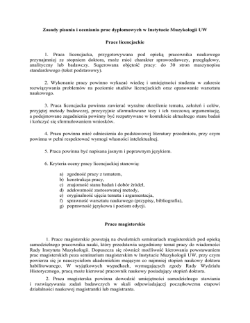 Zasady pisania i oceniania prac dyplomowych w Instytucie Muzykologii UW Prace licencjackie 1. Praca licencjacka, przygotowywana pod opieką pracownika naukowego przynajmniej ze stopniem doktora, może mieć charakter sprawozdawczy, przeglądowy, analityczny lub badawczy. Sugerowana objętość pracy: do 30 stron maszynopisu standardowego (tekst podstawowy). 2. Wykonanie pracy powinno wykazać wiedzę i umiejętności studenta w zakresie rozwiązywania problemów na poziomie studiów licencjackich oraz opanowanie warsztatu naukowego. 3. Praca licencjacka powinna zawierać wyraźne określenie tematu, założeń i celów, przyjętej metody badawczej, precyzyjnie sformułowane tezy i ich rzeczową argumentację, a podejmowane zagadnienia powinny być rozpatrywane w kontekście aktualnego stanu badań i kończyć się sformułowaniem wniosków. 4. Praca powinna mieć odniesienia do podstawowej literatury przedmiotu, przy czym powinna w pełni respektować wymogi własności intelektualnej. 5. Praca powinna być napisana jasnym i poprawnym językiem. 6. Kryteria oceny pracy licencjackiej stanowią: a) b) c) d) e) f) g) zgodność pracy z tematem, konstrukcja pracy, znajomość stanu badań i dobór źródeł, adekwatność zastosowanej metody, oryginalność ujęcia tematu i argumentacja, sprawność warsztatu naukowego (przypisy, bibliografia), poprawność językowa i poziom edycji. Prace magisterskie 1. Prace magisterskie powstają na dwuletnich seminariach magisterskich pod opieką samodzielnego pracownika nauki, który przedstawia uzgodniony temat pracy do wiadomości Rady Instytutu Muzykologii. Dopuszcza się również możliwość kierowania powstawaniem prac magisterskich poza seminarium magisterskim w Instytucie Muzykologii UW, przy czym powierza się je nauczycielom akademickim mającym co najmniej stopień naukowy doktora habilitowanego. W wyjątkowych wypadkach, wymagających zgody Rady Wydziału Historycznego, pracą może kierować pracownik naukowy posiadający stopień doktora. 2. Praca magisterska powinna dowodzić umiejętności samodzielnego stawiania i rozwiązywania zadań badawczych w skali odpowiadającej początkowemu etapowi działalności naukowej magistrantki lub magistranta. 3. Przygotowana praca powinna świadczyć o opanowaniu podstawowych elementów warsztatu naukowego, tj. o dobraniu metody adekwatnej do przedmiotu pracy, poprawnym posługiwaniu się aparatem przypisów, znajomości stanu badań (literatury przedmiotu) w zakresie podjętego tematu, a także o zdolności do pozyskiwania i interpretacji materiału źródłowego. 4. Praca magisterska powinna w pełni respektować wymogi własności intelektualnej przy odwoływaniu się do literatury przedmiotu. 5. Objętość pracy magisterskiej zależy od podjętego tematu badawczego, lecz nie może być w zasadzie mniejsza niż 80 stron znormalizowanego wydruku komputerowego (1800 znaków ze spacjami na stronę) bez aneksów. 6. Warunkiem przyjęcia pracy magisterskiej jest poprawna polszczyzna, logiczny układ zagadnień odzwierciedlony w konstrukcji pracy oraz staranność jej edycji (formatowania, rysunków, transkrypcji itp.). 7. Termin złożenia pracy należy skoordynować z terminem egzaminu magisterskiego, który może się odbyć w ciągu dwóch lat od uzyskania absolutorium. 8. Pracę ocenia promotor i jeden powołany recenzent. Ocena dotyczy zarówno merytorycznej, jak i warsztatowej strony pracy. 9. Kryteria oceny pracy magisterskiej stanowią: a) b) c) d) e) f) g) zgodność pracy z tematem, konstrukcja pracy (układ rozdziałów), znajomość stanu badań i dobór źródeł, adekwatność zastosowanej metody, oryginalność ujęcia tematu (postawionych tez) i argumentacja, sprawność warsztatu naukowego (przypisy, bibliografia), poprawność językowa i poziom edycji.. 10. Szczegółowe wymogi formalne, które winna spełniać praca magisterska, określa Regulamin Studiów na Uniwersytecie Warszawskim. 2