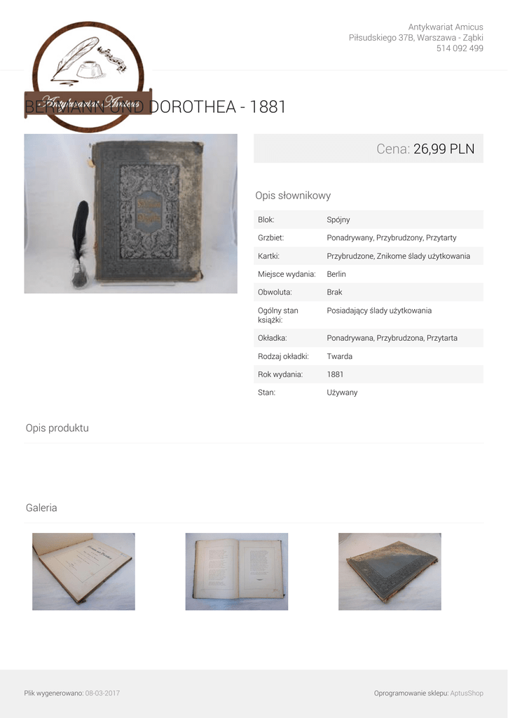 Antykwariat Amicus Piłsudskiego 37B, Warszawa - Ząbki 514 092 499 BERMANN UND DOROTHEA - 1881 Cena: 26,99 PLN Opis słownikowy Blok: Spójny Grzbiet: Ponadrywany, Przybrudzony, Przytarty Kartki: Przybrudzone, Znikome ślady użytkowania Miejsce wydania: Berlin Obwoluta: Brak Ogólny stan książki: Posiadający ślady użytkowania Okładka: Ponadrywana, Przybrudzona, Przytarta Rodzaj okładki: Twarda Rok wydania: 1881 Stan: Używany Opis produktu Galeria Plik wygenerowano: 08-03-2017 Powered by TCPDF (www.tcpdf.org) Oprogramowanie sklepu: AptusShop