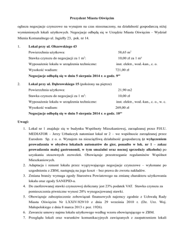 Prezydent Miasta Oświęcim ogłasza negocjacje czynszowe na wynajem na czas nieoznaczony, na działalność gospodarczą niżej wymienionych lokali użytkowych. Negocjacje odbędą się w Urzędzie Miasta Oświęcim – Wydział Mienia Komunalnego ul. Jagiełły 23, pok. nr 14. 1. Lokal przy ul. Olszewskiego 43 Powierzchnia użytkowa: 58,65 m2 Stawka czynszu do negocjacji za 1 m2: 10,00 zł za 1 m² Wyposażenie lokalu w urządzenia techniczne: inst. elektr., wod.-kan., c. o. Wysokość wadium: 721,00 zł Negocjacje odbędą się w dniu 5 sierpnia 2014 r. o godz. 9³º 2. Lokal przy ul. Dąbrowskiego 15 (położony na piętrze) Powierzchnia użytkowa: 21,90 m2 Stawka czynszu do negocjacji za 1 m2: 10,00 zł Wyposażenie lokalu w urządzenia techniczne: inst. elektr., wod.-kan., c. o., w. c. Wysokość wadium: 269,00 zł Negocjacje odbędą się w dniu 5 sierpnia 2014 r. o godz. 10³º Uwagi: 1. Lokal nr 1 znajduje się w budynku Wspólnoty Mieszkaniowej, zarządzanej przez P.H.U. MEDIATOR – Jerzy Urbańczyk natomiast lokal nr 2 – we wspólnocie zarządzanej przez Eurodom Sp. z o. o. Wynajem na nieuciążliwą działalność gospodarczą (z wyłączeniem prowadzenia w obydwu lokalach automatów do gier, ponadto w lok. nr 1 – zakaz prowadzenia małej gastronomii, w tym smażalni oraz nocnej sprzedaży alkoholu) po uzyskaniu stosownych zezwoleń. Obowiązuje przestrzeganie regulaminów Wspólnot Mieszkaniowych. 2. Adaptacja i remont lokalu przez wygrywającego negocjacje czynszowe – wykonane po uzgodnieniu z ZBM, następują na jego koszt – bez prawa do zwrotu nakładów. 3. Zmiana branży wymaga zgody Starostwa Powiatowego na zmianę charakteru użytkowania lokalu oraz zgody SANEPID-u. 4. Do zaoferowanej stawki czynszowej doliczany jest 23% podatek VAT. Stawka czynszu za pomieszczenia piwniczne wynosi 20% wynegocjowanej stawki. 5. Obowiązuje zabezpieczenie zobowiązań finansowych najemcy zgodnie z Uchwałą Rady Miasta Oświęcim Nr LXXIV/829/10 z dnia 29 września 2010 r. (Dz. Urz. Woj. Małopolskiego z dnia 8 marca 2013 r. poz. 1926). 6. Zawarcie umowy najmu lokalu użytkowego według wzoru obowiązującego w ZBM. 7. Przeglądu lokali oraz warunków komunikacyjnych zawiązanych z zaopatrzeniem lokali można dokonać w dniu 25.07.2014 r., w godz. od 10.00 do 12.00, po wcześniejszym uzgodnieniu z ZBM (tel. 33 8424051 lub 33 8422915). 8. Wpłaty wadium w pieniądzu należy dokonać w terminie do dnia 4.08.2014 r. na konto ZBM – nr 12 8136 0000 0031 0037 2000 0010 w Banku Spółdzielczym w Zatorze. Za potwierdzenie wpłaty przyjmuje się datę wpływu wadium na konto ZBM. Wadia wpłacone przez osoby, które nie wygrały negocjacji, będą zwrócone niezwłocznie na konto podane przez uczestnika negocjacji. 9. Regulamin negocjacji czynszowych i zasady pobierania zabezpieczeń gwarancyjnych dostępne są w Wydziale Mienia Komunalnego, ul. Jagiełły 23, pok. 29. 10. Najemcy lokali użytkowych zobowiązani są do zapłaty podatku od lokalu i gruntu. W ciągu 14 dni od zawarcia umowy należy zgłosić ten fakt w Wydziale Podatkowym Urzędu Miasta Oświęcim. 11. Celem wzięcia udziału w negocjacjach czynszowych należy: Złożyć pisemną ofertę w siedzibie Urzędu Miasta Oświęcim, ul. Zaborska 2, pok. nr 1 do dnia 4 sierpnia 2014 r. w zamkniętej kopercie z dopiskiem: Oferta na wynajem lokalu przy ul.............................. (podać adres). Oferta powinna zawierać następujące dane: a) imię i nazwisko oraz adres oferenta i siedzibę, jeżeli oferentem jest osoba prawna, b) datę oferty, c) w przypadku podmiotów gospodarczych – aktualny wypis z właściwego rejestru oraz umowę spółki cywilnej, jeśli taką zawarto. W przypadku nie prowadzenia działalności gospodarczej – oświadczenie o nie prowadzeniu takiej działalności, d) oświadczenie o zapoznaniu się z warunkami negocjacji czynszowych i przyjęciu ich bez zastrzeżeń, e) oświadczenie o nie posiadaniu zaległości wobec Gminy Miasto Oświęcim, f) określenie rodzaju działalności jaką oferent zamierza prowadzić w wynajętym lokalu, g) wysokość proponowanej stawki czynszu, h) podpis oferenta lub jego pełnomocnika (obowiązuje załączenie pełnomocnictwa do oferty), i) potwierdzenie wpłaty wadium. Wszystkie załączniki do oferty powinny być złożone w oryginale lub jako kopie potwierdzone za zgodność z oryginałem przez osobę podpisującą ofertę. 12. Negocjacje przeprowadza się w obecności zainteresowanych. 13. Nie zawarcie umowy w wyznaczonym terminie z winy przyszłego najemcy jest równoznaczne z rezygnacją z lokalu i utratą prawa do zwrotu wadium. 14. Zastrzega się prawo odstąpienia od negocjacji bez podania przyczyn.