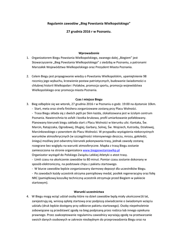 Regulamin zawodów „Bieg Powstania Wielkopolskiego” 27 grudnia 2016 r w Poznaniu. Wprowadzenie 1. Organizatorem Biegu Powstania Wielkopolskiego, zwanego dalej „Biegiem” jest Stowarzyszenie „Bieg Powstania Wielkopolskiego” z siedzibą w Poznaniu, a patronami Marszałek Województwa Wielkopolskiego oraz Prezydent Miasta Poznania. 2. Celem Biegu jest propagowanie wiedzy o Powstaniu Wielkopolskim, upamiętnienie 98 rocznicy jego wybuchu, krzewienie postaw patriotycznych, budowanie świadomości o chlubnej historii Wielkopolan i Polaków, promocja sportu, promocja województwa Wielkopolskiego oraz promocja miasta Poznania. Czas i miejsce Biegu 3. Bieg odbędzie się we wtorek, 27 grudnia 2016 r w Poznaniu o godz. 19:00 na dystansie 10km. - Start, meta oraz strefa finishera zorganizowane zostaną przy Placu Wolności. - Trasa Biegu składa się z dwóch pętli po 5km każda, zlokalizowana jest w ścisłym centrum Poznania. Nawierzchnia to asfalt i kostka brukowa, profil umiarkowanie pofałdowany. Planowany kierunek biegu zakłada start z Placu Wolności w kierunku ulic: Kantaka, Św. Marcin, Ratajczaka, Ogrodowej, Długiej, Garbary, Solnej, Św. Wojciech, Kutrzeby, Działowej, Marcinkowskiego z powrotem do Placu Wolności. W przypadku wystąpienia niekorzystnych warunków atmosferycznych (w szczególności intensywnego deszczu, mrozu, gołoledzi, śniegu) możliwy jest odwrotny kierunek pokonywania trasy, jednak zawody zostaną rozegrane bez względu na warunki atmosferyczne. Mapka z trasą Biegu zostanie zamieszczona na stronie organizatora www.biegpowstaniawlkp.pl Organizator wystąpił do Polskiego Związku Lekkiej Atletyki o atest trasy. - Limit czasu na ukończenie zawodów to 80 minut. Pomiar czasu zostanie dokonany w sposób elektroniczny, na podstawie chipu z pakietu startowego. - W biurze zawodów będzie zorganizowany darmowy depozyt dla uczestników Biegu. - Po zawodach każdy uczestnik otrzyma pamiątkowy medal, posiłek regeneracyjny oraz folię NRC (pamiątkową koszulkę techniczną uczestnik otrzymuje przed Biegiem w pakiecie startowym). Warunki uczestnictwa 4. W Biegu mogą wziąć udział osoby które na dzień zawodów będą miały ukończone16 lat, zarejestrują się, wniosą opłatę startową oraz podpiszą oświadczenie o świadomym wzięciu udziału (druk będzie dostępny przy odbiorze pakietu startowego). Osoby niepełnoletnie zobowiązane są przedstawić zgodę na bieg podpisaną przez rodzica lub innego opiekuna prawnego. Przez zaakceptowanie regulaminu zawodnicy wyrażają zgodę na przetwarzanie swoich danych osobowych w zakresie niezbędnym do przeprowadzenia Biegu oraz na publikację swojego wizerunku w mediach dotyczących Biegu, jak również na wysyłanie informacji o Biegu na podany przy rejestracji adres e-mailowy. Wysokość opłaty startowej jest uzależniona od daty dokonania płatności: - 45zł płatne do 31.10.2016, - 55zł płatne od 01.11.2016 do 30.11.2016r, - 65 zł płatne od 01.12.2016 do 13.12.2016, - 90zł płatne gotówką w dniu zawodów w godz. 12.00-16.00 w biurze zawodów na Pl. Wolności (w tym przypadku organizator nie gwarantuje pełnego pakietu startowego w dniu zawodów- jego uzupełnienie nastąpiłoby w ciągu 4 tygodni od daty zawodów). Numery startowe zostaną przydzielone po zakończeniu rejestracji. Imienne pakiety startowe będzie można odebrać w dzień Biegu w godzinach 10.00-18.00 w biurze zawodów na Placu Wolności. Podczas trwania Biegu numer startowy musi być cały czas widoczny. Uczestnicy są zobowiązani do stosowania się do wskazówek organizatorów i upoważnionych przez nich ochroniarzy, wolontariuszy, harcerzy i innych osób. Osoby nie przestrzegające niniejszego regulaminu mogą zostać zdyskwalifikowane. Ustala się limit uczestników na 1000 osób. Klasyfikacje i nagrody 5. Pamiątkowymi statuetkami nagrodzone zostaną osobno kobiety oraz mężczyźni zajmujący miejsca 1-3 w poszczególnych kategoriach: - open, - 16-30, - 30-40, - 40-50 - 50+. Kategoria open zostanie nagrodzona dodatkowo nagrodami rzeczowymi. Statuetkami nagrodzeni zostaną także uczestnicy: najmłodszy, najstarszy oraz z najlepszym przebraniem powstańczym. - Dodatkową klasyfikacją jest klasyfikacja służb mundurowych (open kobiety, open mężczyźni). Przez służby mundurowe rozumie się: żołnierzy, funkcjonariuszy Policji, Straży Miejskiej, Straży Granicznej, Straży Pożarnej, Służby Celnej oraz Służby Więziennej- zarówno w czynnej służbie jak i w stanie spoczynku. Osoby chcące wziąć udział w klasyfikacji służb mundurowych powinny zaznaczyć taką opcję na etapie rejestracji oraz móc potwierdzić fakt przynależności do danej służby odpowiednim dokumentem przy odbiorze pakietu startowego. Odbiór nagród następuje podczas ceremonii wręczenia nagród bezpośrednio po Biegu. Wyniki będą umieszczone na stronie internetowej organizatora. Spory 6. Ewentualne spory natury sportowej wynikłe podczas zawodów rozpatrzy komisja sędziowska powołana przez organizatora. O fakcie zaistnienia sytuacji spornej należy powiadomić organizatora bezpośrednio po Biegu. W innych sprawach związanych z Biegiem, a nieuregulowanych bezpośrednio w przepisach powszechnie obowiązujących oraz niniejszym regulaminie decyduje organizator.