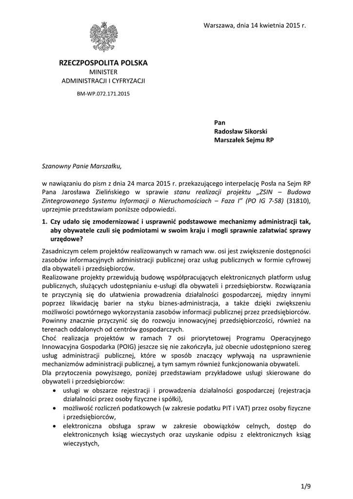 Warszawa, dnia 14 kwietnia 2015 r. RZECZPOSPOLITA POLSKA MINISTER ADMINISTRACJI I CYFRYZACJI BM-WP.072.171.2015 Pan Radosław Sikorski Marszałek Sejmu RP Szanowny Panie Marszałku, w nawiązaniu do pism z dnia 24 marca 2015 r. przekazującego interpelację Posła na Sejm RP Pana Jarosława Zielińskiego w sprawie stanu realizacji projektu „ZSIN – Budowa Zintegrowanego Systemu Informacji o Nieruchomościach – Faza I” (PO IG 7-58) (31810), uprzejmie przedstawiam poniższe odpowiedzi. 1. Czy udało się zmodernizować i usprawnić podstawowe mechanizmy administracji tak, aby obywatele czuli się podmiotami w swoim kraju i mogli sprawnie załatwiać sprawy urzędowe? Zasadniczym celem projektów realizowanych w ramach ww. osi jest zwiększenie dostępności zasobów informacyjnych administracji publicznej oraz usług publicznych w formie cyfrowej dla obywateli i przedsiębiorców. Realizowane projekty przewidują budowę współpracujących elektronicznych platform usług publicznych, służących udostępnianiu e-usługi dla obywateli i przedsiębiorstw. Rozwiązania te przyczynią się do ułatwienia prowadzenia działalności gospodarczej, między innymi poprzez likwidację barier na styku biznes-administracja, a także dzięki zwiększeniu możliwości powtórnego wykorzystania zasobów informacji publicznej przez przedsiębiorców. Powinny znacznie przyczynić się do rozwoju innowacyjnej przedsiębiorczości, również na terenach oddalonych od centrów gospodarczych. Choć realizacja projektów w ramach 7 osi priorytetowej Programu Operacyjnego Innowacyjna Gospodarka (POIG) jeszcze się nie zakończyła, już obecnie udostępniono szereg usług administracji publicznej, które w sposób znaczący wpływają na usprawnienie mechanizmów administracji publicznej, a tym samym również funkcjonowania obywateli. Dla przytoczenia powyższego, poniżej przedstawiam przykładowe usługi skierowane do obywateli i przedsiębiorców: usługi w obszarze rejestracji i prowadzenia działalności gospodarczej (rejestracja działalności przez osoby fizyczne i spółki), możliwość rozliczeń podatkowych (w zakresie podatku PIT i VAT) przez osoby fizyczne i przedsiębiorców, elektroniczna obsługa spraw w zakresie obowiązków celnych, dostęp do elektronicznych ksiąg wieczystych oraz uzyskanie odpisu z elektronicznych ksiąg wieczystych, 1/9 dostęp on-line do wszystkich danych zapisanych na kontach w ZUS (w tym danych zarejestrowanych na koncie emerytalnym, informacji o ubezpieczeniach, świadczeniach i płatnościach), realizacja obowiązków sprawozdawczych przez przedsiębiorców drogą elektroniczną. O faktycznej zmianie jakościowej w sposobie załatwiania spraw urzędowych świadczyć mogą statystyki dotyczące wykorzystania części z ww. usług: ok. 62 mln formularzy podatkowych złożonych drogą elektroniczną, ponad 940 tys. profili założonych na Platformie Usług Elektronicznych Zakładu Ubezpieczeń Społecznych (PUE ZUS), ponad 770 tys. dokumentów ubezpieczeniowych wysłanych za pomocą aplikacji ePłatnik, ponad 180 mln wglądów w księgi wieczyste, z czego niemal 41 mln tylko w 2014 r. Powyższe usługi są przykładowymi efektami realizacji wskazanych projektów i nie wyczerpują całego zakresu efektów realizacji 7 osi priorytetowej POIG. Niemniej już tak nieliczne przykłady wskazują na rzeczywiste zmiany w zakresie administracji publicznej i sposobu załatwiania spraw zarówno przez obywateli jak i przedsiębiorców. Należy jednakże podkreślić, iż wiele projektów jest jeszcze w fazie realizacji, w związku z czym wiele z planowanych do realizacji usług, zwiększających spektrum spraw, które obywatele będą mogli załatwić droga elektroniczną, ulegnie dalszemu, istotnemu poszerzeniu. 2. Czy duże dotacje UE i środki budżetowe udało się efektywnie i racjonalnie wykorzystać, a Polska uzyskała w efekcie jakąś trwałą wartość, która będzie służyć obecnym i przyszłym pokoleniom? Wszelkie wydatki ponoszone w ramach POIG, a w szczególności w zakresie 7 osi POIG, podlegają wnikliwej analizie. Sprawdzane są zarówno na etapie oceny propozycji projektów, jak i już w trakcie realizacji, na poziomie konkretnych faktur. Weryfikacja obejmuje – zgodnie z obowiązującymi procedurami – zarówno sprawdzenie pod kątem efektywności i racjonalności ponoszonych wydatków, jak i ich zasadności. Należy również wskazać, że beneficjenci POIG zobowiązani są do zapewnienia konkurencyjności przy wyborze wykonawców i dostawców, co w przypadku instytucji publicznych oznacza najczęściej konieczność ponoszenia wydatków w trybach przewidzianych ustawą Prawo zamówień publicznych. Niezależnie od opisanych powyżej mechanizmów formalnej weryfikacji wydatkowania środków, należy wskazać, że już obecnie widoczne są rezultaty realizacji projektów. Na zasadność realizacji projektów i ponoszonych w związku z nimi wydatków wskazują m.in. poniżej wskazane przykładowe efekty już osiągnięte w projektach 7 osi POIG: E-deklaracje – w 2014 r. złożono ok. 22 mln dokumentów w postaci elektronicznej, w 2014 r. ponad 5 mln podatników złożyło deklaracje przez Internet, Informatyzacja wydziałów ksiąg wieczystych - udostępniono ponad 20 mln ksiąg wieczystych w formie elektronicznej, Centralna Ewidencja i Informacja o Działalności Gospodarczej – ok. 5,5 mln złożonych wniosków, System Informatyczny Statystyki Publicznej – prawie 100% sprawozdań przekazywanych jest przez Internet, e-PUAP 2 – założono ponad 350 tys. profili zaufanych, 2/9 Platforma Usług Elektronicznych dla klientów ZUS – liczba założonych profili na PUE ponad 940 tys., Geoportal 2 - ponad 470 tys. stałych użytkowników, ponad 700 tysięcy miesięcznie wejść użytkowników do serwisu Geoportal. Powyższe działania wpływają na poprawę jakości życia obywateli, jak również prowadzenia działalności gospodarczej przez przedsi