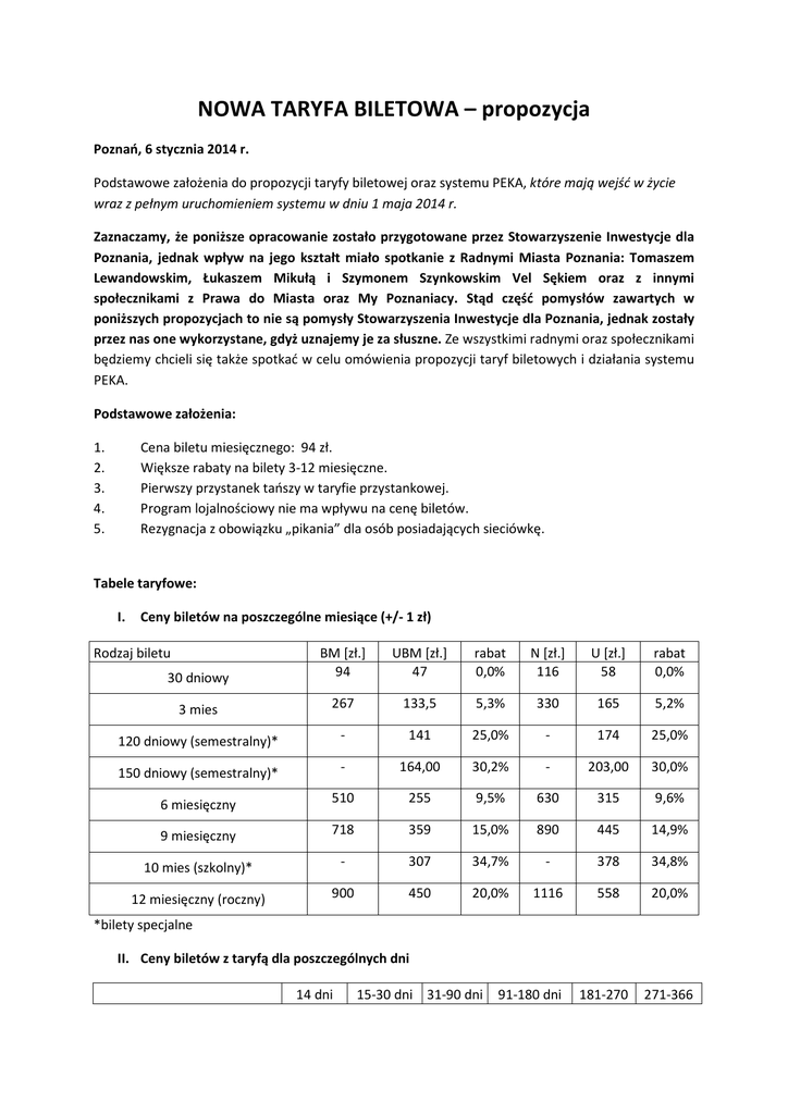 NOWA TARYFA BILETOWA – propozycja Poznań, 6 stycznia 2014 r. Podstawowe założenia do propozycji taryfy biletowej oraz systemu PEKA, które mają wejść w życie wraz z pełnym uruchomieniem systemu w dniu 1 maja 2014 r. Zaznaczamy, że poniższe opracowanie zostało przygotowane przez Stowarzyszenie Inwestycje dla Poznania, jednak wpływ na jego kształt miało spotkanie z Radnymi Miasta Poznania: Tomaszem Lewandowskim, Łukaszem Mikułą i Szymonem Szynkowskim Vel Sękiem oraz z innymi społecznikami z Prawa do Miasta oraz My Poznaniacy. Stąd część pomysłów zawartych w poniższych propozycjach to nie są pomysły Stowarzyszenia Inwestycje dla Poznania, jednak zostały przez nas one wykorzystane, gdyż uznajemy je za słuszne. Ze wszystkimi radnymi oraz społecznikami będziemy chcieli się także spotkać w celu omówienia propozycji taryf biletowych i działania systemu PEKA. Podstawowe założenia: 1. 2. 3. 4. 5. Cena biletu miesięcznego: 94 zł. Większe rabaty na bilety 3-12 miesięczne. Pierwszy przystanek tańszy w taryfie przystankowej. Program lojalnościowy nie ma wpływu na cenę biletów. Rezygnacja z obowiązku „pikania” dla osób posiadających sieciówkę. Tabele taryfowe: I. Ceny biletów na poszczególne miesiące (+/- 1 zł) Rodzaj biletu 30 dniowy BM [zł.] 94 UBM [zł.] 47 rabat 0,0% N [zł.] 116 U [zł.] 58 rabat 0,0% 3 mies 267 133,5 5,3% 330 165 5,2% 120 dniowy (semestralny)* - 141 25,0% - 174 25,0% 150 dniowy (semestralny)* - 164,00 30,2% - 203,00 30,0% 6 miesięczny 510 255 9,5% 630 315 9,6% 9 miesięczny 718 359 15,0% 890 445 14,9% 10 mies (szkolny)* - 307 34,7% - 378 34,8% 12 miesięczny (roczny) 900 450 20,0% 1116 558 20,0% *bilety specjalne II. Ceny biletów z taryfą dla poszczególnych dni 14 dni 15-30 dni 31-90 dni 91-180 dni 181-270 271-366 44,00 zł 3,10 zł 2,90 zł 2,70 zł 93,60 zł 267,60 zł 510,60 zł 2,30 zł 1,90 zł Imienny na sieć strefa A SUMA III. Ceny za każdy przejechany przystanek przy płatności t-portmonetką Nr 1 2 3 4 5 6 7 8 9 10 11 12 13 14 15 16 17 18 19 20 Cena za przystanek [gr.] Cena narastająco [gr.] Normalny Ulgowy Normalny Ulgowy 20 10 20 10 50 25 70 35 50 25 120 60 40 20 160 80 40 20 200 100 30 15 230 115 30 15 260 130 10 5 270 135 10 5 280 140 10 5 290 145 290 145 10 10 10 10 10 6 6 6 6 6 5 5 5 5 5 3 3 3 3 3 300 310 320 330 340 346 352 358 364 370 150 155 160 165 170 173 176 179 182 185 Lub w przedstawieniu analogicznym do tabeli z propozycji ZTM do uchwały RM: Pierwszy Od 2 do 3 Od 4 do 5 Od 6 do 7 Od 8 do 15 Powyżej 15 Uzasadnienie: Normalny [gr.] 20 50 40 30 10 6 Ulgowy [gr.] 10 25 20 15 5 3 717,60 zł 900,00 zł 1. Po ostatnich podwyżkach sprzedaż biletów długookresowych znacząco spadła. W okresie styczeń – maj 2013 r. spadek sprzedaży czasu w tych biletach wyniósł ponad 22%, natomiast w okresie czerwiec – październik 4,6% (czyli w porównaniu do sprzedaży po pierwszej podwyżce z czerwca 2012). Decyzja o podwyżce styczniowej została także podjęta na podstawie fałszywych danych przekazanych przez ZTM, zarówno radnym jak i stronie społecznej oraz mieszkańcom. Co więcej, pomimo podwyżki, zostało wprowadzone ograniczenie w kursowaniu linii tramwajowych – w szczycie popołudniowym kursują one co 12 minut, a nie co 10 minut jak wcześniej. Przypominamy, że m.in. utrzymaniem standardu komunikacji miejskiej tłumaczono wprowadzenie podwyżek. Słowa jednak nie dotrzymano. W związku z tymi faktami za zasadne uznajemy wycofanie się z podwyżki wprowadzonej w styczniu, ale także obniżenie ceny sieciówki miesięcznej do poziomu 94 zł. Byłby to wyraźny sygnał dla mieszkańców, że komunikacja miejska nie ma służyć tylko do łatania dziury w budżecie. Zarazem można zauważyć, że wprowadzenie podwyżek się nie sprawdziło, o czym ostrzegaliśmy już wcześniej (lipiec 2013: http://idp.org.pl/?p=192, a nawet w listopadzie 2011: http://idp.org.pl/?p=121), gdyż liczba pasażerów spada, a i standardu komunikacji nie utrzymano. Pora wybrać drogę, o której mówimy od dłuższego czasu: więcej pasażerów = więcej pieniędzy. Dobrą ceną i wysokim standardem należy zachęcić mieszkańców do komunikacji publicznej, a nie prowadzić działania na ich szkodę lub pogorszenie komfortu podróżowania. 2. W okresie styczeń – październik 2013 sprzedano długookresowych*: Rodzaj biletu Ilość [szt.] 30 dniowy 947 809 3 miesięczny 28 302 120 dniowy (semestralny) 8 843 150 dniowy (semestralny) 13 067 6 miesięczny 2 314 9 miesięczny 655 10 miesięczny (szkolny) 947 Roczny 1 720 Suma 1 003 657 *nie uwzględniono biletu kolejowego i rodzinnego. następujące liczby biletów Procent całości 94,4% 2,8% 0,9% 1,3% 0,2% 0,1% 0,1% 0,2% - Upraszczając zestawienie otrzymujemy: Rodzaj biletu 30 dniowy 3-12 miesięczny Semestralny Ilość [szt.] 947 809 33 938 21 910 Procent całości 94,4% 3,4% 2,2% Dodać należy, że sprzedaż biletów semestralnych jest prowadzona dopiero od sierpnia 2013, więc jest to sprzedaż za miesiące VIII – X. W tym samym czasie sprzedano 10 391 biletów 3-12 miesięcznych. Tak więc, wprowadzenie nowego biletu ze znaczącym rabatem (27,6 % dla biletu 120 dniowego oraz 30,8% dla biletu 150 dniowego) było sporą zachętą dla pasażerów do zakupu tego rodzaju oferty. Ponieważ ZTMowi powinno zależeć, by mieszkańcy kupowali bilety na jak najdłuższy okres czasu, proponujemy zastosowanie tej zależności także do reszty rodzajów biletów zwiększając wartości rabatów wg. poniższej tabeli. Rodzaj biletu 3 miesięczny 120 dniowy (semestralny) 150 dniowy (semestralny) 6 miesięczny 9 miesięczny 10 miesięczny (szkolny) Roczny Rabat 5,3% 25,0% 30,2% 9,5% 15,0% 34,7% 20,0% Bilety semestralne oraz szkolne występują tylko w wersji ulgowej. Należy także zauważyć, że stosunkowo niewielki wzrost sprzedaży sieciówek na okres 3 miesięcy i więcej spowoduje już zwiększenie wpływów z danych rodzajów biletów. Rodzaj biletu 30 dni