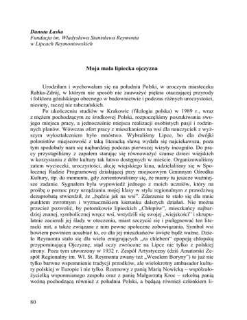 Danuta Łaska Fundacja im. Władysława Stanisława Reymonta w Lipcach Reymontowskich Moja mała lipiecka ojczyzna Urodziłam i wychowałam się na południu Polski, w uroczym miasteczku Rabka-Zdrój, w którym nie sposób nie zauważyć piękna otaczającej przyrody i folkloru góralskiego obecnego w budownictwie i podczas różnych uroczystości, niestety, raczej nie rabczańskich. Po ukończeniu studiów w Krakowie (filologia polska) w 1989 r., wraz z mężem pochodzącym ze środkowej Polski, rozpoczęliśmy poszukiwania swojego miejsca pracy, a jednocześnie miejsca realizacji osobistych pasji i rodzinnych planów. Wówczas ofert pracy z mieszkaniem na wsi dla nauczycieli z wyższym wykształceniem było mnóstwo. Wybraliśmy Lipce, bo dla dwójki polonistów miejscowość z taką literacką sławą wydała się najciekawsza, poza tym spodobały nam się najbardziej podczas pierwszej wizyty incognito. Do pracy przystąpiliśmy z zapałem starając się równoważyć szanse dzieci wiejskich w korzystaniu z dóbr kultury tak łatwo dostępnych w mieście. Organizowaliśmy zatem wycieczki, uroczystości, akcję wiejskiego kina, udzielaliśmy się w Społecznej Radzie Programowej działającej przy miejscowym Gminnym Ośrodku Kultury, itp. do momentu, gdy zorientowaliśmy się, że mamy tu jeszcze ważniejsze zadanie. Sygnałem była wypowiedź jednego z moich uczniów, który na prośbę o pomoc przy urządzaniu mojej klasy w stylu regionalnym z prawdziwą dezaprobatą stwierdził, że „będzie jak na wsi”. Zdarzenie to stało się dla mnie punktem zwrotnym i wyznacznikiem kierunku dalszych działań. Nie można przecież pozwolić, by potomkowie lipieckich „Chłopów”, mieszkańcy najbardziej znanej, symbolicznej wręcz wsi, wstydzili się swojej „wiejskości” i skrupulatnie zacierali jej ślady w otoczeniu, miast szczycić się i pielęgnować ten literacki mit, a także związane z nim pewne społeczne zobowiązania. Symbol wsi bowiem powinien uosabiać to, co dla jej mieszkańców święte bądź ważne. Dzieło Reymonta stało się dla wielu emigrujących „za chlebem” epopeją chłopską przypominającą Ojczyznę, stąd oczy zwrócone na Lipce nie tylko z polskiej strony. Poza tym utworzony w 1932 r. Zespół Artystyczny (dziś Amatorski Zespół Regionalny im. Wł. St. Reymonta zwany też „Weselem Boryny”) to już nie tylko barwne wspomnienie tradycji przodków, ale wielokrotny ambasador kultury polskiej w Europie i nie tylko. Rozmowy z panią Marią Nowicką – współzałożycielką wspomnianego zespołu oraz z panią Małgorzatą Kroc – szkolną panią woźną pochodzącą również z południa Polski, a będącą również członkiem li- 80 pieckiego zespołu, utwierdziły mnie w przekonaniu, że szkoła w tej miejscowości ma do spełnienia szczególną rolę. Uczniom trzeba przecież uświadomić wyjątkowość tej wsi, rozbudzić dumę z literackiej sławy, przekonać do obowiązku pielęgnacji rodzimych tradycji, dorobku ludowej kultury, na której można budować pełną perspektyw przyszłość. Sprawa była pilna, bo już niektórzy wróżyli zespołowi koniec, gdyż młodzież nie garnęła się w jego szeregi tak chętnie jak niegdyś, zaś wielu naszych absolwentów marzyło o ułożeniu sobie dalszego życia poza swoją miejscowością. Moim pierwszym, wydaje mi się ważnym działaniem na tej niwie, było utworzenie i prowadzenie od 1996 r. klasy autorskiej o profilu folklorystycznym. Jej program był poszerzony na każdym etapie o treści związane z poznawanym regionem. Była to historia, charakterystyczna flora i fauna, język, strój, legendy, tańce itp. Klasa IV poznawała w ten sposób swój łowicki folklor, w klasie V pracowała nad folklorem góralskim, natomiast zaplanowane dla klasy VI Kaszuby nie zostały zrealizowane, ponieważ ze względów oszczędnościowych zdecydowano o połączeniu w naszej szkole dwóch równoległych klas szóstych co łączyło się automatycznie z likwidacją tej jednej z dwu w Polsce klas realizujących program autorski o profilu folklorystycznym. To zdarzenie właśnie spowodowało, że postanowiłam zaangażować się w szerszą działalność społeczną i wystartować w najbliższych wyborach do Rady Gminy, aby mieć realny wpływ na politykę oświatową, i nie tylko, w mojej Reymontowskiej Gminie. Spotkałam się ze zrozumieniem ówczesnego wójta gminy pana Jerzego Kabata, który zaproponował mi członkostwo w Zarządzie Gminy, zostałam też wybrana na przewodniczącą Komisji Rozwoju Gospodarczego i Spraw społecznych, a także przewodniczącą Społecznej Rady Programowej przy Gminnym Ośrodku Kultury Sportu i Rekreacji. W kadencji tej (lata 1998-2002) miał miejsce wyjątkowy dla Lipiec i dla mnie osobiście również Rok 2000, który został przez Sejm Rzeczpospolitej Polskiej przyjęty jako Rok Reymontowski. Wiedząc o tych tak doniosłych dla naszej gminy zamierzeniach już pod koniec 1999 r. rozpoczęliśmy wraz z panem wójtem pracę w Gminnym Komitecie Obchodów Roku Reymontowskiego. Była to wszak wspaniała okazja, by o Reymoncie i Lipcach przypomnieć światu i szansę tą chcieliśmy jak najlepiej wykorzystać. Poza tym ustaliliśmy, że ponieważ pan wójt reprezentował będzie naszą gminę w Ogólnopolskim Komitecie Organizacyjnym Obchodów Roku Reymontowskiego, ja będę pracować i reprezentować naszą gminę także w komitecie wojewódzkim. Dzięki zapałowi wielu, bogatemu kalendarzowi imprez, Reymont i Lipce cieszyły się niesłabnącym zainteresowaniem zarówno w kraju, jak i poza jego granicami. Owocem tegoż roku było również nawiązanie przez ówczesnego wójta gminy i jednocześnie prezesa Fundacji im. Wł. St. Reymonta współpracy z bliźniaczą Fundacją w Kanadzie. Wzajemne wizyty i wymiana doświadczeń zaowocowały organizacją Ogólnopolskiego Konkursu Recytatorskiego „Mówimy Reymontem”, który cieszy się coraz więk- 81 szym zainteresowaniem. To