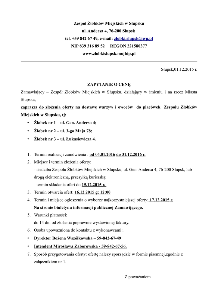 Zespół Żłobków Miejskich w Słupsku ul. Andersa 4, 76-200 Słupsk tel. +59 842 67 49, e-mail: [email protected] NIP 839 316 89 52 REGON 221580377 www.zlobkislupsk.mojbip.pl Słupsk,01.12.2015 r. ZAPYTANIE O CENĘ Zamawiający – Zespół Żłobków Miejskich w Słupsku, działający w imieniu i na rzecz Miasta Słupska, zaprasza do złożenia oferty na dostawę warzyw i owoców do placówek Zespołu Żłobków Miejskich w Słupsku, tj: • Żłobek nr 1 – ul. Gen. Andersa 4; • Żłobek nr 2 – ul. 3-go Maja 78; • Żłobek nr 3 – ul. Łukasiewicza 4. 1. Termin realizacji zamówienia : od 04.01.2016 do 31.12.2016 r. 2. Miejsce i termin złożenia oferty: - siedziba Zespołu Żłobków Miejskich w Słupsku, ul. Gen. Andersa 4, 76-200 Słupsk, lub drogą elektroniczną, przesyłką kurierską; - termin składania ofert do 15.12.2015 r. 3. Termin otwarcia ofert: 16.12.2015 g: 12:00 4. Termin i miejsce ogłoszenia o wyborze najkorzystniejszej oferty: 17.12.2015 r. Na stronie biuletynu informacji publicznej Zamawijącego. 5. Warunki płatności: do 14 dni od złożenia poprawnie wystawionej faktury. 6. Osoba upoważniona do kontaktu z wykonawcami: • Dyrektor Bożena Wszółkowska – 59-842-67-49 • Intendent Mirosława Zaborowska - 59-842-67-56. 7. Sposób przygotowania oferty: ofertę należy sporządzić w formie pisemnej,zgodnie z załącznikiem nr 1. Z poważaniem Słupsk, ...................... ............................................................... pieczęć nagłówkowa wykonawcy Oferta na: Dostawę warzyw i owoców do placówek Zespołu Żłobków Miejskich w Słupsku, tj: • Żłobek nr 1 – ul. Gen. Andersa 4; • Żłobek nr 2 – ul. 3-go Maja 78; • Żłobek nr 3 – ul. Łukasiewicza 4. W odpowiedzi na zapytanie ofertowe w prowadzonym postępowaniu o udzielenie zamówienia na zadanie pn.: "Dostawa warzyw i owoców niniejszym składamy ofertę cenową na wykonanie zamówienia zgodnie z warunakami w nim określonymi. 1. nazwa wykonawcy …............................................................................................................. 2. adres wykonawcy …............................................................................................................... 3. NIP ......................................................................................................................................... 4. Regon …................................................................................................................................. 5. nr rachunku bankowego …..................................................................................................... 6.oferuję wykonanie przedmiotu zamówienia: .......................................................................... 7. oświadczam, że zapoznałem się z opisem przedmiotu zamówienia i nie wnoszę do niego zastrzeżeń. 8. potwierdzam termin realizacji zamówienia do dnia: 31.12.2016 r. 9. Oświadczam/y, że posiadam/y niezbędną wiedzę i doświadczenie oraz dysponujemy potencjałem technicznym i osobami zdolnymi do wykonywania zamówienia oraz znajdujemy się w sytuacji ekonomicznej i finansowej zapewniającej wykonanie zamówienia. 10. wyrażam zgodę na warunki płatności określone w zapytaniu cenowym. 11. akceptuję wzór umowy załączony do zapytania ofertowego. ….............. dnia ….............. …............................................................ podpis osoby upoważnionej Wykonawcy ZAŁĄCZNIK NR 1 DO ZAPYTANIA OFERTOWEGO NA DOSTAWĘ WARZYW I OWOCÓW Nazwa Wykonawcy ........................................................................................................................................................... Zadanie : dostawa warzyw i owoców. L.p. Nazwa towaru Jedn. miar Cena jednostkowa brutto 4 1 2 3 1 Banan kg 2 Burak kg 3 Cebula kg 4 Cytryny kg 5 Jabłka kg 6 Jajka szt 7 Kapusta biała kg 8 Kapusta kiszona kg 9 Kapusta czerwona kg 10 Marchew kg 11 Pietruszka kg 12 Por kg 13 Pomidor kg 14 Ogórek św. kg 15 Ogórek kiszony kg 16 Rzodkiewka szt 17 Seler kg 18 Ziemniaki kg 19 Gruszka kg 20 Kapusta włoska szt 21 Rzodkiew biała kg Wszystkie produkty spożywcze muszą być wysokiej jakości bez uszkodzeń, z okresami ważności odpowiednimi dla danego asortymentu.