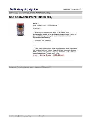 Delikatesy Azjatyckie Utworzono : 08 marzec 2017 SOSY > sosy inne > SOS DO KACZKI PO PEKIŃSKU 383g SOS DO KACZKI PO PEKIŃSKU 383g Model : SOS DO KACZKI PO PEKIŃSKU 383g Producent : Doskonały sos renomowanej firmy LEE KUM KEE, jeden z podstawowych dodatk�w do narodowego dania chińskego - kaczki po pekińsku. Można go wykorzystać także do dań z kurczaka lub wykonanych metodą stir-fry. Producent: LEE KUM KEE � Skład: cukier, pasta sojowa, woda, cukier brązowy, purre pomidorowe, marynowane japońskie morele, pasta sezamowa, olej sojowy, barwnik E150a, skrobia kukurydziana, przyprawy, stabilizator E415, substancja wzmacniająca smak i zapach E631 i E627.� Cena : 12,90 zł Brutto ( 12,90 zł Netto) Dostępność: Produkt dostępny w naszym sklepie od 01 listopad 2013 kontakt : - [email protected] Strona 1
