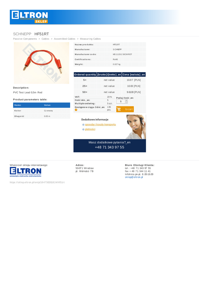 SCHNEPPHF51RT Passi veCom ponents > Cabl es > Assem bl edCabl es > Measur i ngCabl es N a z wa p ro d u ktu : HF51RT M a n u fa c tu rer: S CHNEPP M a n u fa c tu rerc o d e: MS 1115/150CMROT C erti fi c a ti o n s : RoHS Wei g h t: 0.027kg O rderedqua ntity [brutto ] /[netto ] _en Cena [wa luta ] _en Des criptio n: PVCTestLead0,5m Red P ro ductpa ra m eters ta ble: N a m e: Va l u e: Ko lo r Cz erwony D ł ug o ś ć 0.05m 5+ netval ue 10.8 7 [PLN] 25+ netval ue 10.03[PLN] 9.6100[PLN] 50+ netval ue VAT: Ilośćmin._en: M u ltipleord ering : 23% 5 5sz t. Dostępnewciąg u 3d ni_en: 135 pcs. Pod ajIlość_en: + 5 - tocart Maszdodatkowepytania?_en +48713439755 Wł aści ci el skl epui nter netowego: https://skl ep.el tr on.pl /en/p/18 47 502618 24/hf51r t Adres : 50-07 1Wr ocł aw pl .Wol ności 7 B Biuro O bs ługiKlienta : tel .:+48 7 134397 55 fax+48 7 13441141 Infol i ni apn-pt.8 .00-16.00 skl ep@ el tr on.pl