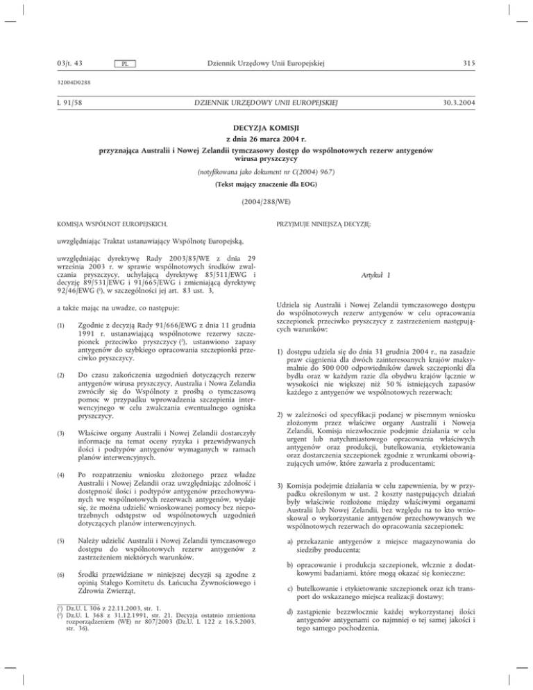 03/t. 43 PL Dziennik Urzędowy Unii Europejskiej 315 32004D0288 L 91/58 30.3.2004 DZIENNIK URZĘDOWY UNII EUROPEJSKIEJ DECYZJA KOMISJI z dnia 26 marca 2004 r. przyznająca Australii i Nowej Zelandii tymczasowy dostęp do wspólnotowych rezerw antygenów wirusa pryszczycy (notyfikowana jako dokument nr C(2004) 967) (Tekst mający znaczenie dla EOG) (2004/288/WE) KOMISJA WSPÓLNOT EUROPEJSKICH, PRZYJMUJE NINIEJSZĄ DECYZJĘ: uwzględniając Traktat ustanawiający Wspólnotę Europejską, uwzględniając dyrektywę Rady 2003/85/WE z dnia 29 września 2003 r. w sprawie wspólnotowych środków zwalczania pryszczycy, uchylającą dyrektywę 85/511/EWG i decyzję 89/531/EWG i 91/665/EWG i zmieniającą dyrektywę 92/46/EWG (1), w szczególności jej art. 83 ust. 3, a także mając na uwadze, co następuje: (1) (2) Zgodnie z decyzją Rady 91/666/EWG z dnia 11 grudnia 1991 r. ustanawiającą wspólnotowe rezerwy szczepionek przeciwko pryszczycy (2), ustanwiono zapasy antygenów do szybkiego opracowania szczepionki przeciwko pryszczycy. Do czasu zakończenia uzgodnień dotyczących rezerw antygenów wirusa pryszczycy, Australia i Nowa Zelandia zwróciły się do Wspólnoty z prośbą o tymczasową pomoc w przypadku wprowadzenia szczepienia interwencyjnego w celu zwalczania ewentualnego ogniska pryszczycy. (3) Właściwe organy Australii i Nowej Zelandii dostarczyły informacje na temat oceny ryzyka i przewidywanych ilości i podtypów antygenów wymaganych w ramach planów interwencyjnych. (4) Po rozpatrzeniu wniosku złożonego przez władze Australii i Nowej Zelandii oraz uwzględniając zdolność i dostępność ilości i podtypów antygenów przechowywanych we wspólnotowych rezerwach antygenów, wydaje się, że można udzielić wnioskowanej pomocy bez niepotrzebnych odstępstw od wspólnotowych uzgodnień dotyczących planów interwencyjnych. (5) Należy udzielić Australii i Nowej Zelandii tymczasowego dostępu do wspólnotowych rezerw antygenów z zastrzeżeniem niektórych warunków. (6) Środki przewidziane w niniejszej decyzji są zgodne z opinią Stałego Komitetu ds. Łańcucha Żywnościowego i Zdrowia Zwierząt, (1) Dz.U. L 306 z 22.11.2003, str. 1. (2) Dz.U. L 368 z 31.12.1991, str. 21. Decyzja ostatnio zmieniona rozporządzeniem (WE) nr 807/2003 (Dz.U. L 122 z 16.5.2003, str. 36). Artykuł 1 Udziela się Australii i Nowej Zelandii tymczasowego dostępu do wspólnotowych rezerw antygenów w celu opracowania szczepionek przeciwko pryszczycy z zastrzeżeniem następujących warunków: 1) dostępu udziela się do dnia 31 grudnia 2004 r., na zasadzie praw ciągnienia dla dwóch zainteresoanych krajów maksymalnie do 500 000 odpowiedników dawek szczepionki dla bydła oraz w każdym razie dla obydwu krajów łącznie w wysokości nie większej niż 50 % istniejących zapasów każdego z antygenów we wspólnotowych rezerwach; 2) w zależności od specyfikacji podanej w pisemnym wniosku złożonym przez właściwe organy Australii i Noweja Zelandii, Komisja niezwłocznie podejmie działania w celu urgent lub natychmiastowego opracowania właściwych antygenów oraz produkcji, butelkowania, etykietowania oraz dostarczenia szczepionek zgodnie z wrunkami obowiązujących umów, które zawarła z producentami; 3) Komisja podejmie działania w celu zapewnienia, by w przypadku określonym w ust. 2 koszty następujących działań były właściwie rozłożone między właściwymi organami Australii lub Nowej Zelandii, bez względu na to kto wnioskował o wykorzystanie antygenów przechowywanych we wspólnotowych rezerwach do opracowania szczepionek: a) przekazanie antygenów z miejsce magazynowania do siedziby producenta; b) opracowanie i produkcja szczepionek, włcznie z dodatkowymi badaniami, które mogą okazać się konieczne; c) butelkowanie i etykietowanie szczepionek oraz ich transport do wskazanego miejsca realizacji dostawy; d) zastąpienie bezzwłocznie każdej wykorzystanej ilości antygenów antygenami co najmniej o tej samej jakości i tego samego pochodzenia. 316 PL Dziennik Urzędowy Unii Europejskiej 03/t. 43 Artykuł 2 Niniejsza decyzja skierowana jest do Państw Członkowskich. Sporządzono w Brukseli, dnia 26 marca 2004 r. W imieniu Komisji David BYRNE Członek Komisji