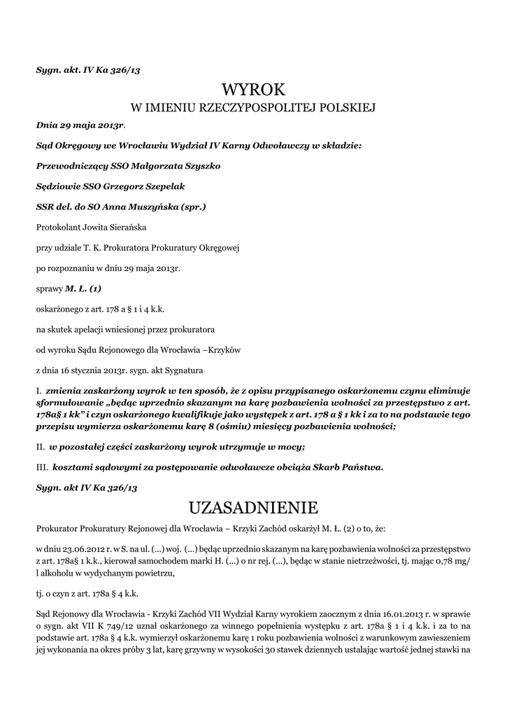Sygn. akt. IV Ka 326/13 WYROK W IMIENIU RZECZYPOSPOLITEJ POLSKIEJ Dnia 29 maja 2013r. Sąd Okręgowy we Wrocławiu Wydział IV Karny Odwoławczy w składzie: Przewodniczący SSO Małgorzata Szyszko Sędziowie SSO Grzegorz Szepelak SSR del. do SO Anna Muszyńska (spr.) Protokolant Jowita Sierańska przy udziale T. K. Prokuratora Prokuratury Okręgowej po rozpoznaniu w dniu 29 maja 2013r. sprawy M. Ł. (1) oskarżonego z art. 178 a § 1 i 4 k.k. na skutek apelacji wniesionej przez prokuratora od wyroku Sądu Rejonowego dla Wrocławia –Krzyków z dnia 16 stycznia 2013r. sygn. akt Sygnatura I. zmienia zaskarżony wyrok w ten sposób, że z opisu przypisanego oskarżonemu czynu eliminuje sformułowanie „będąc uprzednio skazanym na karę pozbawienia wolności za przestępstwo z art. 178a§ 1 kk” i czyn oskarżonego kwalifikuje jako występek z art. 178 a § 1 kk i za to na podstawie tego przepisu wymierza oskarżonemu karę 8 (ośmiu) miesięcy pozbawienia wolności; II. w pozostałej części zaskarżony wyrok utrzymuje w mocy; III. kosztami sądowymi za postępowanie odwoławcze obciąża Skarb Państwa. Sygn. akt IV Ka 326/13 UZASADNIENIE Prokurator Prokuratury Rejonowej dla Wrocławia – Krzyki Zachód oskarżył M. Ł. (2) o to, że: w dniu 23.06.2012 r. w S. na ul. (...) woj. (...) będąc uprzednio skazanym na karę pozbawienia wolności za przestępstwo z art. 178a§ 1 k.k., kierował samochodem marki H. (...) o nr rej. (...), będąc w stanie nietrzeźwości, tj. mając 0,78 mg/ l alkoholu w wydychanym powietrzu, tj. o czyn z art. 178a § 4 k.k. Sąd Rejonowy dla Wrocławia - Krzyki Zachód VII Wydział Karny wyrokiem zaocznym z dnia 16.01.2013 r. w sprawie o sygn. akt VII K 749/12 uznał oskarżonego za winnego popełnienia występku z art. 178a § 1 i 4 k.k. i za to na podstawie art. 178a § 4 k.k. wymierzył oskarżonemu karę 1 roku pozbawienia wolności z warunkowym zawieszeniem jej wykonania na okres próby 3 lat, karę grzywny w wysokości 30 stawek dziennych ustalając wartość jednej stawki na kwotę 10 zł, na podstawie art. 42 § 2 k.k. orzekł zakaz prowadzenia wszelkich pojazdów mechanicznych na okres 3 lat, zaliczył na poczet orzeczonego środka okres zatrzymania prawa jazdy od dnia 23 czerwca 2012 r. do dnia 16 stycznia 2013 r., zasądził na podstawie art. 49 § 2 k.k. świadczenie pieniężne w wysokości 300 zł na rzecz Funduszu Pomocy Pokrzywdzonym i Pomocy Postpenitencjarnej oraz zwolnił oskarżonego od ponoszenia kosztów postępowania. Powyższy wyrok, w części dotyczącej orzeczenia o karze, na niekorzyść oskarżonego zaskarżył prokurator zarzucając rażącą niewspółmierność orzeczonej kary 1 roku pozbawienia wolności z warunkowym zawieszeniem jej wykonania na okres próby 3 lat, nieuzasadnione zastosowanie środka probacyjnego. Odwołując się do zgłoszonego zarzutu prokurator wniósł o zmianę wyroku poprzez wymierzenie oskarżonemu kary 10 miesięcy pozbawienia wolności. Sąd Okręgowy zważył co następuje: Rozważany zarzut apelacji okazał się niezasadny. Sąd meriti przeanalizował zawarty w aktach sprawy materiał dowodowy i na jego podstawie dokonał odpowiednich ustaleń w zakresie stanu faktycznego. Poczynione ustalenia uwzględniają całokształt okoliczności ujawnionych w toku rozprawy głównej. Nie kwestionując ustaleń Sądu meriti dotyczących winy i sprawstwa oskarżonego prokurator stwierdził, że wyrok w części dotyczącej orzeczenia o karze uznać należy za rażąco łagodny. Jako najważniejszą okoliczność wskazującą na wysoki stopień społecznej szkodliwości czynu oskarżonego prokurator wskazał, uprzednie ukaranie oskarżonego wyrokiem Sądu Rejonowego dla Wrocławia Krzyków z dnia 28 grudnia 2009 r. (sygn. akt VII K 1400/09), na mocy którego orzeczono wobec oskarżonego karę 10 miesięcy pozbawienia wolności z warunkowym zawieszeniem jej wykonania, karę grzywny w wysokości 20 stawek dziennych ustalając wartość jednej stawki na kwotę 10 zł, na podstawie art. 42 § 2 k.k. zakaz prowadzenia pojazdów mechanicznych wszelkich kategorii w ruchu lądowym na okres 1 roku. Zdaniem prokuratora oskarżony z faktu uprzedniego skazania nie wyciągnął żadnych wniosków, zatem karą odpowiadającą wymogom prewencji ogólnej i szczególnej jest bezwzględna kara pozbawienia wolności. Rozważając zarzut apelacji zauważyć należy, że w sprawie o sygn. akt VII K 749/12 Sąd meriti wydając orzeczenie wziął pod uwagę uprzednie ukaranie oskarżonego wyrokiem Sądu Rejonowego dla Wrocławia Krzyków z dnia 28 grudnia 2009 r. w sprawie o sygn. akt VII K 1400/09. Tymczasem podkreślić trzeba, że odpowiedzialność na podstawie art. 178a § 4 k.k., ze względu na uprzednie skazanie za przestępstwo określone w art. 178a § 1 k.k. lub wymienione w art. 178a § 4 k.k., sprawca czynu z art. 178a § 1 k.k. ponosi do momentu zatarcia wcześniejszego skazania w myśl zasad ogólnych, określonych przepisami rozdziału XII kodeksu karnego. W niniejszej sprawie już Sąd meriti analizując znamiona przestępstwa z art. 178a § 4 k.k. popełnionego w dniu 23.06.2012 r. zauważył, że w sprawie o sygn. akt VII K 1400/09 wyznaczony oskarżonemu okres próby minął 5 stycznia 2012 r. i do zatarcia skazania pozostało sześć miesięcy. Wyrok w sprawie o sygn. akt VII K 1400/09 uprawomocnił się wszakże 5.01.2010 r., skazany uiścił karę grzywny 25.01.2010 r., a termin środka karnego w postaci zakazu prowadzenia pojazdów mechanicznych wszelkich kategorii w ruchu lądowym na okres 1 roku rozpoczął bieg do wykonania od momentu zatrzymania tj. od 30.08.2009 r. (do 30.08.2010). Przytoczone informacje jednoznacznie wskazują, że w dacie wyrokowania (16.01.2013 r.) przez Sąd meriti nastąpiło już zatarcie skazania za czyn z art. 178a § 1 k.k., o którym mowa w sprawie o sygn. akt VII K 1400/09. Jak trafnie wskazano w postanowieniu Sądu Najwyższego z dnia 21 sierpnia 2012 r., IV KK 59/12 (OSN