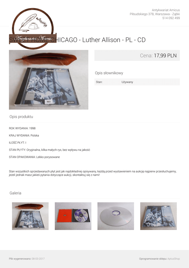 Antykwariat Amicus Piłsudskiego 37B, Warszawa - Ząbki 514 092 499 SWEET HOME CHICAGO - Luther Allison - PL - CD Cena: 17,99 PLN Opis słownikowy Stan: Używany Opis produktu ROK WYDANIA: 1998 KRAJ WYDANIA: Polska ILOŚĆ PŁYT: I STAN PŁYTY: Oryginalna, kilka małych rys, bez wpływu na jakość STAN OPAKOWANIA: Lekko porysowane Stan wszystkich sprzedawanych płyt jest jak najdokładniej opisywany, każdą przed wystawieniem na aukcję najpierw przesłuchujemy, jeżeli jednak masz jakieś pytania dotyczące aukcji, skontaktuj się z nami! Galeria Plik wygenerowano: 08-03-2017 Powered by TCPDF (www.tcpdf.org) Oprogramowanie sklepu: AptusShop