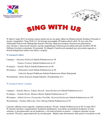 W dniu12 maja 2015 na terenie naszej szkoły już po raz piąty odbył się Międzyszkolny Konkurs Piosenki w Języku Angielskim "Sing With Us" do którego przystąpiło 20 krakowskich szkół. W tym roku Pan Aleksander Palczewski Małopolski Kurator Oświaty objął nasz konkurs honorowym patronatem. Jury złożone z nauczycieli muzyki i języka angielskiego, któremu przewodniczyła pani dyrektor SP 86 Elżbieta Grzybek wysłuchało 36 piosenek. Po długich i burzliwych naradach jury przyznało nagrody w dwóch kategoriach soliści oraz duety i zespoły. W kategorii soliści I miejsce – Zuzanna Drabczyk Szkoła Podstawowa nr 58 Tomasz Froncisz Szkoła Podstawowa nr 25 II miejsce – Natalia Wójcik Szkoła Podstawowa nr 89 III miejsce – Aleksandra Litak Szkoła Podstawowa nr 64 Gabriela Bargieł Publiczna Szkoła Podstawowa Sióstr Salezjanek Wyróżnienie: Alona Kolisnyk Zespół Szkolno -Przedszkolny nr 3 W kategorii duety i zespoły I miejsce – Kamila Marzec, Łukasz Steczek, Anna Kucharczyk Szkoła Podstawowa nr 2 II miejsce – Natalia Rosek, Mateusz Bżykot Szkoła Podstawowa nr 27 III miejsce - Jakub Litwora, Przemysław Pawlitko, Krzysztof Zachwieja Szkoła Podstawowa nr 159 Wyróżnienie : Paulina Milewska, Piotr Düring Szkoła Podstawowa nr 92 Laureaci odbiorą swoje nagrody i dyplomy podczas Święta Szkoły Podstawowej nr 86 22 maja 2015. W imieniu dyrekcji i organizatorów konkursu dziękujemy wszystkim uczestnikom konkursu za trud włożony w przygotowanie się do konkursu a ich nauczycielom za pomoc i wsparcie okazane swoim uczniom. Wszyscy zaprezentowali się rewelacyjnie. Będzie nam niezmiernie miło gościć wszyskich za rok.