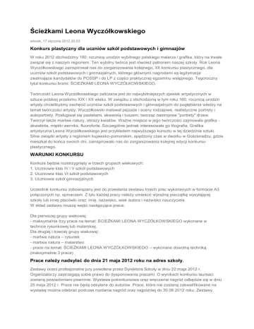 Ścieżkami Leona Wyczółkowskiego wtorek, 17 stycznia 2012 20:53 Konkurs plastyczny dla uczniów szkół podstawowych i gimnazjów W roku 2012 obchodzimy 160. rocznicę urodzin wybitnego polskiego malarza i grafika, który na trwałe związał się z naszym regionem. Ten wybitny twórca jest również patronem naszej szkoły. Rok Leona Wyczółkowskiego zainspirował nas do zorganizowania kolejnego, XII konkursu plastycznego, dla uczniów szkół podstawowych i gimnazjalnych, którego głównymi nagrodami są legitymacje zwalniające kandydatów do POSSP i do LP z części praktycznej egzaminu wstępnego. Tegoroczny tytuł konkursu brzmi: ŚCIEŻKAMI LEONA WYCZÓŁKOWSKIEGO. Twórczość Leona Wyczółkowskiego zaliczana jest do najwybitniejszych zjawisk artystycznych w sztuce polskiej przełomu XIX i XX wieku. W związku z obchodzoną w tym roku 160. rocznicą urodzin artysty chcielibyśmy zachęcić uczniów szkół podstawowych i gimnazjalnych do pogłębiania wiedzy na temat twórczości artysty. Wyczółkowski malował pejzaże i sceny rodzajowe, realistyczne portrety i autoportrety. Posługiwał się pastelami, akwarelą i tuszem, tworząc nastrojowe "portrety" drzew. Tworzył także martwe natury, obrazy kwiatów. Ważne miejsce w jego twórczości zajmowała grafika akwatinta, miękki werniks, fluoroforta. Szczególnie jednak interesowała go litografia. Grafika artystyczna Leona Wyczółkowskiego jest przykładem najwyższego kunsztu w tej dziedzinie sztuki. Silne związki artysty z regionem kujawsko-pomorskim, spędzony czas w dworku w Gościeradzu, gdzie mieszkał do końca swoich dni, zainspirowało nas do zorganizowania kolejnej edycji konkursu plastycznego. WARUNKI KONKURSU Konkurs będzie rozstrzygnięty w trzech grupach wiekowych: 1. Uczniowie klas IV i V szkół podstawowych 2. Uczniowie klas VI szkół podstawowych 3. Uczniowie szkół gimnazjalnych Uczestnik konkursu zobowiązany jest do przesłania zestawu trzech prac wykonanych w formacie A3 połączonych np. spinaczem. Z tyłu każdej pracy należy umieścić wyraźną pieczątkę wysyłającej szkoły lub innej placówki oraz: imię, nazwisko, wiek autora i nazwisko nauczyciela. W skład zestawu muszą wejść następujące prace: Dla pierwszej grupy wiekowej: - maksymalnie trzy prace na temat: ŚCIEŻKAMI LEONA WYCZÓŁKOWSKIEGO wykonane w technice rysunkowej lub malarskiej. Dla drugiej i trzeciej grupy wiekowej: - martwa natura – rysunek - martwa natura – malarstwo - prace na temat: ŚCIEŻKAMI LEONA WYCZÓŁKOWSKIEGO – wykonane dowolną techniką (maksymalnie 3 prace) Prace należy nadsyłać do dnia 21 maja 2012 roku na adres szkoły. Zestawy oceni profesjonalne jury powołane przez Dyrektora Szkoły w dniu 22 maja 2012 r. Organizatorzy zastrzegają sobie prawo do dysponowania pracami. O wynikach konkursu laureaci zostaną powiadomieni pisemnie. Wystawa pokonkursowa oraz wręczenie nagród odbędzie się w dniu 25 maja 2012 r. Prace nie będą odsyłane do autorów. Prace, które nie zostaną zakwalifikowane na wystawę można odebrać podczas rozdania nagród oraz najpóźniej do 30.06.2012 roku. Zestawy, które nie spełniają wymogów regulaminu i nie zawierają wszystkich informacji, nie będą oceniane przez komisję konkursową. NAGRODY Główną nagrodą dla uczniów klas VI (druga kategoria) oraz dla uczniów ze szkół gimnazjalnych (trzecia kategoria) jest zwolnienie z egzaminów praktycznych do odpowiednio: Państwowej Ogólnokształcącej Szkoły Sztuk Pięknych (na podbudowie szkoły podstawowej) lub Państwowego Liceum Plastycznego (na podbudowie gimnazjum). W naszym konkursie dla uczniów wyróżniających się z klas IV i V (pierwsza kategoria) zostaną wręczone zaproszenia na jednodniowe warsztaty z rysunku i malarstwa, które odbędą się w czerwcu, a prowadzone będą przez artystów plastyków z naszej szkoły. Wręczenie nagród nastąpi w gmachu szkoły, podczas wernisażu wystawy prac nadesłanych na konkurs. Informacji o wynikach konkursu oraz terminie wystawy udzielać będzie sekretariat szkoły. tel. 052 –322 –17–12