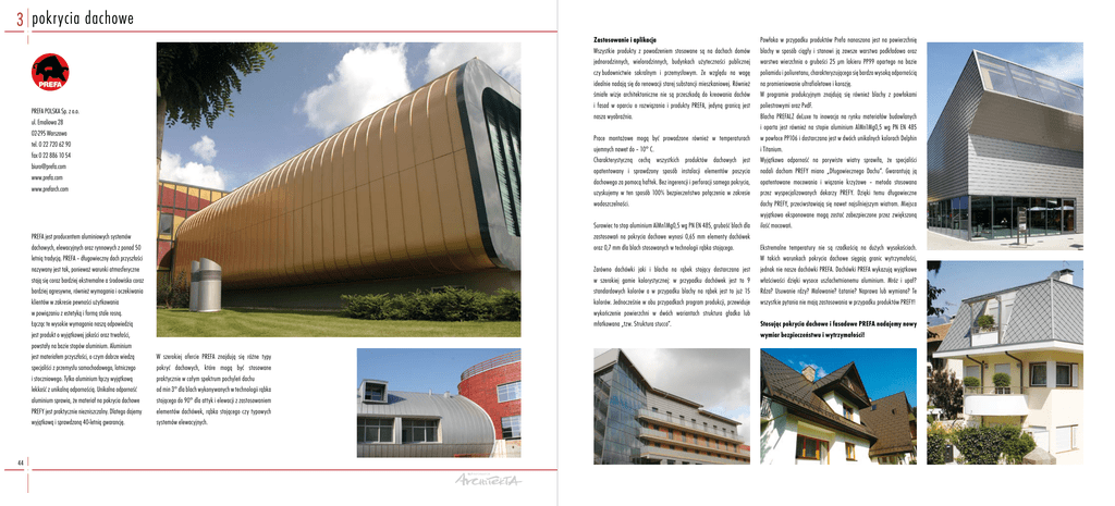 3 pokrycia dachowe Zastosowanie i aplikacja Wszystkie produkty z powodzeniem stosowane są na dachach domów jednorodzinnych, wielorodzinnych, budynkach użyteczności publicznej czy budownictwie sakralnym i przemysłowym. Ze względu na wagę idealnie nadają się do renowacji starej substancji mieszkaniowej. Również śmiałe wizje architektoniczne nie są przeszkodą do kreowania dachów i fasad w oparciu o rozwiązania i produkty PREFA, jedyną granicą jest nasza wyobraźnia. PREFA Polska Sp. z o.o. ul. Emaliowa 28 02-295 Warszawa tel. 0 22 720 62 90 fax 0 22 886 10 54 [email protected] www.prefa.com www.prefarch.com PREFA jest producentem aluminiowych systemów dachowych, elewacyjnych oraz rynnowych z ponad 50 letnią tradycją. PREFA – długowieczny dach przyszłości nazywany jest tak, ponieważ warunki atmosferyczne stają się coraz bardziej ekstremalne a środowisko coraz bardziej agresywne, również wymagania i oczekiwania klientów w zakresie pewności użytkowania w powiązaniu z estetyką i formą stale rosną. Łącząc te wysokie wymagania naszą odpowiedzią jest produkt o wyjątkowej jakości oraz trwałości, powstały na bazie stopów aluminium. Aluminium jest materiałem przyszłości, o czym dobrze wiedzą specjaliści z przemysłu samochodowego, lotniczego i stoczniowego. Tylko aluminium łączy wyjątkową lekkość z unikalną odpornością. Unikalna odporność aluminium sprawia, że materiał na pokrycia dachowe PREFY jest praktycznie niezniszczalny. Dlatego dajemy wyjątkową i sprawdzoną 40-letnią gwarancję. 44 Prace montażowe mogą być prowadzone również w temperaturach ujemnych nawet do – 10° C. Charakterystyczną cechą wszystkich produktów dachowych jest opatentowany i sprawdzony sposób instalacji elementów poszycia dachowego za pomocą haftek. Bez ingerencji i perforacji samego pokrycia, uzyskujemy w ten sposób 100% bezpieczeństwo połączenia w zakresie wodoszczelności. Surowiec to stop aluminium AlMn1Mg0,5 wg PN EN 485, grubość blach dla zastosowań na pokrycia dachowe wynosi 0,65 mm elementy dachówek oraz 0,7 mm dla blach stosowanych w technologii rąbka stojącego. Zarówno dachówki jaki i blacha na rąbek stojący dostarczana jest w szerokiej gamie kolorystycznej: w przypadku dachówek jest to 9 standardowych kolorów a w przypadku blachy na rąbek jest to już 15 kolorów. Jednocześnie w obu przypadkach program produkcji, przewiduje wykończenie powierzchni w dwóch wariantach struktura gładka lub młotkowana „tzw. Struktura stucco”. W szerokiej ofercie PREFA znajdują się różne typy pokryć dachowych, które mogą być stosowane praktycznie w całym spektrum pochyleń dachu od min 3° dla blach wykonywanych w technologii rąbka stojącego do 90° dla attyk i elewacji z zastosowaniem elementów dachówek, rąbka stojącego czy typowych systemów elewacyjnych. Powłoka w przypadku produktów Prefa nanoszona jest na powierzchnię blachy w sposób ciągły i stanowi ją zawsze warstwa podkładowa oraz warstwa wierzchnia o grubości 25 μm lakieru PP99 opartego na bazie poliamidu i poliuretanu, charakteryzującego się bardzo wysoką odpornością na promieniowanie ultrafioletowe i korozję. W programie produkcyjnym znajdują się również blachy z powłokami poliestrowymi oraz PvdF. Blacha PREFALZ deLuxe to inowacja na rynku materiałów budowlanych i oparta jest również na stopie aluminium AlMn1Mg0,5 wg PN EN 485 w powłoce PP106 i dostarczana jest w dwóch unikalnych kolorach Delphin i Titanium. Wyjątkowa odporność na porywiste wiatry sprawiła, że specjaliści nadali dachom PREFY miano „Długowiecznego Dachu”. Gwarantują ją opatentowane mocowania i wiązanie krzyżowe – metoda stosowana przez wyspecjalizowanych dekarzy PREFY. Dzięki temu długowieczne dachy PREFY, przeciwstawiają się nawet najsilniejszym wiatrom. Miejsca wyjątkowo eksponowane mogą zostać zabezpieczone przez zwiększoną ilość mocowań. Ekstremalne temperatury nie są rzadkością na dużych wysokościach. W takich warunkach pokrycia dachowe sięgają granic wytrzymałości, jednak nie nasze dachówki PREFA. Dachówki PREFA wykazują wyjątkowe właściwości dzięki wysoce uszlachetnionemu aluminium. Mróz i upał? Rdza? Usuwanie rdzy? Malowanie? Łatanie? Naprawa lub wymiana? Te wszystkie pytania nie mają zastosowania w przypadku produktów PREFY! Stosując pokrycia dachowe i fasadowe PREFA nadajemy nowy wymiar bezpieczeństwu i wytrzymałości! Prefa Polska Sp. z o.o. ul. Emaliowa 28, 02-295 Warszawa NIP: 526-275-66-06 tel.: +48 22 720 62 90, fax.: +48 22 886 10 55 , [email protected] www.prefa.com www.prefarch.com