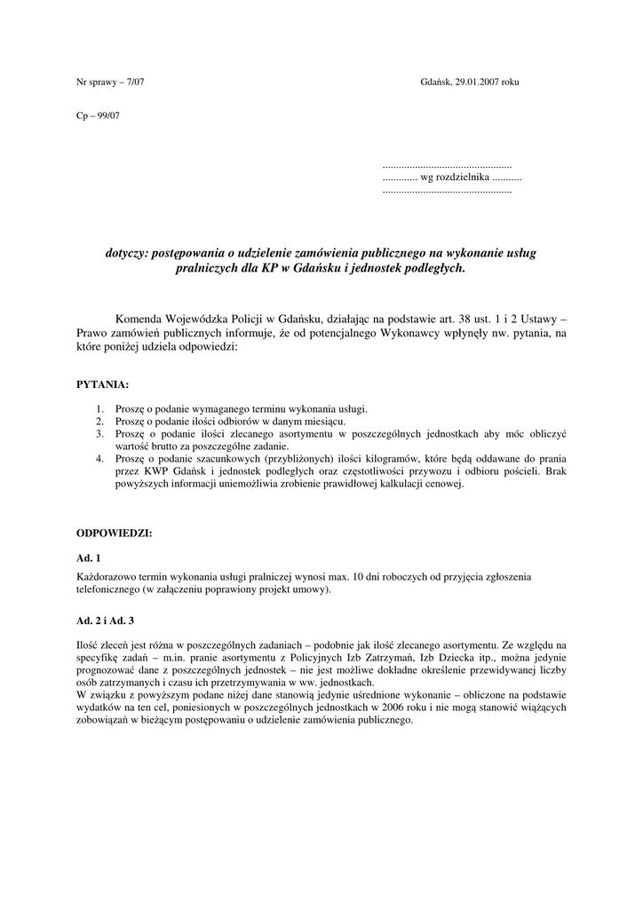 Nr sprawy – 7/07 Gda sk, 29.01.2007 roku Cp – 99/07 ................................................ ............. wg rozdzielnika ........... ................................................ dotyczy: post powania o udzielenie zamówienia publicznego na wykonanie usług pralniczych dla KP w Gda sku i jednostek podległych. Komenda Wojewódzka Policji w Gda sku, działaj c na podstawie art. 38 ust. 1 i 2 Ustawy – Prawo zamówie publicznych informuje, e od potencjalnego Wykonawcy wpłyn ły nw. pytania, na które poni ej udziela odpowiedzi: PYTANIA: 1. 2. 3. 4. Prosz Prosz Prosz warto Prosz przez powy o podanie wymaganego terminu wykonania usługi. o podanie ilo ci odbiorów w danym miesi cu. o podanie ilo ci zlecanego asortymentu w poszczególnych jednostkach aby móc obliczy brutto za poszczególne zadanie. o podanie szacunkowych (przybli onych) ilo ci kilogramów, które b d oddawane do prania KWP Gda sk i jednostek podległych oraz cz stotliwo ci przywozu i odbioru po cieli. Brak szych informacji uniemo liwia zrobienie prawidłowej kalkulacji cenowej. ODPOWIEDZI: Ad. 1 Ka dorazowo termin wykonania usługi pralniczej wynosi max. 10 dni roboczych od przyj cia zgłoszenia telefonicznego (w zał czeniu poprawiony projekt umowy). Ad. 2 i Ad. 3 Ilo zlece jest ró na w poszczególnych zadaniach – podobnie jak ilo zlecanego asortymentu. Ze wzgl du na specyfik zada – m.in. pranie asortymentu z Policyjnych Izb Zatrzyma , Izb Dziecka itp., mo na jedynie prognozowa dane z poszczególnych jednostek – nie jest mo liwe dokładne okre lenie przewidywanej liczby osób zatrzymanych i czasu ich przetrzymywania w ww. jednostkach. W zwi zku z powy szym podane ni ej dane stanowi jedynie u rednione wykonanie – obliczone na podstawie wydatków na ten cel, poniesionych w poszczególnych jednostkach w 2006 roku i nie mog stanowi wi cych zobowi za w bie cym post powaniu o udzielenie zamówienia publicznego. Ad. 4 Zadanie: KWP w Gda sku, KMP w Gda sku, Sopocie i Gdyni: ł cznie ok. 12 tys.kg prania rocznie, liczba zlece w roku - ca 120 razy. Pozostałe zadania: Jednostka KMP w Słupsku KPP w Bytowie KPP w Chojnicach KPP w Człuchowie KPP w Kartuzach KPP w Ko cierzynie KPP w Kwidzynie KPP w L borku KPP w Malborku KPP w Nowym Dworze Gd. KPP w Pucku KPP w Starogardzie Gd. KPP w Tczewie KPP w Wejherowie Roczna waga prania 160 kg 180 kg 70 kg 100 kg 250 kg 115 kg 150 kg 100 kg 180 kg 50 kg 590 kg 65 kg 70 kg 90 kg Ilo zlece w roku 6–8 6 3 4 12 9 6 6 6 6 20 6 3 6 Zamawiaj cy - Komenda Wojewódzka Policji w Gda sku, działaj c na podstawie art. 38 ust. 6 Ustawy – Prawo zamówie publicznych, informuje, e przedłu a: ♦ termin składania ofert – na dzie 02.02.2007r. do godz. 10:50 termin otwarcia ofert – 02.02.2007r. o godz. 11:00. ♦ Pozostałe zapisy specyfikacji pozostaj bez zmian. st. specjalista Sekcji Zamówie Publicznych KWP w Gda sku Ewa Samulak-Augustyn Wyk. w 3 egz. Egz. nr 1 -2- Wykonawcy, którzy pobrali SIWZ, oraz strona: www.pomorska.policja.gov.pl Egz. nr 3- a/a UMOWA Zawarta dnia …………………………….roku pomi dzy Komend Wojewódzk Policji w Gda sku, ul. Okopowa 15, 80 –819 Gda sk, reprezentowan przez: 1. mł. insp. mgr Henryka Szczepa skiego – p.o. Zast pc Pomorskiego Komendanta Wojewódzkiego Policji w Gda sku 2. Olg Sawick - Zast pc Naczelnika Wydziału Finansów KWP w Gda sku zwan dalej Zamawiaj cym a ...................................................................................................................................................... z siedzib w .........................................................przy ulicy........................................................... reprezentowanym przez: 1. .................................................................................................................................. 2. .................................................................................................................................. zwan dalej Wykonawc . §1 1. Zgodnie z wynikiem post powania o zamówienie publiczne nr ........................ w ramach prowadzonej przez siebie działalno ci Wykonawca b dzie wiadczy usługi na rzecz .................................................................................................................................. §2 Zakres usług obejmuje: 1. 2. 3. 4. 5. pranie i maglowanie bielizny po cielowej pranie i maglowanie r czników, obrusów, firan i zasłon pranie koców pranie odzie y ochronnej pranie ubra roboczych olejoodpornych, kombinezonów roboczych, fartuchów ochronnych, kamizelek ocieplanych, koszul flanelowych. 6. prania poduszek §3 Wykonawca zapewnia wykonanie usług b d cych przedmiotem niniejszej umowy zgodnie z zasadami i obowi zuj cymi w tym zakresie przepisami. §4 1. Cena prania wodnego z wyko czeniem oraz czyszczenia chemicznego asortymentu: pranie i maglowanie bielizny po cielowej, r czników, obrusów ........................... zł/1 kg brutto pranie firan i zasłon........................... zł/1 kg brutto pranie koców........................... zł/1 kg brutto pranie odzie y ochronnej........................... zł/1 kg brutto pranie ubra roboczych olejoodpornych, kombinezonów roboczych, fartuchów ochronnych, kamizelek ocieplanych, koszul flanelowych........................... zł/1 kg brutto prania poduszek ............................. zł/1 szt. brutto 2. W cen wliczone s drobne naprawy prze cieradeł, poszew, ubra roboczych. Zmiana cen usług mo e ulec zmianie o wska nik wzrostu cen towarów i usług według GUS, ogłoszonego w MP za miniony rok, na wniosek Wykonawcy. §5 Wykonawca przyjmuje wykonanie usług pralniczych na podstawie telefonicznego zgłoszenia Zamawiaj cego i zapewnia własny bezpłatny transport. Wykonawca zrealizuje usług w terminie 10 dni. §6 1. Umowna warto brutto usług wynosi … … .......................... zł w tym podatek VAT … … … ......% tj.:… … .....................................................… zł. 2
