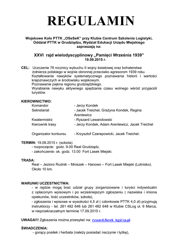 REGULAMIN Wojskowe Koło PTTK „OSeSeK” przy Klubie Centrum Szkolenia Logistyki, Oddział PTTK w Grudziądzu, Wydział Edukacji Urzędu Miejskiego zapraszają na: XXVI rajd wielodyscyplinowy „Pamięci Września 1939” 19.09.2015 r. CEL: Uczczenie 76 rocznicy wybuchu II wojny światowej oraz bohaterstwa Ŝołnierza polskiego w wojnie obronnej przeciwko agresorom 1939 roku. Kształtowanie nawyków systematycznego poznawania historii i wartości krajoznawczych w środowisku wojskowym. Poznawanie piękna regionu grudziądzkiego. Wyrabianie nawyku aktywnego spędzania czasu wolnego wśród przyjaciół turystów. KIEROWNICTWO: Komandor Sekretariat Kwatermistrz Kierownik trasy - Jerzy Kondek - Jacek Treichel, GraŜyna Kondek, Regina Arentewicz - Ryszard Lewandowski - Jerzy Kondek, Adam Arentewicz, Jacek Treichel Organizator konkursu - Krzysztof Czerepowicki, Jacek Treichel. TERMIN: 19.09.2015 r. (sobota) - rozpoczęcie: godz. 9.00 Real Grudziądz, - zakończenie: ok. godz. 13.00 Fort Lasek Miejski. TRASA: Real – Jezioro Rudnik – Mniszek – Hanowo – Fort Lasek Miejski (Lotnisko). Około 10 km. WARUNKI UCZESTNICTWA: - w rajdzie mogą brać udział grupy zorganizowane i turyści indywidualni z opłaconym wpisowym i po wcześniejszym zgłoszeniu ( nazwiska i imiona opiekunów, ilość uczestników, szkoła), - zgłoszenia i wpisowe w wysokości 4,5 zł ( członkowie PTTK 4,0 zł) przyjmują instruktorzy - tel. 261 482 646 lub 261 482 648 w Klubie CSLog ul. 6 Marca, w nieprzekraczalnym terminie 17.09.2015 r. UWAGA!!! Zgłoszenia moŜna przesyłać na: [email protected] ŚWIADCZENIA: - gorący posiłek i herbata (naleŜy posiadać naczynie i łyŜkę), - punkty do Odznaki Turystyki Pieszej, Pucharu Komisji Turystyki Pieszej Oddziału PTTK w Grudziądzu, - dyplomy i upominki dla zwycięzców konkursu, - odcisk okolicznościowej pieczątki. POSTANOWIENIA KOŃCOWE: - uczestnicy ubezpieczają się we własnym zakresie (członkowie PTTK z opłaconą składką są ubezpieczeni przez ZG PTTK), - rajd odbędzie się bez względu na pogodę, - w rajdzie mogą brać udział tylko turyści wcześniej zgłoszeni, - kierownictwo imprezy nie ponosi odpowiedzialności za wypadki i szkody zaistniałe podczas Rajdu, - w razie nie przybycia wpisowego nie zwraca się. UWAGA: Bezwzględnie, wraz z wpisowym, opiekunowie winni dostarczyć listę uczestników imprezy – wymóg ustawowy (moŜe być skserowana lista na potrzeby szkoły). KONKURS: „ POLSKI WRZESIEŃ 1939 ”. RAJD NIE MA CHARAKTERU KOMERCYJNEGO I ORGANIZOWANY JEST NA ZASADACH SAMOFINANSUJĄCYCH SIĘ. WYLICZONA KWOTA WPISOWEGO WYNIKA Z KALKULACJI KOSZTÓW I NIE OBEJMUJE ZYSKÓW. D o z o b a c z e n i a n a t r a s i e. Organizatorzy Nazwa imprezy: (rajd ….) Jednostka organizacyjna, szkoła: Ilość Wpisowe: uczestników: Nazwisko i imię opiekuna (-ów): Ilość opiekunów: Razem:
