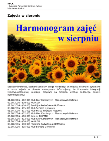 KPCK - Kujawsko Pomorskie Centrum Kultury http://www.kpck.pl Zajęcia w sierpniu Szanowni Państwo, kochani Seniorzy, droga Młodzieży! W związku z licznymi pytaniami o nasze zajęcia w okresie wakacyjnym informujemy, że Pracownia Integracji Międzypokoleniowej realizuje program na sierpień według podanego poniżej harmonogramu: 01.08.2016 02.08.2016 02.08.2016 03.08.2016 03.08.2016 04.08.2016 05.08.2016 08.08.2016 09.08.2016 09.08.2016 10.08.2016 – – – – – – – – – – – (12:00) (10:00) (10:00) (15:00) (11:00) (12:00) (10:00) (12:00) (10:00) (10:00) (15:00) Klub Gier Karcianych i Planszowych Hetman KAKADU Familijne Podwórko u Hoffmana Klub Seniora Uniwerek Klub Pracy Twórczej Pipsztyk Klub Gier Karcianych i Planszowych Hetman Koło nr 18 PTTK Klub Gier Karcianych i Planszowych Hetman KAKADU Familijne Podwórko u Hoffmana Klub Seniora Uniwerek 1/2 KPCK - Kujawsko Pomorskie Centrum Kultury http://www.kpck.pl 10.08.2016 11.08.2016 12.08.2016 16.08.2016 17.08.2016 17.08.2016 18.08.2016 19.08.2016 22.08.2016 23.08.2016 24.08.2016 24.08.2016 25.08.2016 25.08.2016 26.08.2016 29.08.2016 30.08.2016 31.08.2016 – – – – – – – – – – – – – – – – – – (11:00) (12:00) (10:00) (10:00) (15:00) (11:00) (12:00) (10:00) (12:00) (10:00) (15:00) (11:00) (12:00) (13:00) (10:00) (12:00) (10:00) (15:00) Klub Pracy Twórczej Pipsztyk Klub Gier Karcianych i Planszowych Koło nr 18 PTTK KAKADU Klub Seniora Uniwerek Klub Pracy Twórczej Pipsztyk Klub Gier Karcianych i Planszowych Koło nr 18 PTTK Klub Gier Karcianych i Planszowych KAKADU Klub Seniora Uniwerek Klub Pracy Twórczej Pipsztyk Klub Gier Karcianych i Planszowych Zebranie Koła nr 18 PTTK Koło nr 18 PTTK Klub Gier Karcianych i Planszowych KAKADU Klub Seniora Uniwerek Hetman Hetman Hetman Hetman Hetman Metryczka newsu: Opublikował – Julian Waszak, dnia 08.07.2016 Kontakt – [email protected], tel. 52 585 15 01 Facebook – zapraszamy do polubienia PIMu na Facebooku! Kalendarz – zapraszamy do subskrybowania wydarzeń PIMu! Polecamy – portal kulturawzasiegu.pl Zastrzeżenie – treści publikowane na (tej) stronie internetowej przez jej autorów w rozumieniu przepisów ustawy o prawie autorskim i prawach pokrewnych z dnia 4 lutego 1994 r. (t. j. Dz. U. z 2015 r., poz. 1923 z późn. zm.) podlegają ochronie przewidzianej w tej ustawie. 2/2 Powered by TCPDF (www.tcpdf.org)