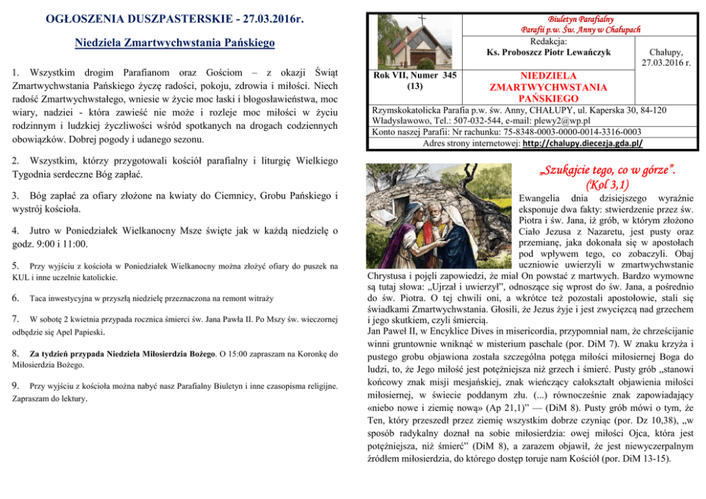 OGŁOSZENIA DUSZPASTERSKIE - 27.03.2016r. Biuletyn Parafialny Parafii p.w. Św. Anny w Chałupach Redakcja: Ks. Proboszcz Piotr Lewańczyk Niedziela Zmartwychwstania Pańskiego 1. Wszystkim drogim Parafianom oraz Gościom – z okazji Świąt Zmartwychwstania Pańskiego życzę radości, pokoju, zdrowia i miłości. Niech radość Zmartwychwstałego, wniesie w życie moc łaski i błogosławieństwa, moc wiary, nadziei - która zawieść nie może i rozleje moc miłości w życiu rodzinnym i ludzkiej życzliwości wśród spotkanych na drogach codziennych obowiązków. Dobrej pogody i udanego sezonu. 2. Wszystkim, którzy przygotowali kościół parafialny i liturgię Wielkiego Tygodnia serdeczne Bóg zapłać. 3. Bóg zapłać za ofiary złożone na kwiaty do Ciemnicy, Grobu Pańskiego i wystrój kościoła. 4. Jutro w Poniedziałek Wielkanocny Msze święte jak w każdą niedzielę o godz. 9:00 i 11:00. 5. Przy wyjściu z kościoła w Poniedziałek Wielkanocny można złożyć ofiary do puszek na KUL i inne uczelnie katolickie. 6. Taca inwestycyjna w przyszłą niedzielę przeznaczona na remont witraży 7. W sobotę 2 kwietnia przypada rocznica śmierci św. Jana Pawła II. Po Mszy św. wieczornej odbędzie się Apel Papieski. 8. Za tydzień przypada Niedziela Miłosierdzia Bożego. O 15:00 zapraszam na Koronkę do Miłosierdzia Bożego. 9. Przy wyjściu z kościoła można nabyć nasz Parafialny Biuletyn i inne czasopisma religijne. Zapraszam do lektury. Rok VII, Numer 345 (13) Chałupy, 27.03.2016 r. NIEDZIELA ZMARTWYCHWSTANIA PAŃSKIEGO Rzymskokatolicka Parafia p.w. św. Anny, CHAŁUPY, ul. Kaperska 30, 84-120 Władysławowo, Tel.: 507-032-544, e-mail: [email protected] Konto naszej Parafii: Nr rachunku: 75-8348-0003-0000-0014-3316-0003 Adres strony internetowej: http://chalupy.diecezja.gda.pl/ „Szukajcie tego, co w górze”. (Kol 3,1) Ewangelia dnia dzisiejszego wyraźnie eksponuje dwa fakty: stwierdzenie przez św. Piotra i św. Jana, iż grób, w którym złożono Ciało Jezusa z Nazaretu, jest pusty oraz przemianę, jaka dokonała się w apostołach pod wpływem tego, co zobaczyli. Obaj uczniowie uwierzyli w zmartwychwstanie Chrystusa i pojęli zapowiedzi, że miał On powstać z martwych. Bardzo wymowne są tutaj słowa: „Ujrzał i uwierzył”, odnoszące się wprost do św. Jana, a pośrednio do św. Piotra. O tej chwili oni, a wkrótce też pozostali apostołowie, stali się świadkami Zmartwychwstania. Głosili, że Jezus żyje i jest zwycięzcą nad grzechem i jego skutkiem, czyli śmiercią. Jan Paweł II, w Encyklice Dives in misericordia, przypomniał nam, że chrześcijanie winni gruntownie wniknąć w misterium paschale (por. DiM 7). W znaku krzyża i pustego grobu objawiona została szczególna potęga miłości miłosiernej Boga do ludzi, to, że Jego miłość jest potężniejsza niż grzech i śmierć. Pusty grób „stanowi końcowy znak misji mesjańskiej, znak wieńczący całokształt objawienia miłości miłosiernej, w świecie poddanym złu. (...) równocześnie znak zapowiadający «niebo nowe i ziemię nową» (Ap 21,1)” — (DiM 8). Pusty grób mówi o tym, że Ten, który przeszedł przez ziemię wszystkim dobrze czyniąc (por. Dz 10,38), „w sposób radykalny doznał na sobie miłosierdzia: owej miłości Ojca, która jest potężniejsza, niż śmierć” (DiM 8), a zarazem objawił, że jest niewyczerpalnym źródłem miłosierdzia, do którego dostęp toruje nam Kościół (por. DiM 13-15). Niedziela Wielkanocna otwiera okres pięćdziesięciu dni, który pierwotnie nazywano Pięćdziesiątnicą, a dziś jest znany jako Okres Wielkanocny. Pierwsze osiem dni tego okresu tworzy oktawę Wielkiej Nocy. Oktawa, czyli osiem dni oznacza, że radość świętowania została przedłużona na ten czas. Nie znamy dokładnej daty powstania oktawy Paschy. Wspomina o niej w IV w. Asteriusz Sofista z Kapadocji. Przypuszcza się jednak, że obchodzono ją znacznie wcześniej, ponieważ Asteriusz nie wprowadza żadnych innowacji, ale raczej opiera się na istniejącej tradycji. Okres oktawy miał szczególne znaczenie dla neokatechumenów, którzy w Wigilię Paschalną przyjęli chrzest (i pozostałe sakramenty wtajemniczenia chrześcijańskiego: bierzmowanie i Eucharystię) i w ten sposób stali się pełnoprawnymi członkami gminy chrześcijańskiej. Tego dnia otrzymali oni białe szaty jako symbol niewinności, wynikającej z przyjęcia chrztu. Przez kolejne siedem dni przychodzili w nich codziennie do kościoła, by uczestniczyć w Najświętszej Eucharystii. Podczas Mszy wygłaszano specjalnie dla nich przygotowane katechezy, w których wyjaśniano nowo ochrzczonym znaczenie znaków i symboli otrzymanych sakramentów. W taki sposób wprowadzano ich w najgłębsze tajemnice wiary chrześcijańskiej. Tak było aż do soboty, w którą składali białe szaty i oddawali je szafarzowi, by mogły służyć także innym. Następnego dnia, w Niedzielę Przewodnią, czyli pierwszą po Wielkanocy, nowo ochrzczeni w Rzymie, ubrani w swoje zwykłe świąteczne odzienie w uroczystej procesji udawali się do kościoła św. Pankracego, by uczestniczyć we Mszy świętej. Z racji koloru szat, jaki nosili nowo ochrzczeni okres oktawy nazywany był także Białym Tygodniem, a niedziela kończąca oktawę – Białą Niedzielą. Obecnie, gdy sakrament chrztu jest udzielany przez cały rok, oktawa Wielkiej Nocy pozornie straciła na znaczeniu. Jednak pod względem liturgicznym jest ona bardzo ważna. Wszystkie dni oktawy posiadają taką samą rangę jak Niedziela Zmartwychwstania, a okres ośmiu dni traktowany jest jak jeden dzień, jako jedno święto, jako dzień najradośniejszy. Wszystkie dni oktawy Wielkanocy traktowane są jako uroczystości, co oznacza, że nie przyjmują one niejako dodatkowych świąt czy wspomnień, jak to jest w przypadku oktawy Bożego Narodzenia. Dlatego też w oktawie Wielkanocy nie obowiązuje post w piątek. Teksty liturgiczne i biblijne w