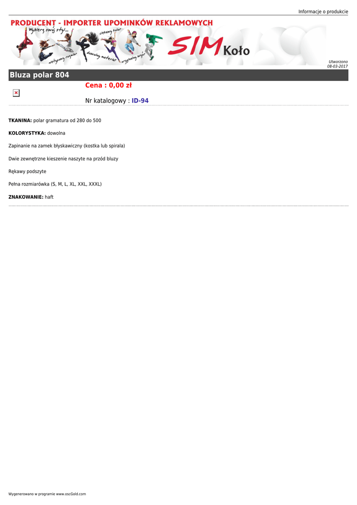 Informacje o produkcie Utworzono 08-03-2017 Bluza polar 804 Cena : 0,00 zł Nr katalogowy : ID-94 TKANINA: polar gramatura od 280 do 500 KOLORYSTYKA: dowolna Zapinanie na zamek błyskawiczny (kostka lub spirala) Dwie zewnętrzne kieszenie naszyte na przód bluzy Rękawy podszyte Pełna rozmiarówka (S, M, L, XL, XXL, XXXL) ZNAKOWANIE: haft Wygenerowano w programie www.oscGold.com