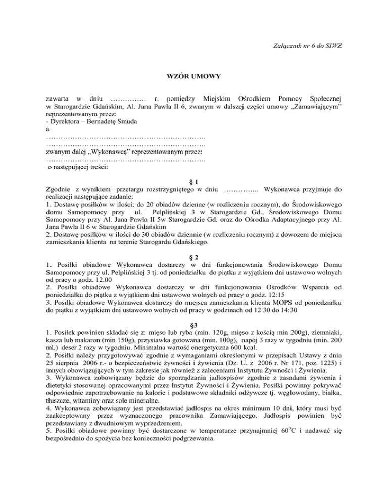 Załącznik nr 6 do SIWZ WZÓR UMOWY zawarta w dniu …………… r. pomiędzy Miejskim Ośrodkiem Pomocy Społecznej w Starogardzie Gdańskim, Al. Jana Pawła II 6, zwanym w dalszej części umowy „Zamawiającym” reprezentowanym przez: - Dyrektora – Bernadetę Smuda a …………………………………………………………. …………………………………………………………. zwanym dalej „Wykonawcą” reprezentowanym przez: …………………………………………………………. o następującej treści: §1 Zgodnie z wynikiem przetargu rozstrzygniętego w dniu …………... Wykonawca przyjmuje do realizacji następujące zadanie: 1. Dostawę posiłków w ilości: do 20 obiadów dzienne (w rozliczeniu rocznym), do Środowiskowego domu Samopomocy przy ul. Pelplińskiej 3 w Starogardzie Gd., Środowiskowego Domu Samopomocy przy Al. Jana Pawła II 5w Starogardzie Gd. oraz do Ośrodka Adaptacyjnego przy Al. Jana Pawła II 6 w Starogardzie Gdańskim 2. Dostawę posiłków w ilości do 30 obiadów dziennie (w rozliczeniu rocznym) z dowozem do miejsca zamieszkania klienta na terenie Starogardu Gdańskiego. §2 1. Posiłki obiadowe Wykonawca dostarczy w dni funkcjonowania Środowiskowego Domu Samopomocy przy ul. Pelplińskiej 3 tj. od poniedziałku do piątku z wyjątkiem dni ustawowo wolnych od pracy o godz. 12.00 2. Posiłki obiadowe Wykonawca dostarczy w dni funkcjonowania Ośrodków Wsparcia od poniedziałku do piątku z wyjątkiem dni ustawowo wolnych od pracy o godz. 12:15 3. Posiłki obiadowe Wykonawca dostarczy do miejsca zamieszkania klienta MOPS od poniedziałku do piątku z wyjątkiem dni ustawowo wolnych od pracy w godzinach od 12:30 do 14:30 §3 1. Posiłek powinien składać się z: mięso lub ryba (min. 120g, mięso z kością min 200g), ziemniaki, kasza lub makaron (min 150g), przystawka gotowana (min. 100g), napój 3 razy w tygodniu (min. 200 ml.) deser 2 razy w tygodniu. Minimalna wartość energetyczna 600 kcal. 2. Posiłki należy przygotowywać zgodnie z wymaganiami określonymi w przepisach Ustawy z dnia 25 sierpnia 2006 r.- o bezpieczeństwie żywności i żywienia (Dz. U. z 2006 r. Nr 171, poz. 1225) i innych obowiązujących w tym zakresie jak również z zaleceniami Instytutu Żywności i Żywienia. 3. Wykonawca zobowiązany będzie do sporządzania jadłospisów zgodnie z zasadami żywienia i dietetyki stosowanej opracowanymi przez Instytut Żywności i Żywienia. Posiłki powinny pokrywać odpowiednie zapotrzebowanie na kalorie i podstawowe składniki odżywcze tj. węglowodany, białka, tłuszcze, witaminy oraz sole mineralne. 4. Wykonawca zobowiązany jest przedstawiać jadłospis na okres minimum 10 dni, który musi być zaakceptowany przez wyznaczonego pracownika Zamawiającego. Jadłospis powinien być przedstawiany z dwudniowym wyprzedzeniem. 5. Posiłki obiadowe powinny być dostarczone w temperaturze przynajmniej 600C i nadawać się bezpośrednio do spożycia bez konieczności podgrzewania. §4 1. Wykonawca musi prowadzić ewidencję ilościowo - wartościową posiłków. Zamawiający zastrzega sobie prawo do wglądu do tej ewidencji przez osobę wytypowaną przez Zamawiającego do tego celu. 2. Zamawiający do ostatniego dnia każdego miesiąca przekaże wykonawcy grafik uwzględniający miejsce i ilość dostarczanych posiłków na kolejny miesiąc. 3. Wszelkie zmiany w grafiku Zamawiający będzie zgłaszał Wykonawcy bez zbędnej zwłoki jednak nie później niż jeden dzień przed wprowadzeniem zmian. §5 1. Rozliczenia finansowe z Wykonawcą będą odbywały się w miesięcznych okresach rozliczeniowych (po zakończeniu miesiąca kalendarzowego jednak nie później niż do 6 dnia następnego miesiąca) na podstawie rozliczeń dostarczonych posiłków. 2. Wypłata za wykonaną usługę, będzie następowała po upływie każdego miesiąca, w terminie do 14 dni od daty otrzymania prawidłowo wystawionej faktury od Wykonawcy, przelewem na jego konto bankowe. §6 Wykonawca zapewnia transport, własne termosy, w terenie- pojemniki jednorazowe utrzymujące ciepło i kosze do przewozu posiłków oraz ich mycie i dezynfekcję. §7 Umowę zawiera się na czas określony tj. od 02.01.2013 r. do 31.12.2013 r. §8 W trakcie obowiązywania umowy dopuszcza się możliwość zmiany ilości zamówionych posiłków. §9 Za wykonanie przedmiotu umowy o którym mowa w § 1 i 2 Zamawiający zapłaci Wykonawcy następujące kwoty: 1) za 1 posiłek obiadowy dostarczony do Środowiskowego Domu Samopomocy przy ul. Pelplińskiej 3, Środowiskowego Domu Samopomocy przy Al. Jana Pawła II 5 i Ośrodka Adaptacyjnego przy Al. Jana Pawła II 6A cenę brutto: …………………………………… (słownie: ………………………...) 2) za 1 posiłek obiadowy dostarczony do miejsca zamieszkania klienta MOPS za cenę brutto: …………………………………… (słownie: …………………………) Podstawą ustalenia ceny za okres miesiąca jest ilość wydanych posiłków pomnożona przez cenę za 1 posiłek. § 10 1. Wykonawca zobowiązuje się realizować zadanie z należytą dbałością. § 11 13. Nadzór nad jakością, ilością i przestrzeganiem obowiązujących norm odnośnie wydawanych posiłków sprawować będzie wyznaczony pracownik Zamawiającego. 14. Zamawiający zastrzega sobie prawo do wglądu do dokumentacji źródłowej np.: faktur zakupu, kartotek magazynowych itp. 15 .Zakwestionowane przez pracownika Zamawiającego posiłki pod względem ilości i jakości podlegają wymianie na koszt Wykonawcy. 2.W przypadku stwierdzenia nieprawidłowości w realizacji przedmiotu umowy Zamawiający może: - zażądać usunięcia w wyznaczonym terminie stwierdzonych nieprawidłowości - rozwiązać niniejszą umowę ze skutkiem natychmiastowym. § 12 Każdej ze stron przysługuje prawo wypowiedzenia umowy w formie pisemnej z zachowaniem jednomiesięcznego okresu wypowiedzenia. § 13 1. Wykonawca ponosi odpo